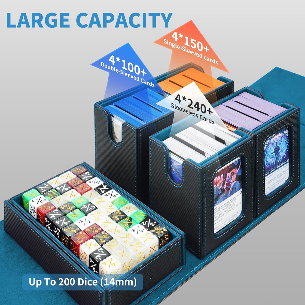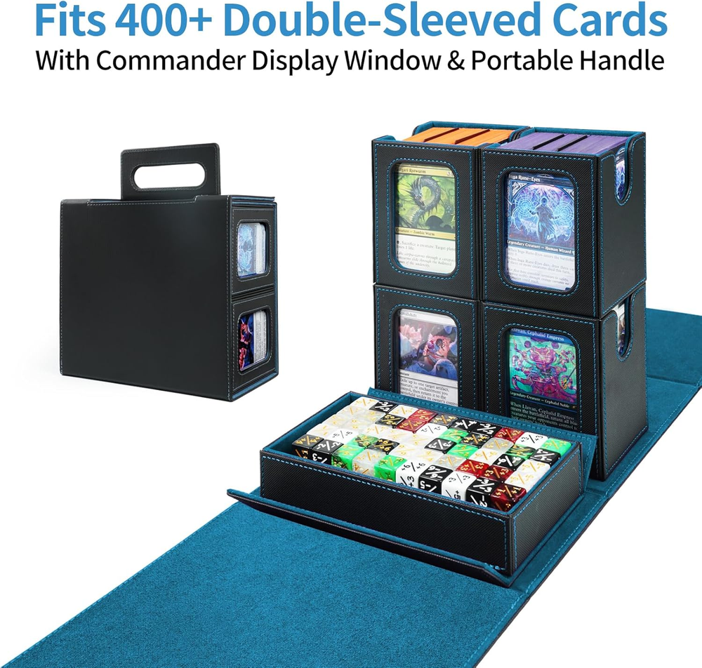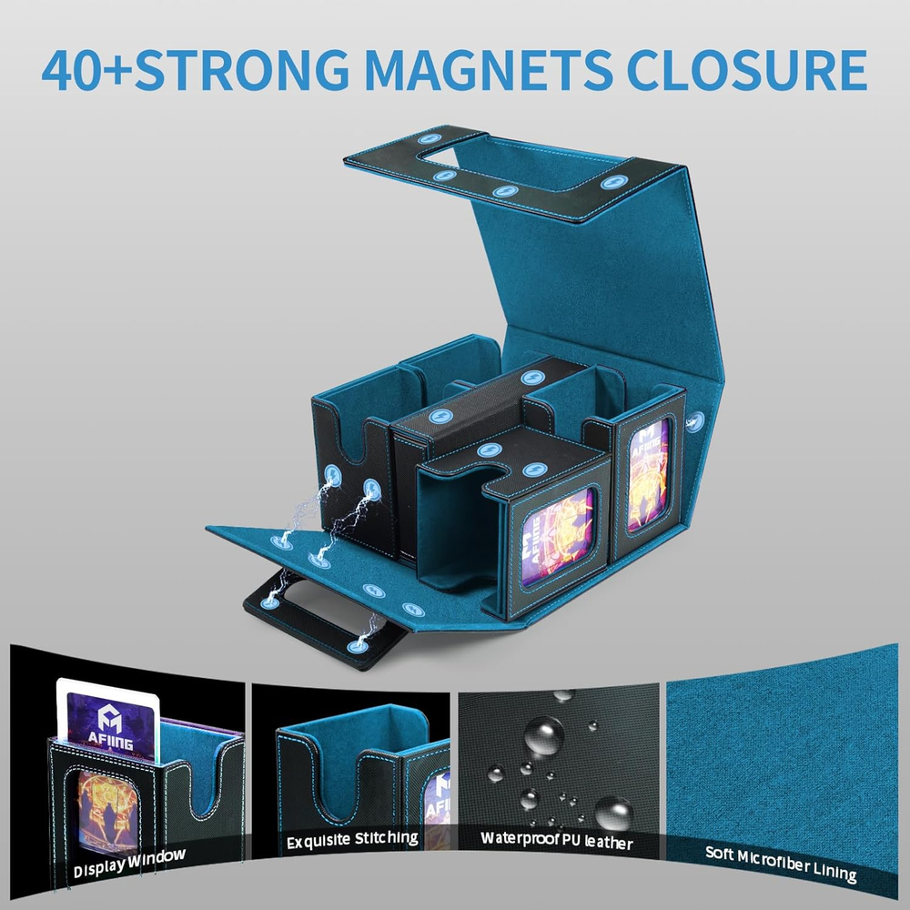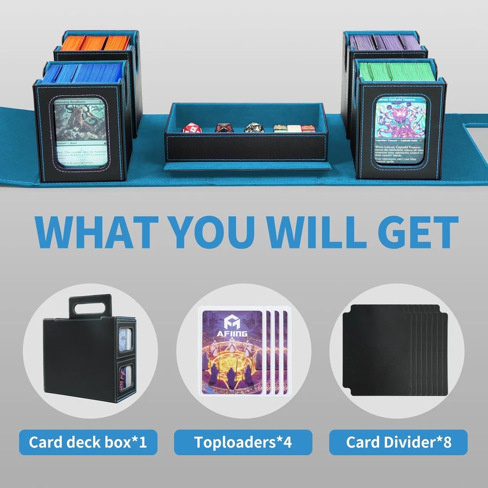 5-in-1 Commander Deck Box with Display Window:Patented modular design includes 4 removable deck cases, each with a transparent display window and rigid Toploader holder—perfect for showcasing your Commander or rare cards. This trading card organizer lets you quickly identify decks at a glance while keeping them safe and secure. Large Capacity – Card Storage Box for MTG & More:Fits 400+ double-sleeved cards, with each inner case holding up to 100 cards. Compatible with unsleeved, single-sleeved, and double-sleeved decks—ideal as an MTG card holder, EDH deck box, or storage solution for various trading card games and collectible card games (TCG/CCG). Extra Protection & Organized Deck Cases:Comes with 4 rigid Toploader holders for your most valuable cards and 8 colorful dividers to sort decks easily. This detachable modular card storage box keeps cards upright and prevents bending or damage—perfect for collectors and competitive TCG players. Premium Build with Strong Magnetic Closure:Crafted with waterproof PU leather, reinforced stitching, and a soft microfiber interior. Powerful magnets hold every component securely in place, making this a durable trading card storage solution and premium MTG card holder built to last. Oversized Dice Tray & Gift-Ready Design:The large dice tray stores tokens, counters, and dice, doubling as a rolling tray during gameplay. Combined with the sturdy portable handle, this deck box is travel-friendly and tournament-ready—a perfect card storage gift for MTG, EDH, and TCG collectors. Product description AFIING 5-in-1 Commander Deck Box — Modular Storage for Card Collectors Finally a deck box that actually fits double sleeves A premium multi-deck storage solution with transparent display windows, removable deck cases, and a portable handle for players who value both function and design. 5-in-1 Commander Deck Box with Display Window 5-in-1 Commander Deck Box with Display Window Store up to4 mtg deck box commander and one dice tray in a single organized system. Each removable case includes a transparent display window to showcase your favorite cards while keeping them safe and dust-free. Large Capacity & Flexible Fit Holds over 400 double-sleeved cards—ideal for trading cards, collectible decks, or custom sets. Each mini deck box fits up to 100 cards, keeping your decks separated and easy to access. Includes 8 dividers for easy sorting Keeps cards upright, secure, and protected from bending Built for Commanders, but perfect for any TCG — Magic, CCG, or collectible cards. Complete Protection & Organized Storage A large detachable dice tray stores dice, counters, and tokens Doubles as a rolling tray during gameplay The sturdy handle lets you carry your decks with ease — from home to tournaments Makes a p erfect gift for Magic Commander players, TCG collectors, or friends who love organized gaming setups. Each magic the gathering deck box comes with 4 rigid toploader holders for your most valuable cards and 8 dividers to keep decks sorted. The MTG deck box commander structure prevents cards from bending or scratching — a must-have commander box for serious Magic the Gathering fans and TCG collectors. Premium Build with Strong Magnetic Closure Crafted with waterproof PU leather, reinforced stitching, and a soft microfiber interior, this deck box MTG commander combines luxury with strength. The durable magnetic closure keeps each commander deck box securely in place. Built to last, it’s the ideal MTG deck box with dice storage for travel and daily use. Engineered for long-term use and premium feel: Waterproof PU leather exterior with elegant contrast stitching Soft microfiber interior to protect card sleeves Powerful magnetic seals on every lid for reliable security This isn’t just a storage box — it’s a display-worthy card vault. It can easily carry around with your The magnetic lid effortlessly flips open, revealing a sleek briefcase-style handle that lies flat for storage or pops out for easy carrying. It’s a genius feature—perfect for hauling a massive stack of cards with premium convenience. The ergonomic handle and deck box commander layout make this the perfect MTG commander deck box with dice storage for on-the-go players. Whether you’re heading to local game nights, tournaments, or conventions, AFIING’s magic the gathering commander deck box is designed for portability, style, and performance — a thoughtful gift for any MTG or TCG player. Let’s be real: this isn’t your budget deck box. It’s an investment, but every dollar shows in the rock-solid quality and smart design details that make it stand out.