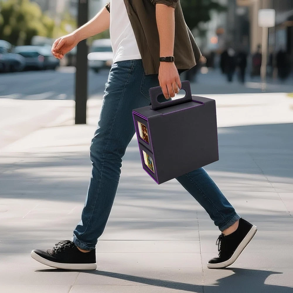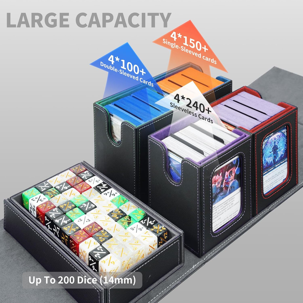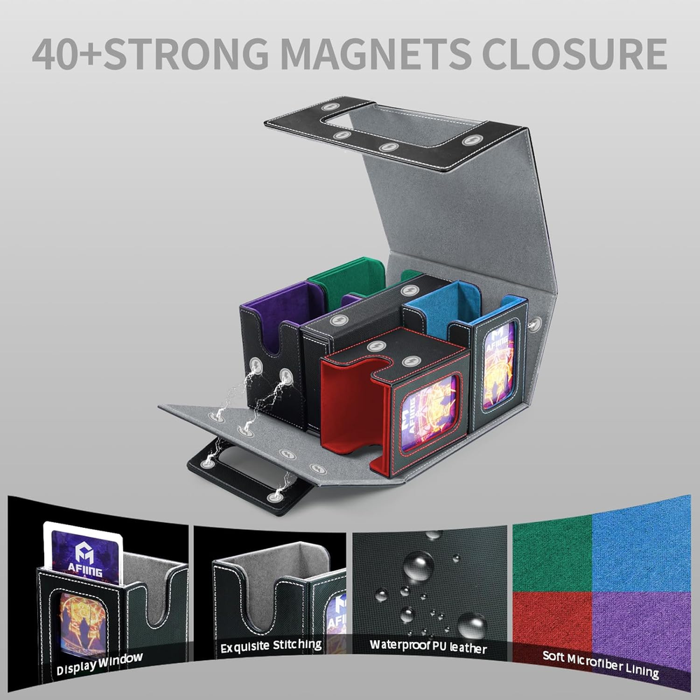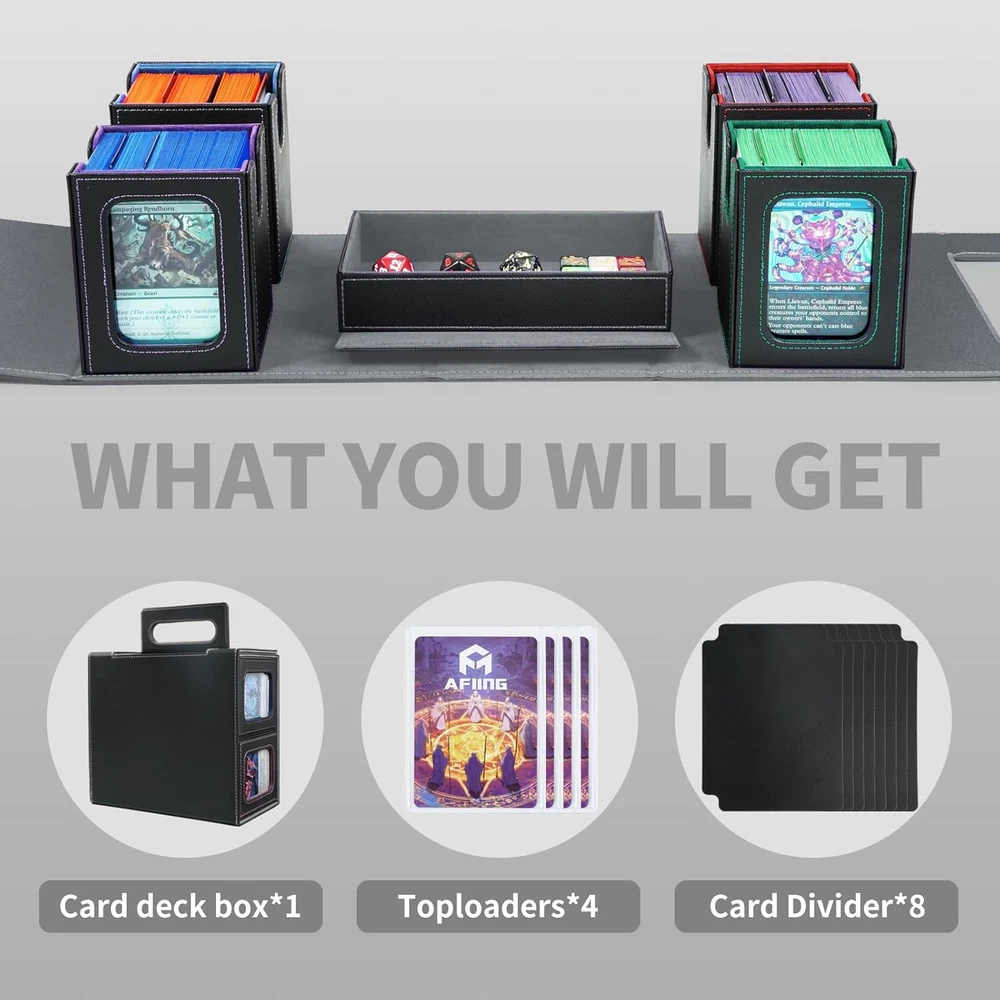 5-in-1 Commander Deck Box with Display Window:Patented modular design includes 4 removable deck cases, each with a transparent display window and rigid Toploader holder—perfect for showcasing your Commander or rare cards. This trading card organizer lets you quickly identify decks at a glance while keeping them safe and secure. Large Capacity – Card Storage Box for MTG & More:Fits 400+ double-sleeved cards, with each inner case holding up to 100 cards. Compatible with unsleeved, single-sleeved, and double-sleeved decks—ideal as an MTG card holder, EDH deck box, or storage solution for various trading card games and collectible card games (TCG/CCG). Extra Protection & Organized Deck Cases:Comes with 4 rigid Toploader holders for your most valuable cards and 8 colorful dividers to sort decks easily. This detachable modular card storage box keeps cards upright and prevents bending or damage—perfect for collectors and competitive TCG players. Premium Build with Strong Magnetic Closure:Crafted with waterproof PU leather, reinforced stitching, and a soft microfiber interior. Powerful magnets hold every component securely in place, making this a durable trading card storage solution and premium MTG card holder built to last. Oversized Dice Tray & Portable Handle:The large dice tray keeps tokens, counters, and dice neatly stored and doubles as a rolling tray during play. Combined with a sturdy, ergonomic handle, this deck box is designed for travel and game nights—a perfect gift for trading card collectors and TCG fans. Product description AFIING 5-in-1 Commander Deck Box — Modular Storage for Card Collectors Finally a deck box that actually fits double sleeves A premium multi-deck storage solution with transparent display windows, removable deck cases, and a portable handle for players who value both function and design. 5-in-1 Commander Deck Box with Display Window 5-in-1 Commander Deck Box with Display Window Store up to4 mtg deck box commander and one dice tray in a single organized system. Each removable case includes a transparent display window to showcase your favorite cards while keeping them safe and dust-free. Large Capacity & Flexible Fit Holds over 400 double-sleeved cards—ideal for trading cards, collectible decks, or custom sets. Each mini deck box fits up to 100 cards, keeping your decks separated and easy to access. Includes 8 dividers for easy sorting Keeps cards upright, secure, and protected from bending Built for Commanders, but perfect for any TCG — Magic, CCG, or collectible cards. Complete Protection & Organized Storage A large detachable dice tray stores dice, counters, and tokens Doubles as a rolling tray during gameplay The sturdy handle lets you carry your decks with ease — from home to tournaments Makes a p erfect gift for Magic Commander players, TCG collectors, or friends who love organized gaming setups. Each magic the gathering deck box comes with 4 rigid toploader holders for your most valuable cards and 8 dividers to keep decks sorted. The MTG deck box commander structure prevents cards from bending or scratching — a must-have commander box for serious Magic the Gathering fans and TCG collectors. Premium Build with Strong Magnetic Closure Crafted with waterproof PU leather, reinforced stitching, and a soft microfiber interior, this deck box MTG commander combines luxury with strength. The durable magnetic closure keeps each commander deck box securely in place. Built to last, it’s the ideal MTG deck box with dice storage for travel and daily use. Engineered for long-term use and premium feel: Waterproof PU leather exterior with elegant contrast stitching Soft microfiber interior to protect card sleeves Powerful magnetic seals on every lid for reliable security This isn’t just a storage box — it’s a display-worthy card vault. It can easily carry around with your The magnetic lid effortlessly flips open, revealing a sleek briefcase-style handle that lies flat for storage or pops out for easy carrying. It’s a genius feature—perfect for hauling a massive stack of cards with premium convenience. The ergonomic handle and deck box commander layout make this the perfect MTG commander deck box with dice storage for on-the-go players. Whether you’re heading to local game nights, tournaments, or conventions, AFIING’s magic the gathering commander deck box is designed for portability, style, and performance — a thoughtful gift for any MTG or TCG player. Let’s be real: this isn’t your budget deck box. It’s an investment, but every dollar shows in the rock-solid quality and smart design details that make it stand out.