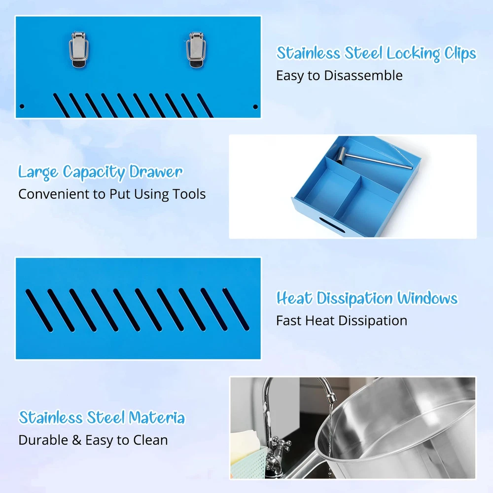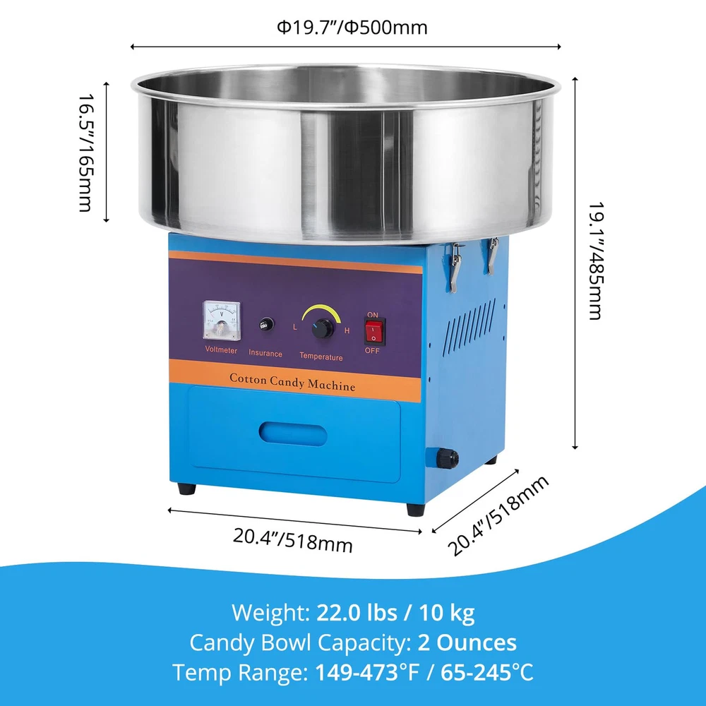 EASY-OPERATING PROCESS: This cotton candy maker is simple in structure and easy to install. All you need to do is to switch on the power, adjust the temperature, warm up for 3-4 minutes, then pour the sugar into the spinning head, and then just collect the cotton candy from the head with sticks. COMMERCIAL GRADE QUALITY: Our commercial cotton candy machine is equipped with 1000W heating power. The larger candy bowl ensures rapid cotton candy cones production for your large output demands. Perfect for commercial use or parties, wedding receptions, and even family and social gatherings. DIGITAL TEMP CONTROL: Unlike the common ones, our electric candy floss maker features a digital voltage display screen and a temp control knob. By changing the voltage, you can simply adjust the temperature from 149℉ to 473℉. Allowing you to try different flavored sugars with one machine. USER-FRIENDLY DESIGNS: This candy floss machine is equipped with a large drawer, which helps provide extra storage space for cotton candy cones/sticks or floss sugar packs. The sealing treatment components can prevent sugar flocs from falling into gaps. The sugar spoon as an extra offering is convenient for you to scoop and pour sugar, plus the ventilation holes on both sides are designed to facilitate heat dissipation. ENJOY YOUR COTTON CANDY TIME: This cotton machine allows you to use traditional flossing sugars, milk sugars, fruit cubes, or any of your favorite hard candies to make delicious cotton candies. The stainless steel bowl owns a large diameter of 20 inches, which is quite easy to be removed, making cleanup a breeze at the end of the event.