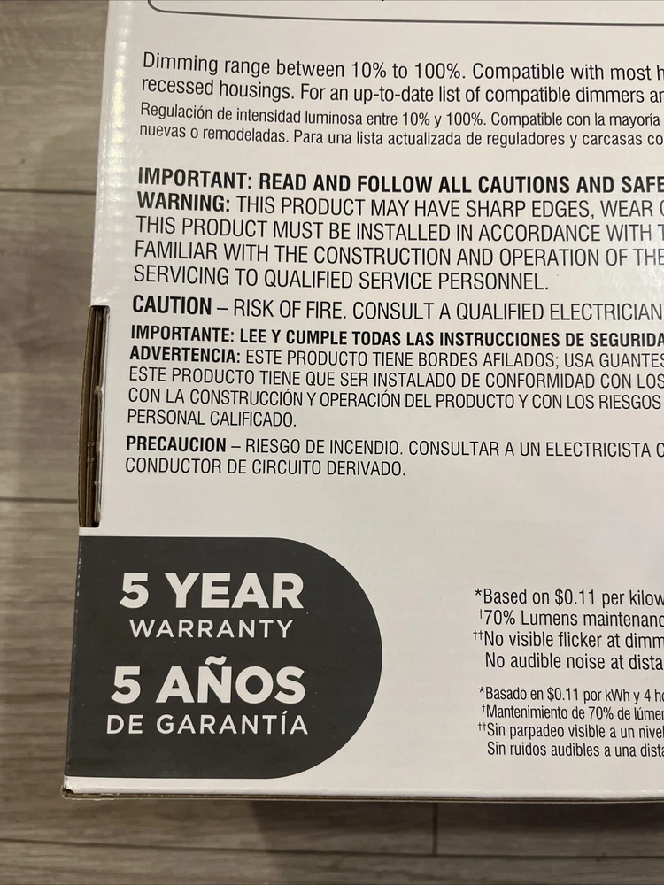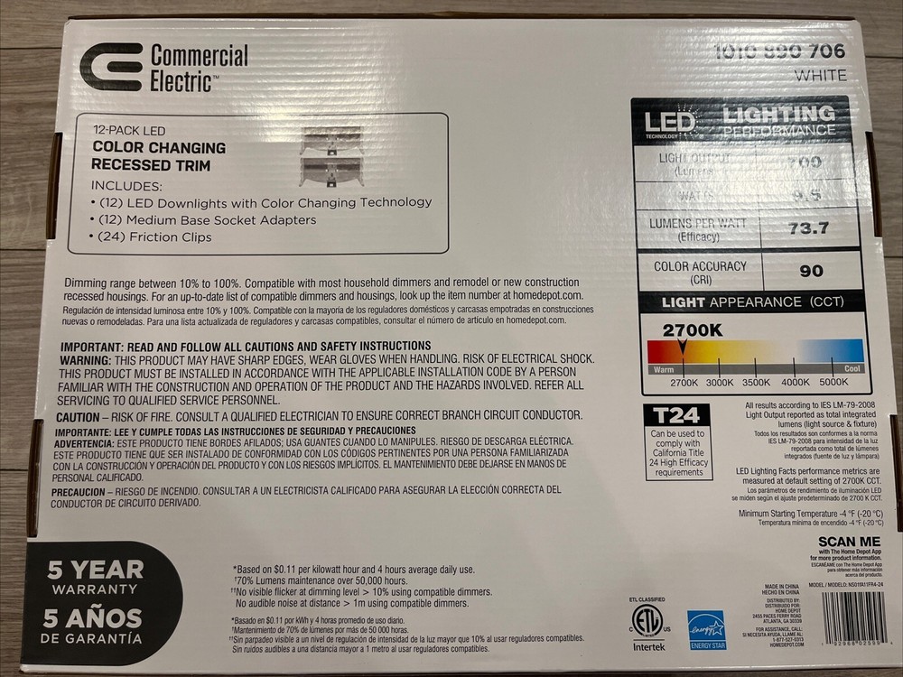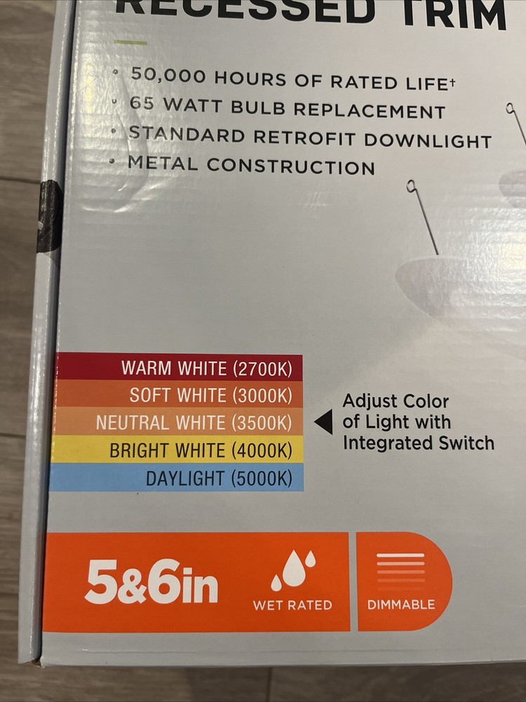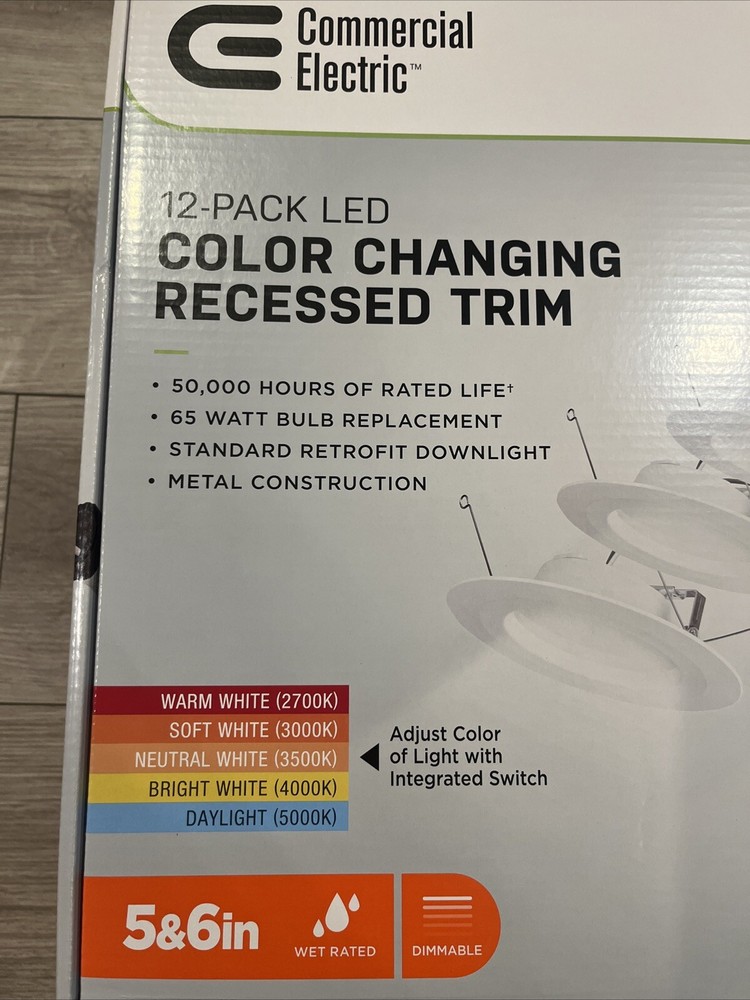 Enhance your home or office lighting with this Commercial Electric 5/6 in. Integrated LED Recessed Downlight Retrofit Light Trim. This light trim comes with a selectable white color temperature and a color rendering index of 90, providing excellent lighting quality. It is suitable for indoor use and is wet rated, making it perfect for commercial and residential settings. This light trim has a integrated bulb wattage of 9.5 W and a wattage of 65 W, making it an energy-efficient and cost-effective lighting solution. It is easy to install and comes with wiring connectors, making it a hassle-free experience for new construction or remodel projects. Upgrade your lighting with this high-quality and reliable light trim today!