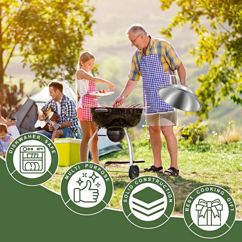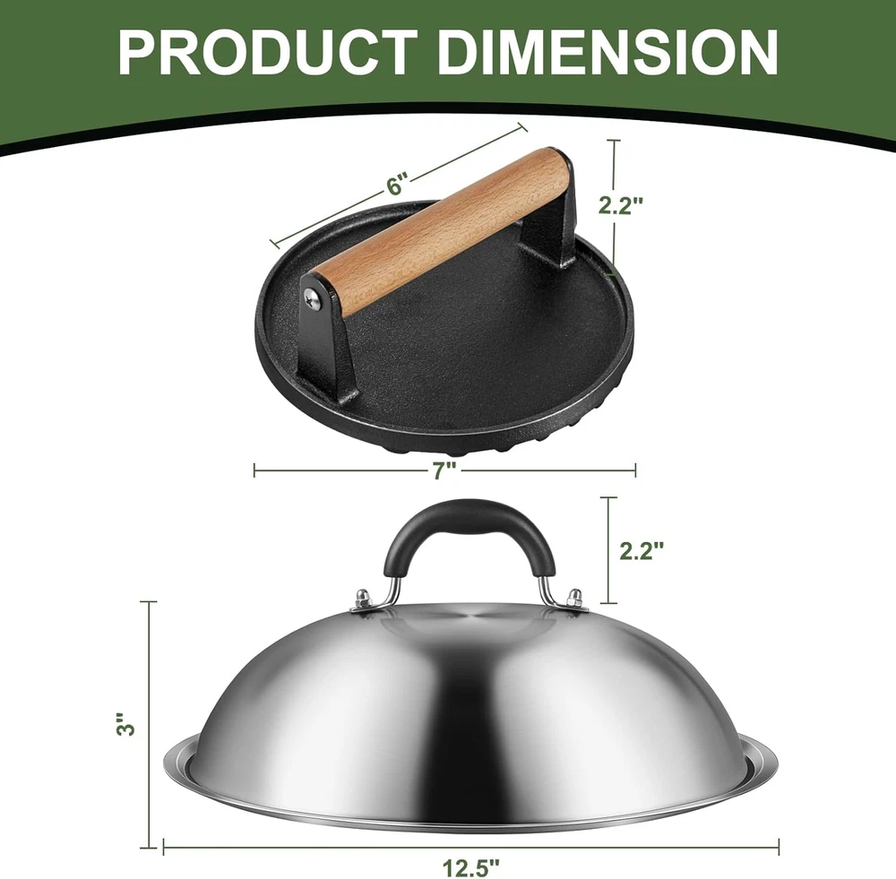 Menu Other Items Feedbacks About Us Contact Us Add To Favorites Griddle Accessories for Blackstone, Commercial Grade 12 Inch Heavy Duty round Melting Dome with 7" round Cast Iron Grill Burger Bacon Press, Perfect for Blackstone Camp Chef Flat Top Griddle Grill [PROFESSIONAL CHEF GRADE]: Round melting dome and flat grill bacon press are chef-grade barbecue accessories, used by griddle masters. We offer you professional flat top grill accessories so you can make your own restaurant-like cuisine at home. [TOP QUALITY MELTING DOME]: The basting cover is 2.5mm thick 304 stainless steel and heavy duty, it’s durable and easy to clean. Round rolled rim makes steam flow back along it without overflow, Ergonomic plastic heatproof handle and dishwasher safe. [SUPERIOR MATERIAL GRILL PRESS ]: Grill press is made of heavy duty food grade cast iron. Use the grill weight to press out unwanted grease and fat, wooden handle, has ergonomic design to reduce hand fatigue while ensuring a secure and comfortable grip, Press out unwanted excess fat and oils from meats for healthy grilling and shorten the cooking time. [HEAT EVENLY & LARGE DIAMETER ]: 12.5” diameter melting dome and 7 inch diameter griddle press, create a larger coverage area of multiple hamburger patties or amount of veggies. The bacon press can be seasoned like cast-iron skillets to create a non-stick surface. [ENHANCE BBQ EXPERIENCE]: Works perfectly with any grill griddles such as flat top, gas, pellet, electric, teppanyaki, cast iron and skillet for cooking bacons, hamburgers, beefs, poultry, flat breads, grilled sandwiches, quesadillas and much more, Useful gadgets for kitchen enthusiasts and the finest of chefs. Product Description Item Specification Item model number xike-0079US Item Weight 1.74 Kilograms Style Melting Dome + Round Press Color Silver Material Cast Iron Country of Origin China Is Dishwasher Safe Yes Has Nonstick Coating No Shape Round Recommended Uses For Product Versatile cooking on griddle grills, flat top griddles, gas grills, pellet grills, electric grills, teppanyaki grills, cast iron griddles, and skillets Product Dimensions 13 x 13 x 4 inches Dimensions Shipping Returns Additional Info Product Dimensions: 13.0 inches x 13.0 inches x 4.0 inches. Weight: 1.74 kg Fast shipping is very important for us. Our standard shipping service is FREE. Your order will be shipped within 1-3 business days upon full payment received. Most items are delivered within 3-5 business days, however, please allow 3-10 business days. We are shipping only to USA. We only ship to the confirmed Paypal address. We reserve the right to cancel any order for any reason at any time. We are not responsible for undeliverable addresses. We offer a 30 day return policy from checkout winning date. Your satisfaction is guaranteed! If for any reason you are unhappy with your item, just return it within 30 days for a full refund, minus shipping cost. Please contact us prior to initiating a return so that we can issue you a refund authorization. Items defective upon receipt must be packaged in their retail packaging as if new and returned with a detailed description of the problem. Return shipping fees are not refundable. We reserve the right to decline any returns if the above guidelines are not followed. All of our items, unless otherwise stated, will only run on 120 volts. Please check to make sure your country complies with these specifications. If you have a problem or question regarding your transaction please contact us before leaving any type of feedback. We will work with you to resolve any problem you may have.