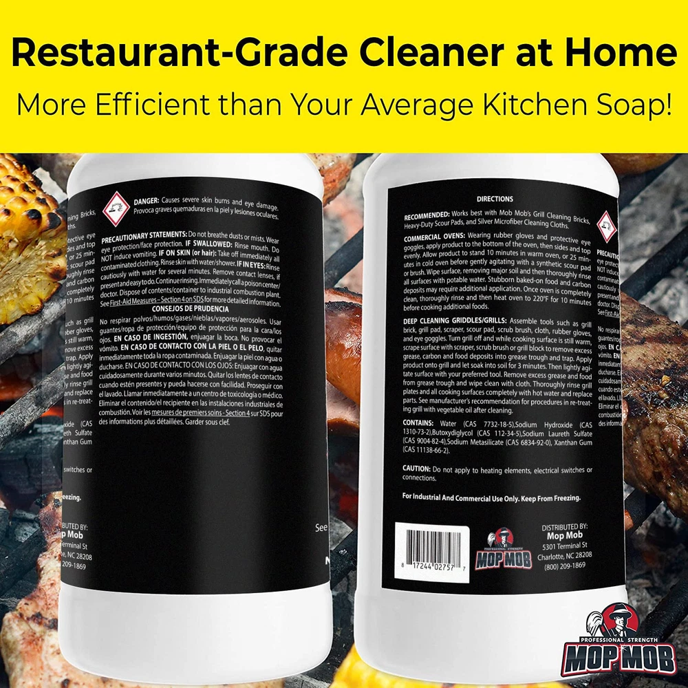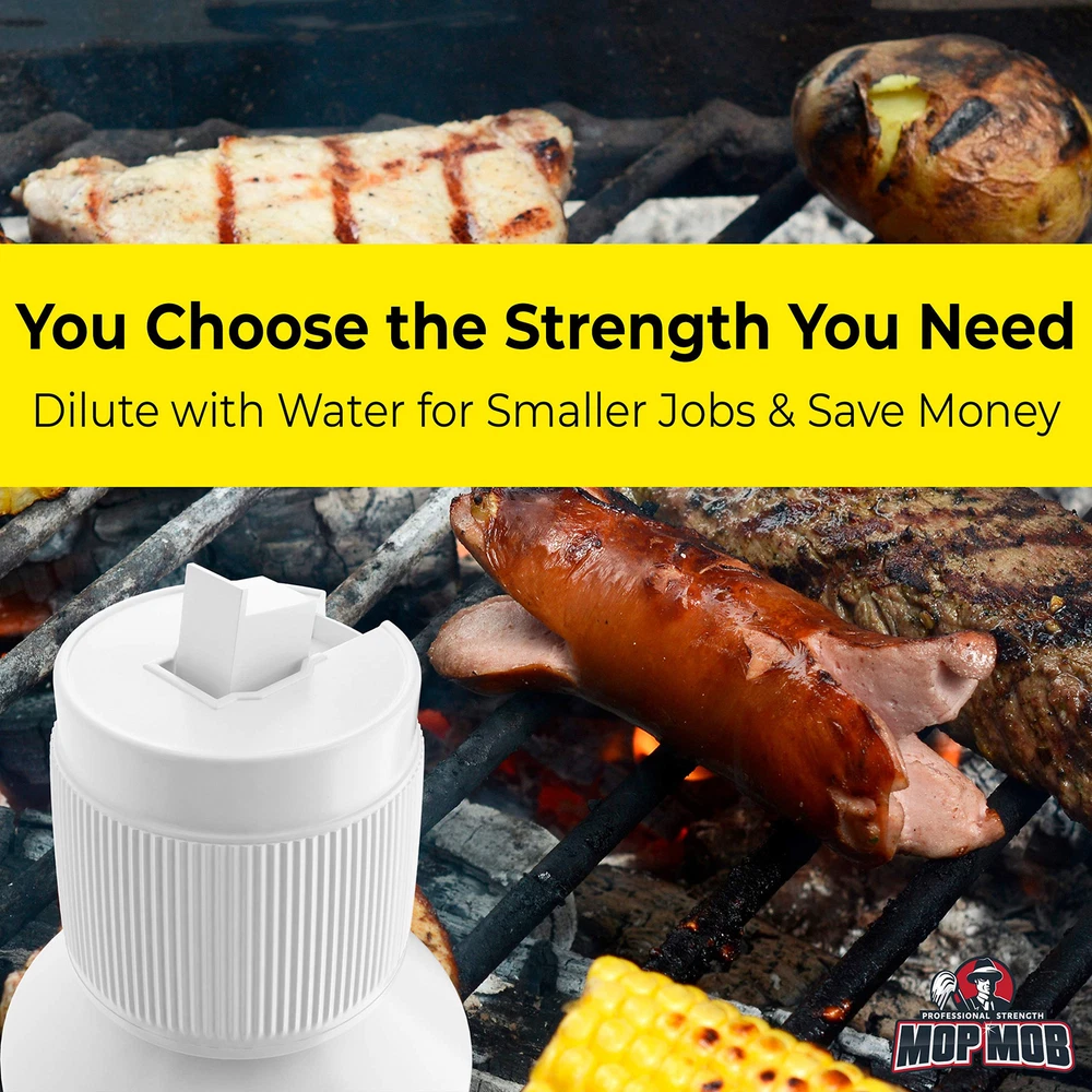 Don't settle for time wasted scrubbing with mediocre cleaners when you can save hours with our heavy-duty, degreasing cleaner that is fast acting and easy to use. 's commercial-grill concentrate was originally created for high-end restaurant equipment. It quickly destroys thick, charred grease and food residue in minutes on everything from household stoves and ovens to restaurant cooktops and deep fryers. Our product is great for grills and grates, griddles, stoves, ovens and fryers. Safe to use on stainless steel, cast iron and other durable surfaces. Precision cleaning with flip top nozzle Our easy-grip ergonomic bottle is complete with a specially designed cap that features an easy-to-use flip-top nozzle. This makes it simple to aim into the creases and edges of your kitchenware without wasting cleaner, keeping your space looking as good as new. For best results, use with heat and a cleaning tool Use the concentrate alone for deep cleaning, or dilute 1:1 with water for everyday maintenance. Use with heat, and wipe down and rinse surfaces after use before preparing food. Please see instructions for specific application temperatures. Pair with scouring pads, pumice bricks and scrapers for a perfect clean. What’s in the Box? You'll receive 1 () 32 ounce easy-grip bottle of grill cleaner concentrate (equivalent to quart or 946 mL), complete with flip-top nozzle and detailed information and instructions on the label. Satisfaction Assured for Life! If you aren’t completely satisfied with your order, simply us, and we will respond within 24 hours to make it right even on the weekends. We absolutely assure your satisfaction! COMMERCIAL CLEANER FOR COMMERCIAL MESSES. This isn't your average home kitchen cleaner. Designed by and for the pros, our powerful grill concentrate is the fastest and easiest way to dissolve grimy caked-on grease and gunk. ULTRA STRONG DEGREASING POWER FOR A SPOTLESS CLEAN. Our cleaning solution penetrates and breaks down the toughest burnt-on food deposits. Tackle that nasty stove mess with ease, and see your smiling face reflecting back at you. SATISFACTION ASSURED FOR LIFE. We stand by all of our professional strength cleaners and cleaning equipment. If at any point you're not 100% happy, just send us an , and we promise to make it right! FAST-ACTING SOLUTION SAVES YOU TIME AND MONEY. Our formula works hard so you don't have to, saving time and abolishing days of back pain from scrubbing. No going back to the for another bottle of cheap cleaner to get the job done. CONFIDENTLY TRUSTED BY PROFESSIONALS. Keep your restaurant-cooking equipment sparkling with our heavy duty cleaner that easily eliminates the toughest grime. Safe to use on your Wolf, Viking, Blackstone and other kitchenware.