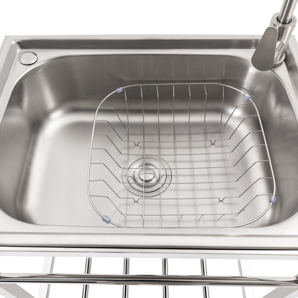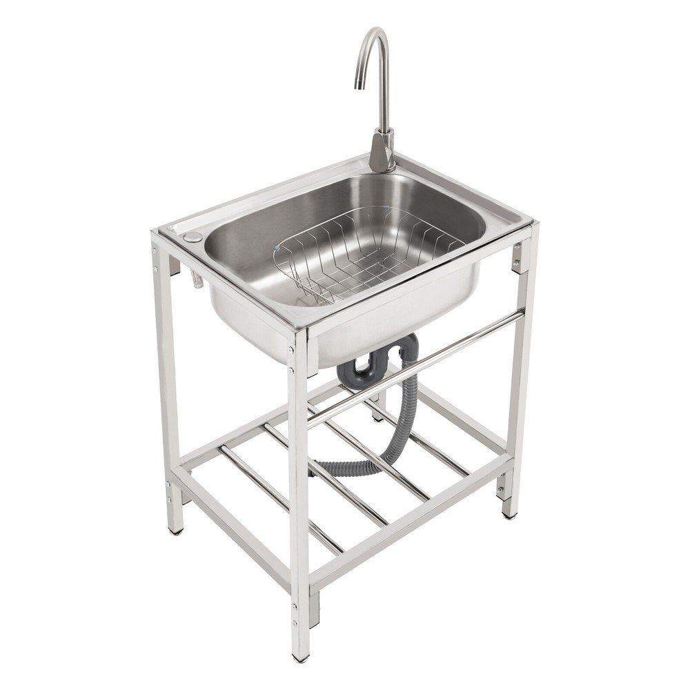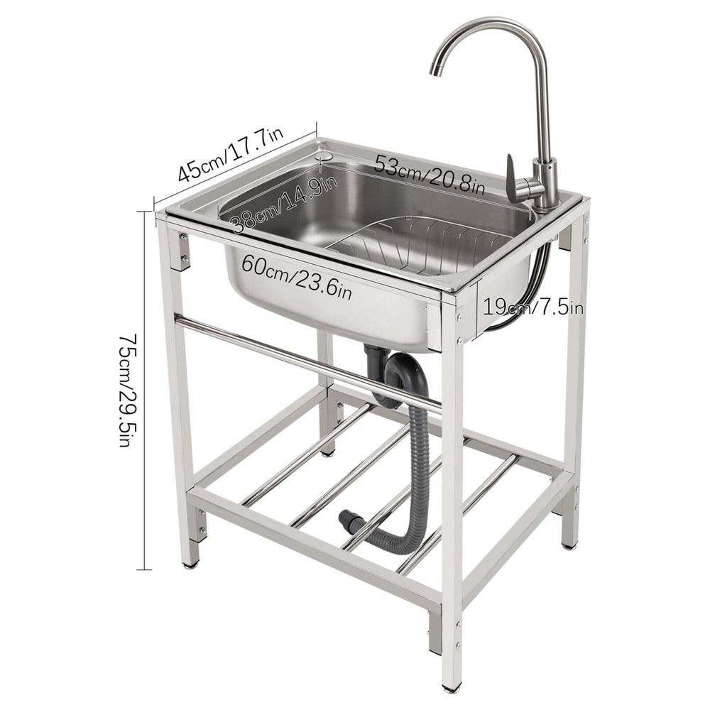 Commercial Single Bowl Stainless Steel Hand Wash Sink Basin Freestanding &Faucet Description This freestanding single basin sink is the ideal cleaning aid for washing fruits and vegetables, clothes, dishes, and cookware. It has a 7.5in deep sink for a large number of cleaning tasks at once. Its raised countertop design prevents spills from wetting your clothes. The silencing pad at the bottom of the sink can reduce the sound of water arialing the metal sink, providing you with a good cleaning environment! Application This freestanding single basin sink is suitable for cleaning food, fruits, and vegetables, and any kitchen, bar, restaurant, dessert shop, clean room, cafeteria, garage, or any other business place. This will be a very useful piece of equipment when you barbecue in the backyard or garden. Specification Color: Silver Style: Single Bowl Basin Sink Installation Method: Freestanding Material: 202 Stainless Steel Surface Treatment: Brushing Process Processing: Integrated Molding Sink Countertop Weight Capacity: 100kg/ 220.46lbs Shelf Weight Capacity: 20kg/ 44.09lbs Sink Size: 53*38*19cm/ 20.8*14.9*7.5in Product Size: 60*45*75cm/ 23.6*17.7*29.5in Package Size: 77*48*28cm/ 30.31*18.9*11.02in Net Weight: 9.5kg/ 20.94lbs Gross Weight: 11kg/ 24.25lbs Package Included 1* Sink 1* Cold & Hot Tap 1* Sewer Pipe 1* Filter Carrycot 1* Thickened Lower Outlet 1* Drain Bracket 1 Set* Bracket 1 Pair* Gloves 2* Water Pipes 2* Angle Valves Other Needed Accessories Key Features Large Capacity Sink : The size of the sink is 20.8*14.9*7.5in to allow you to complete a large number of cleaning tasks and accommodate many pots and pans at one time, making it very suitable for commercial use. Layered Filtration : Its filter carrycot is capable of layered filtration of sewage to prevent the problem of clogged downspouts caused by larger objects falling into the sink, making it easy for you to use. Farewell to Drip : We provide you with a drain basket. When you have cleaned the dishes, you can put them into the drain basket. When the water drips out, you can collect them again, and you will have a cleaner kitchen! Low Noise : The bottom of the sink is equipped with a silencing pad, which can effectively reduce the noise when the water hits the metal sink, providing you with a quieter cleaning atmosphere. Convenient to Use : It adds extra storage space at the bottom for you to put things like detergent, dishwashing basins, and vegetable baskets that you will use frequently for your daily use. And its faucet can rotate 360 ° to facilitate your cleaning. High Load-bearing Capacity : Its bracket is fixed with screws, which is more stable, making its sink countertop hold up to 220.46lbs, and bottom shelf hold 44.09lbs of items. Such a strong load-bearing capacity allows you to use it with confidence. Customer-friendly : There is a pair of gloves in the package to provide you with the safest and most convenient service. High-quality Material : It is made of high-quality 202 stainless steel, free of lead, durable, non-toxic, and harmless so that you can rest assured of long-term use. Easy to Clean : The sink has a brushed finish and is designed with R-conners, which makes the sink smooth, not easy to get oil and scale, and easy to clean. Easy Installation : This freestanding single basin sink has a simple structure and complete accessories, so you can easily install it in a short time. Customer Service : We aim to provide quality products and services. If you have any problems, please feel free to contact us. We will reply and solve the problem for you as soon as possible. Details Raised Sink Countertop : Its countertop is raised to effectively prevent water from splashing out and wetting your clothes when washing dishes. Firm Sewer : Its sewer is embedded with steel wire, which is not only hard to break, but also prevents insects and rats from biting, thus prolonging its service life. All Steel Drainage : Its drainage system is made of all steel, making it durable and not easy to rust or smell, so you can use it with confidence. Brushing Process : Its surface is treated with a brushing process, which not only makes it more metallic but also enhances its ability to prevent corrosion, mold, and rust. Integrated Molding : This freestanding single-basin sink adopts an integrated molding process, which makes it durable without cracks. Notes Please allow the slight color difference caused by the shooting light and 1-3 cm error due to manual measurement, and make sure you do not mind before ordering. Payment Delivery details Terms of sales About us Contact us Payment We accept ebay payment 。 Fees such as import duties, taxes are not included in the item price or shipping costs. These charges are the buyer's responsibility. Delivery details Shipping: 2-9 working days to: USA Terms of sales We maintain high standards of excellence and strive for hundred percent customer satisfaction. Feedback is very important to us. We hope that you contact us immediately before you give neutral or negative feedback, so that we can address your concerns. It is impossible to address issues if we do not know about them! About us Your satis faction is our ultimate goal. We work hard to earn your trust and future business. Our certified technicians have tested each item before shipping. The unit comes with 1 year limited warranty on all manufacturing defects. a) If you receive a defective item, you may return it or ask for a discount. Please contact us within 14 days after you receive the package. b) What you returned must be intact and in its original packaging as re? u. Customer is responsible for shipping costs of the returned item. c) We will cover the cost of shipping back t with the shipping rate indicated in the registration page. We will send you a new unit or refund the full payment you paid. Thank you. Contact us Business Hour Business Hour: Monday To Friday: 8:30 AM to 5:00 PM (Beijing China time) Due to time zones, our reply t