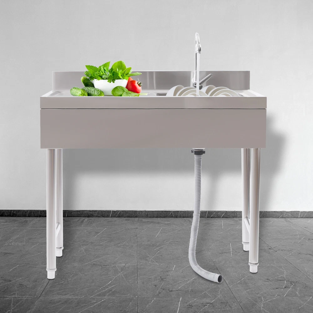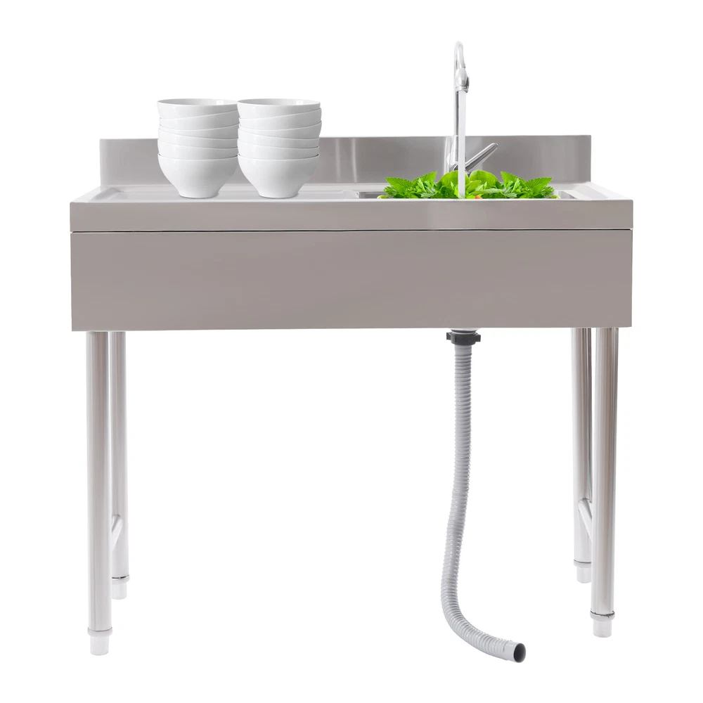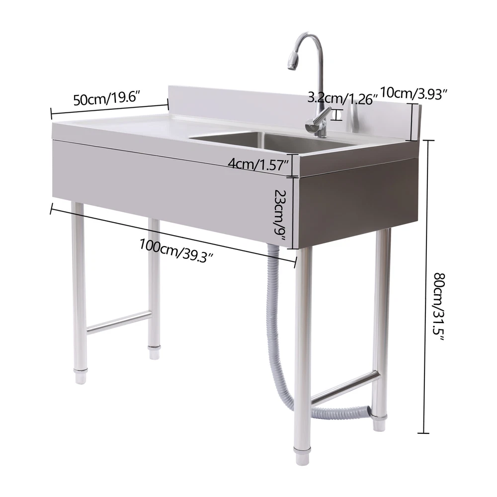 Description This is a good cleaning assistant for commercial premises. Its spacious and sturdy worktop provides you with plenty of storage and workspace. The wider and deeper sink gives you a capacity of about 7.66 gallons to handle large amounts of cookware, vegetables, and fruits. With its smooth, shiny finish and simple construction, it will make a stylish and sophisticated kitchen. Specification Material: 201 Stainless Steel, Plastic, Nylon Color: Silver Number of Sink: 1 Shape: Rectangular Process: Polishing, Welding, Cutting, Wire Drawing Installation Method: Freestanding Faucet Adjustable Angle: 360° Temperature Control Type: Hot and Cold Dual Control Max. Load-bearing Capacity: 150-200kg/330-440lbs Package Size: 102x52x38cm/40.15x20.47x14.96in Product Size: 100x50x80cm/ Commercial Sink Stainless Steel Kitchen Utility Sink 1 Compartment & Prep Table Description This Is a Good Cleaning Assistant for Commercial Premises. Its Spacious and Sturdy Worktop Provides You with Plenty of Storage and Workspace. the Wider and Deeper Sink Gives You a Capacity of About 7.66 Gallons to Handle Large Amounts of Cookware, Vegetables, and Fruits. with Its Smooth, Shiny Finish and Simple Construction, It Will Make a Stylish and Sophisticated Kitchen. Detail Stainless Steel Feet : the Four Stainless Steel Feet on the Bottom Provide Good Support for the Commercial Stainless Steel Sink. and the Support Feet Feature a Removable and Adjustable Design That Is Not Only Easy to Assemble and Disassemble but Can Be Adjusted (1.18-1.96in) at Will to Fit Different Floors. Enlarged Worktop : the Enlarged and Smooth Worktop Is Convenient for Placing Many Dishes and Clothes and Can Also Be Used for Cutting Pork Chops, Steaks, Etc. Recesses : the Recesses of the Countertop Can Prevent Water from Overflowing and Getting Wet Clothes, Which Is Very Thoughtful. Thicker Cross Bars : the Sink Is Equipped with Several Thicker Cross Bars to Increase the Weight-bearing Capacity of the Product. Drainage Port : the Drainage Port Is Made of High-quality Stainless Steel, Which Is Corrosion-resistant and Rust-free. the Stainless Steel Drainage Spout Extends the Life of the Product. Filter : the Drainage Outlet Is Equipped with a Filter, Which Can Effectively Filter and Prevent Clogging. Drainage Pipe : the Drainage Pipe's 1.25-Inch Enlarged Diameter Makes Drainage Quick and less Likely to Clog. Its 23.62-Inch Length Is Convenient for Installation and Drainage. High-quality Inlet Pipe : the Inlet Pipe Is Made of High-temperature and Wear-resistant Nylon, Which Is Very Safe and Durable. Water Catch Hole : the Splash Guard Is Equipped with a Water Catch Hole for Easy Connection of Water Pipes. Application This Commercial Stainless Steel Sink Is Suitable for Use in Restaurants, Canteens, Snack Bars, and More. with Its Large Capacity, Easy Cleaning, and Corrosion Resistance, It Is a Great Addition to Any Kitchen or Laundry Room. Specification Material: 201 Stainless Steel, Plastic, Nylon Color: Silver Number of Sink: 1 Shape: Rectangular Process: Polishing, Welding, Cutting, Wire Drawing Installation Method: Freestanding Faucet Adjustable Angle: 360° Temperature Control Type: Hot and Cold Dual Control Max. Load-bearing Capacity: 150-200kg/330-440lbs Package Size: 102x52x38cm/40.15x20.47x14.96in Product Size: 100x50x80cm/39.3x19.6x31.5in Sink Size: 43x31x22cm/16.9x12.2x8.6in Sink Capacity: 29l/7.66gal Gross Weight: 19kg/41.88lbs Length of Drainpipe: 60cm/23.62in Worktop Height: 23cm/9in Worktop Thickness: 4cm/1.57in Slash-proof Board Height: 10cm/3.93in Water Catch Hole Diameter: 3.2cm/1.26in Support Feet Adjustable Range: 3-5cm / 1.18-1.96in Key Features High-quality Material : This Commercial Stainless Steel Sink Is Made of High-quality 201 Non-magnetic Stainless Steel. the Corrosion-resistant, Rust-free 201 Stainless Steel Extends the Life of This Product. Excellent Weight Capacity : the Solid H-shaped Construction of the Commercial Stainless Steel Sink Stand Gives It a Maximum Weight Capacity of 330 to 440 Pounds. Large Capacity : the Thickened and Deepened Commercial Stainless Steel Sink Measures 16.9x12.2x8.6 Inches Providing You with a 7.66-Gallon Capacity, Which Allows You to Place Enough Dishes or Laundry. Easy to Clean : This Commercial Stainless Steel Sink Is Superbly Polished, so the Surface Is Smooth and Delicate and Very Easy to Clean. All You Need to Do Is Wipe with a Damp Cloth or Rinse with Water. Quick Drainage : the Sink Is Equipped with a Large-diameter (1.26inches) Drainage Pipe, Which Makes the Drainage Quick so That There Is less Potential for Water to Accumulate. Wire Drawing Process : This Commercial Stainless Steel Sink Adopts a Professional Wire Drawing Process That Gives the Surface a Metallic Shine. the Brushed Surface Is Also More Resistant to Wear and Scratches, Making It Shiny and Smooth Even After Long Periods of Use. Flexible Faucet : the Faucet Is Designed with Hot and Cold Dual Control Allowing You to Switch the Water Temperature Flexibly, Which Is Very Convenient. and the Rotatable Faucet Allows You to Clean the Dead Corner Easily. Suitable Height : the 31.5-Inch Height of the Commercial Stainless Steel Sink Fits Most Heights. the Right Height Allows You to Say Goodbye to Bending over to Clean Dishes, Which Is Very Comfortable and Convenient. Excellent Craftsmanship : We Use Laser Cutting, Mechanical Welding, and Polishing Processes to Make the Sink Strong, Durable, and Corrosion-resistant. Splash-proof : This Commercial Stainless Steel Sink Has a Raised Splash Guard to Prevent Water from Splashing Against the Wall. This Not Only Protects the Wall but Also Eases the Cleaning Task. Customer Service : We Aim to Provide Quality Products and Services. If You Have Any Problems, Please Feel Free to Contact Us. We Will Reply and Solve the Problem for You As Soon As Possible. Package Included 1x Commercial Sink 2x H-shaped Support Columns 1x Drainage Pipe 2x Inlet Pipes 1x Faucet 4x Support Feet All Acces