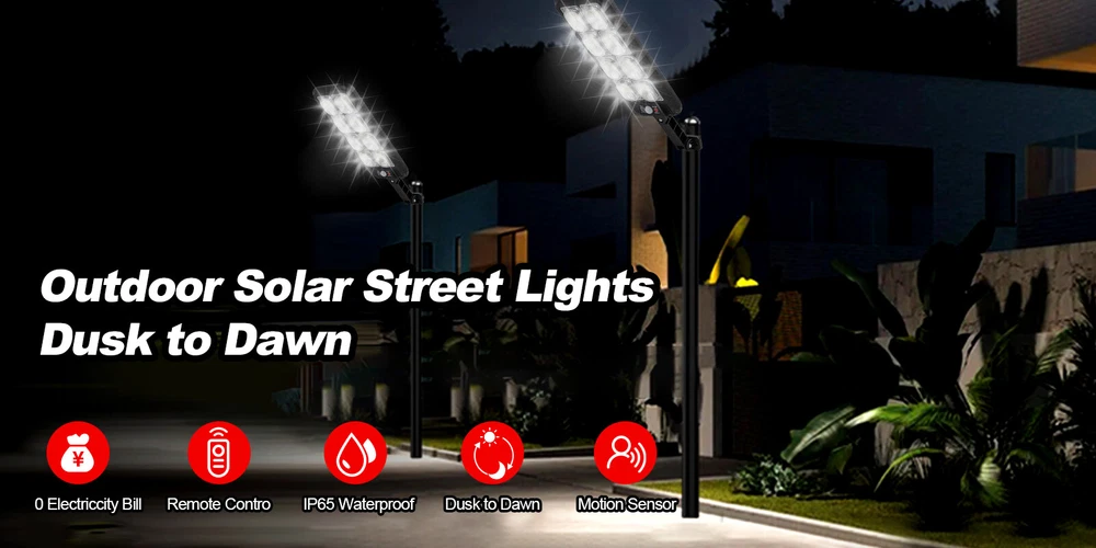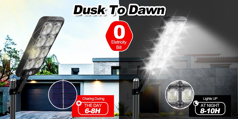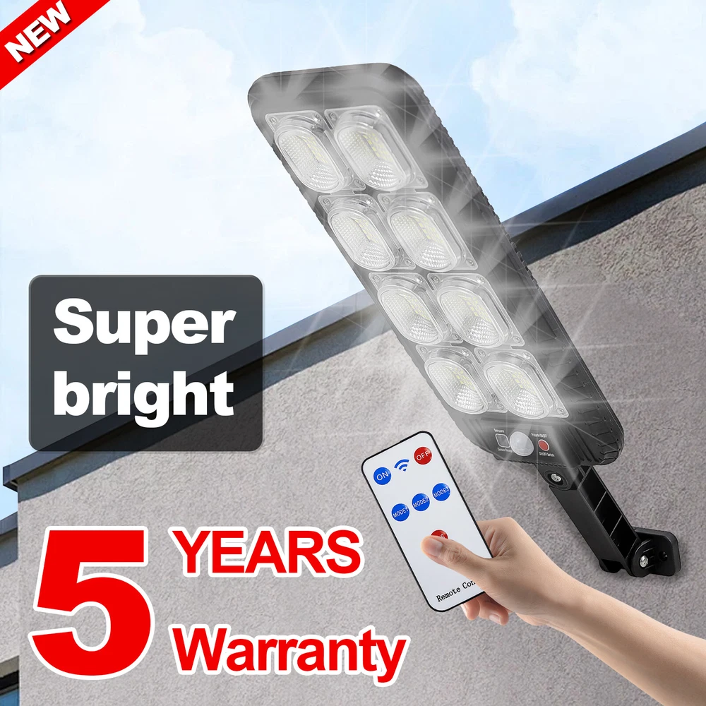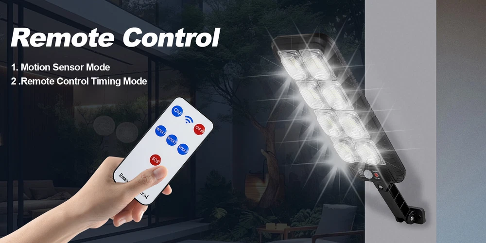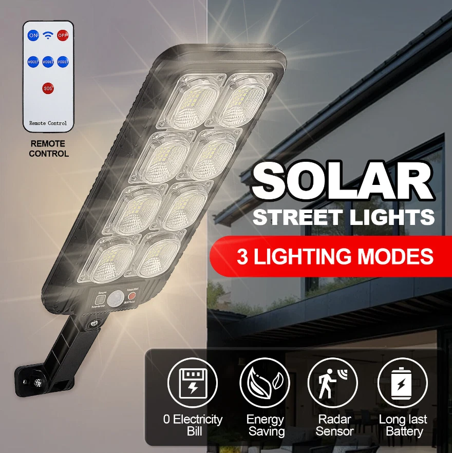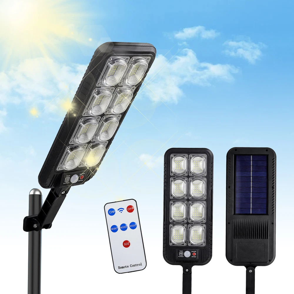 Product Description: Specifications: Product Name: Solar Street Light Light Body Material: ABS + PC Light Color: Cold White 6500K Waterproof: IP65 Battery Capacity: 3.7V 2400mAh Charging Time: 6 ~ 8hrs Direct in the Sun Working Time: 6~ 10hrs Installation Height: 2 ~ 3m / 6.56 ~ 9.84ft Lamp Body Size: 31.5 x 13.1cm / 12.4 x 5.16in Light Arm: 12.4cm / 4.88in LED QTY: 200SMD 3 Lighting Modes: OFF: Light OFF Mode; Mode 1: Lights on when people pass by, lights off when people leave; Mode 2: Lights on when people pass by, 20% brightness when people are away; Mode 3: Automatically light up when dark, Keep on till the sky gets bright. Package Included: 1 x Solar Street Light 1 x Remote Control 1 x Set of Installation Accessories LED Solar Light Outdoor: The LED solar street lights outdoor produce ultra-high brightness illumination for a wide area, providing lighting and security to front door, pathway, gutter, porch, front/back yards, gardens, driveways, fence, wall, stairways, landscape, patio or any outdoor places that needs lighting, bring you a super bright lighting experience. 3 Optional Modes & Remote Control: 1. Sensing Mode - Strong light for 20s once movement detected, then turn off. 2. Constant Light + Sensing Mode - Dim light all night, and strong light for 20s when sensor detects movement. 3. Constant Light Mode - Medium light mode all night. 120° Wide-Angle Solar Lighting: The outdoor wall lights features high sensitivity and adjustable bracket design, can sensitively sense moving objects in 10 ~ 15ft with 120° range, providing security and convenience for your home when night falls. High Efficient Solar LED Outdoor Lights: These solar light are made of more energy saving laminated solar panel and premium LED lights, which will be more long-lasting and suitable for longer usage time. Build-in 2400mAh rechargeable lithium-ion battery to allows the LED solar lights to be continuously illuminated for 6 ~ 10 hours in bright mode to meet your lighting needs. IP65 Waterproof & Easy Installation: The solar street lights is made of long-lasting and high-impact ABS Material which makes it to withstand a variety of outdoor environments and other extreme weather conditions. Easy to install and set, no wire and tools need.