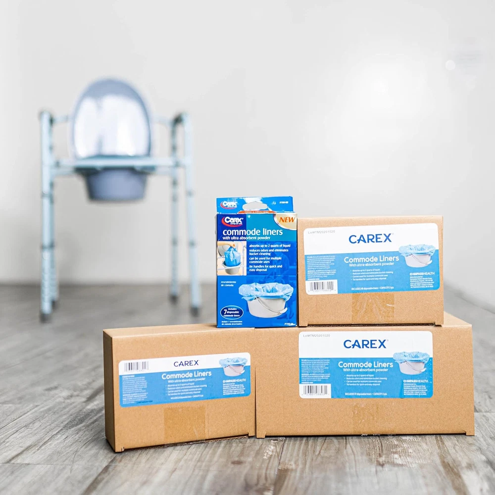 42 total portable toilet liners. Each commode liner an hold up to 2 quarts of liquid. Our portable toilet bags are universal fit and will work with most commodes, uplift commodes, or potty chairs. Disposable and hygienic. Comes with 6 boxes of 7 disposable commode liners per package. Perfect for a bedside Commode or travel commode. Thick commode bags. No accidents, no Spills. Our potty chair liners are durable, won't rip, and are very strong. Disposable liners come with absorbent powder, reducing smell and liquid. Super absorbent powder on the commode bag dries up liquid and reduces smells. Liners will also work for bedpan liners or as a replacement for porta potty bags. Commode bucket replacement. To replace the commode liner, simply close up the bag, tie up the handles, and place in the garbage. Replace immediately with a new commode liner. Compatible with the Medline commode and drive commode. Product description The video showcases the product in use. The video guides you through product setup. The video compares multiple products. The video shows the product being unpacked. Our Other Products Add to Cart Add to Cart Add to Cart Customer Reviews 4.6 out of 5 stars 2,951 3.0 out of 5 stars 119 4.6 out of 5 stars 81 4.6 out of 5 stars 513 4.6 out of 5 stars 121 4.7 out of 5 stars 154 Price $37.99 $ 37 . 99 $206.73 $ 206 . 73 — $35.11 $ 35 . 11 — — Material Steel Frame Steel Frame 100% Absorbent Polymer 100% Absorbent Polymer 100% Absorbent Polymer 100% Absorbent Polymer Weight Capacity 300 lbs 300 lbs 2 Quarts of liquid 2 Quarts of liquid 2 Quarts of liquid 2 Quarts of liquid Does it have lifting assist? ✘ ✔ ✘ ✘ ✘ ✘ Does It Include Arms? Yes Yes — — — — Do the Arms Drop Down? No No — — — — Width Between Arms — 17" 17" — — — Are Tools Required? No 7/16” Wrench — — — — Package Qty. 1 1 24 42 48 72