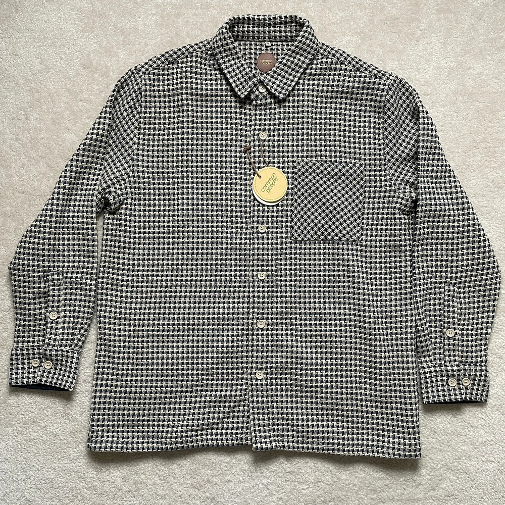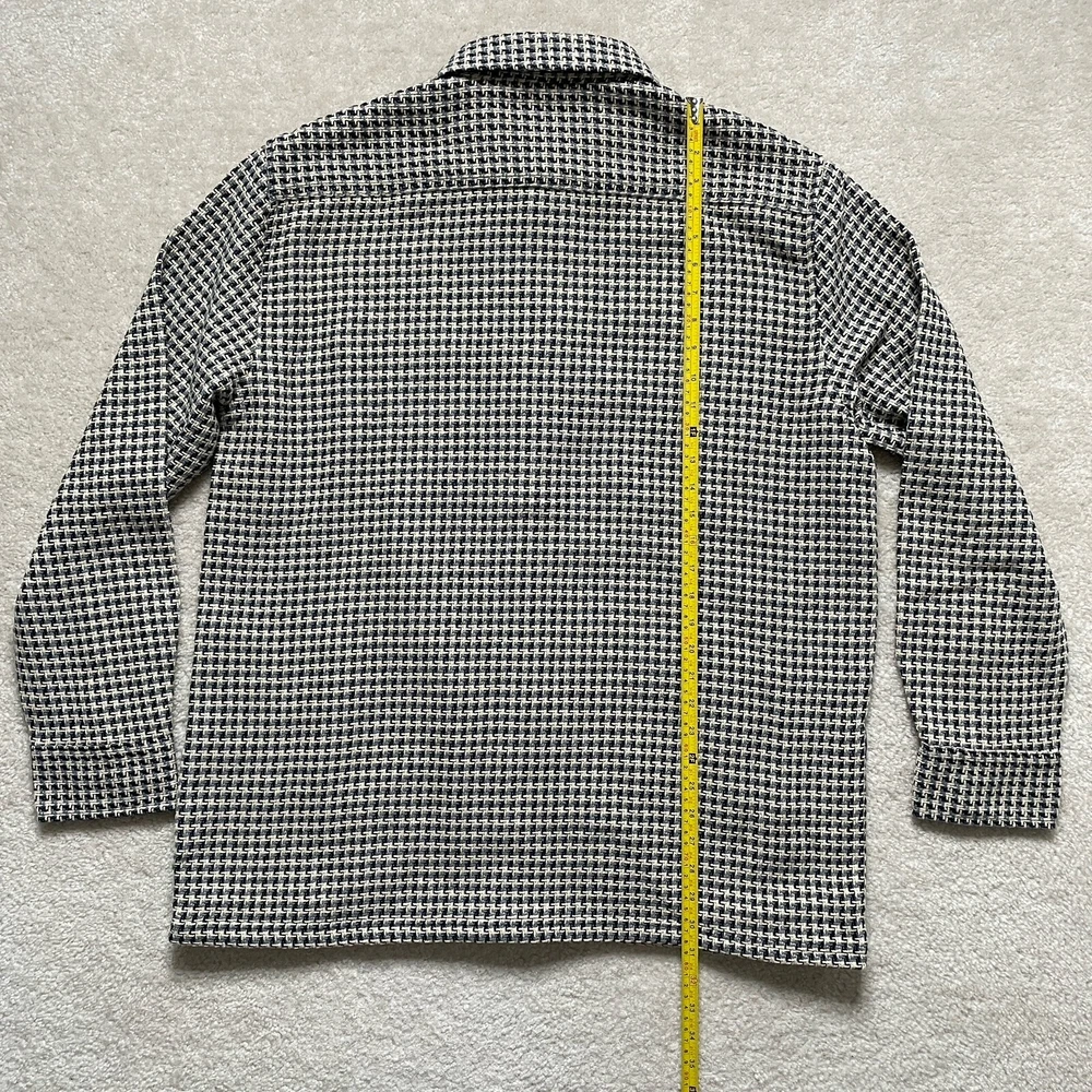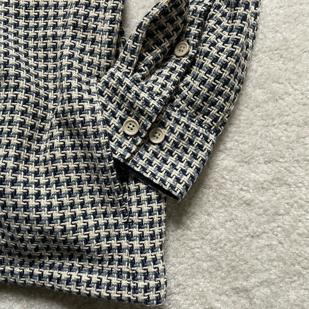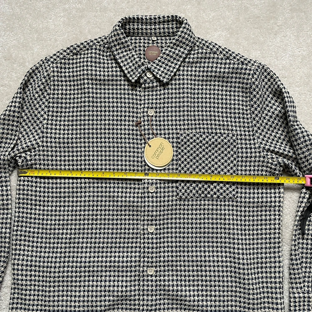 Elevate your style with the Common People Granby Luxe Hybrid Overshirt in the James Navy/Blue pattern. This versatile button-up shirt features a herringbone design and long sleeves with a spread collar style. Made with a combination of polyester, nylon, rayon, cotton, wool, and acrylic, this knit fabric is machine washable for easy care. The shirt comes in a size XL and has pockets for added convenience. Perfect for any occasion, this shirt is a must-have for any fashion-forward individual. Please review photos for details, measurements and condition