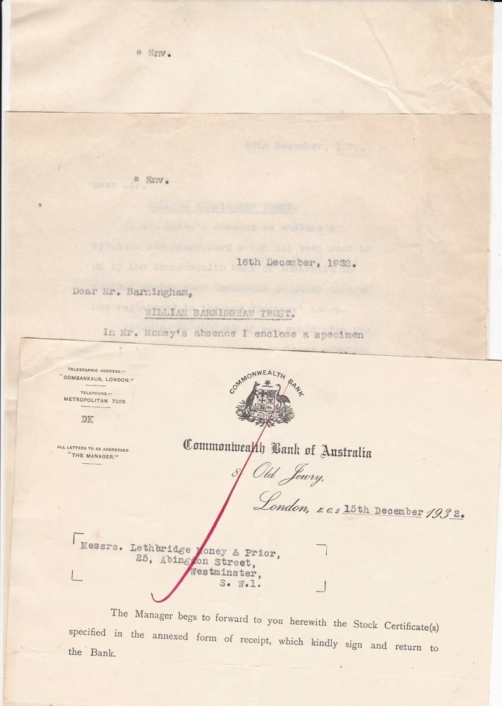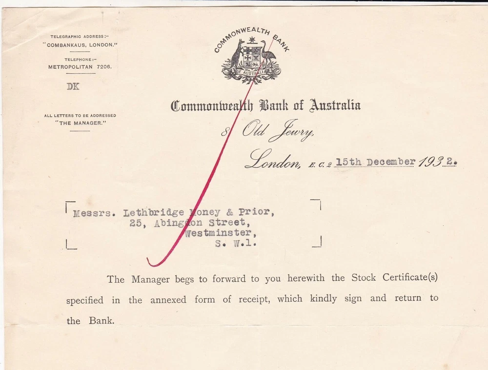 Commonwealth Bank of Australia 1932 Stock Letter & Signature Replys Ref 46420