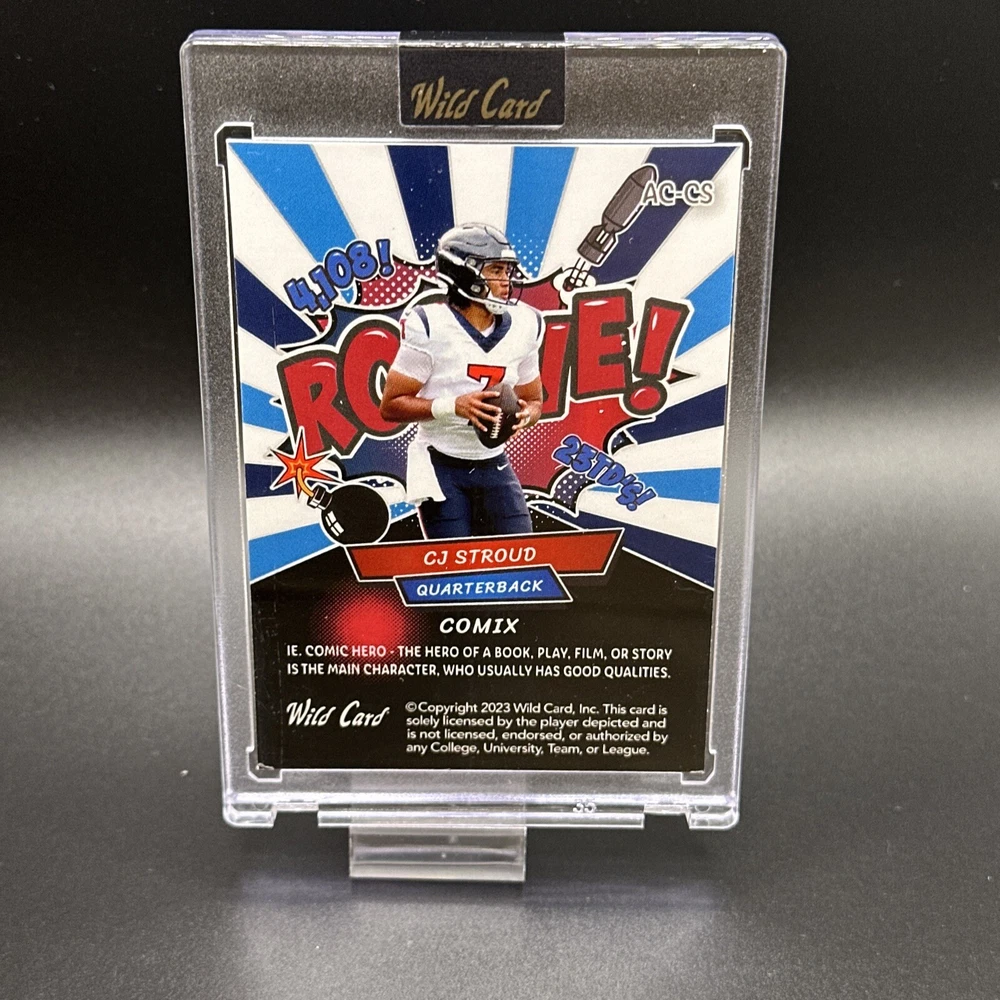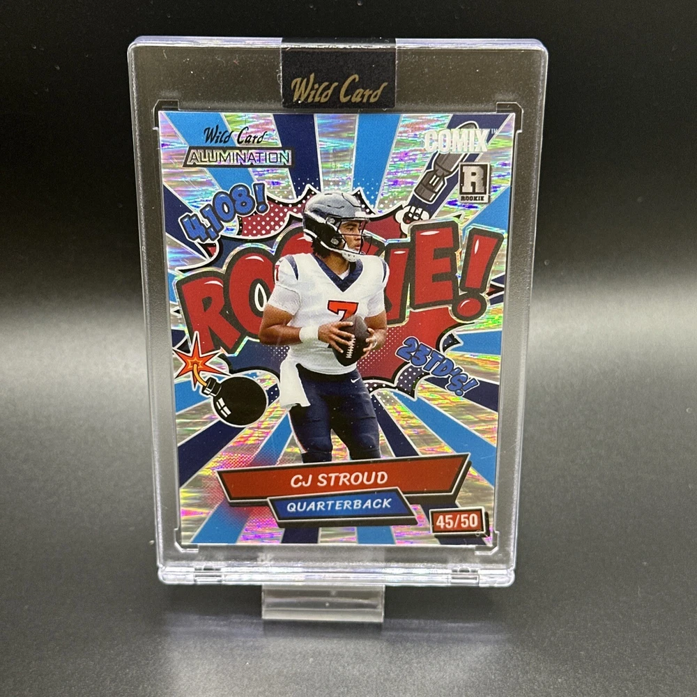 This 2023 CJ Stroud Wild Card Alumination Rookie /50 card is a must-have for any serious collector. With a limited print run of only 7, this rare card features the talented quarterback from the Houston Texans. The card is in near mint or better condition and is a great addition to any NFL collection. The card is from the 2023 Wild Card Alumination set and is a standard size sports trading card. Although not autographed, it is still a valuable item for fans of the sport. Whether you're a collector or just a fan of the game, this card is a great way to commemorate the 2023 Super Bowl. Get your hands on this rare card today! Free shipping. Please see picture for conditions of the card you will actually be receiving. Message with any questions. Thank you!