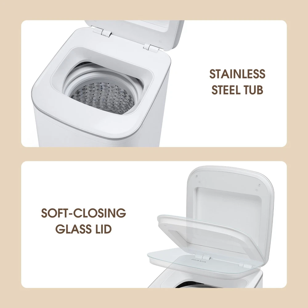 【Compact Design】 The Portable Washing Machine measures 16.53 x 17.91 x 28.5 inches, only utilizing under 2.15 sq. ft. of floor space. One tub serves both washing and spinning functions. Requiring minimal storage space, this compact washer is ideal for small spaces like dorms, apartments, and RVs. 【Full Automatic Functionality】 The Mini Washing Machine is fully automatic and finishes the washing task with the press of a button, freeing you from daily handwashing. It offers 8 wash programs and 4 water level settings designed for various needs, and is able to perform a spin-dry task alone. 【Quality Materials & Elegant Design】 The Portable Washing Machine uses stainless steel on its tub for durability and easy maintenance. The top lid is made of reinforced glass with a soft-close mechanism to deliver a better user experience. Touch-sensitive buttons as well as an LED display indicating the remaining time adds to the elegant appearance. 【Thoughtful Features】 The Washer allows a 24-hour delay for the start of a wash cycles to suit your schedule. Run the machine during off-peak hours to save on the electricity bill. The Child Lock helps to freeze the control panel to ensure it keeps running smoothly. The Tub Clean program activates a thorough cleaning process from the inside out to ensure consistently good washing performance. 【Quality Control Note】 Each unit of undergoes manufacturer's rigorous quality tests to guarantee full functionality, so having a little amount of residual water in the unit is NORMAL. provides a one-year warranty for all new units. If you have any questions about the product, please feel free to contact us and we will try our best to help you! 【8 Wash Program Options】 The compact washer offers 8 wash programs, including Normal, Quick, Gentle, Heavy, Soak, Rinse & Spin, Spin, and Tub Clean, and they operate with 4 water level settings, quietly at less than 60 dB. 【Package Contents】 1 x T01 Washing Machine, 1 x User Manual, 1 x Water Supply Hose, 1 x Drain Hose, 1 x Protective Bottom Plate, 2 x Screws. 【Note for Draining】 The T01 does not drain upwards. Please make sure that the drain hose lies flat on the floor and no part of the drain hose is more than 4 inches above the floor.