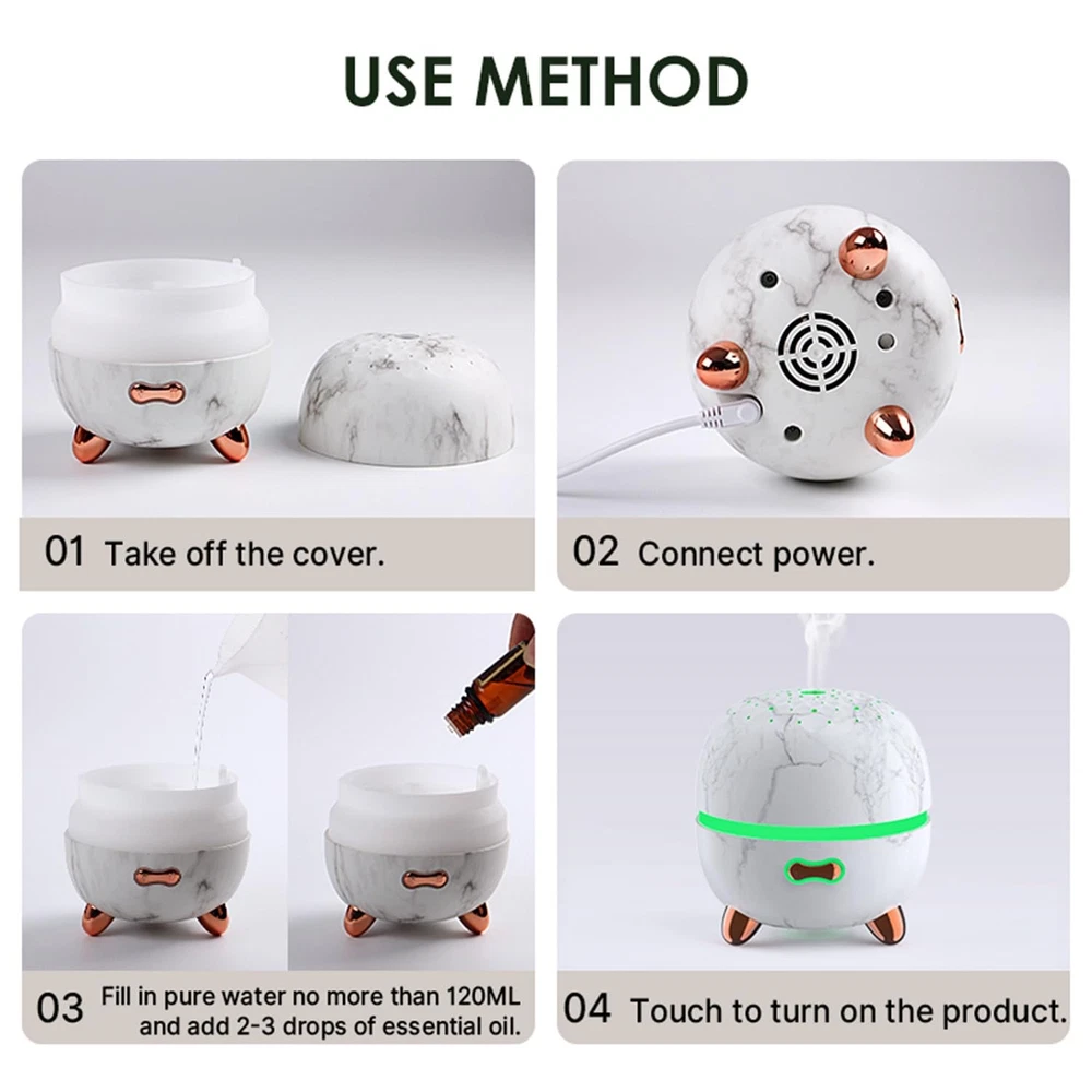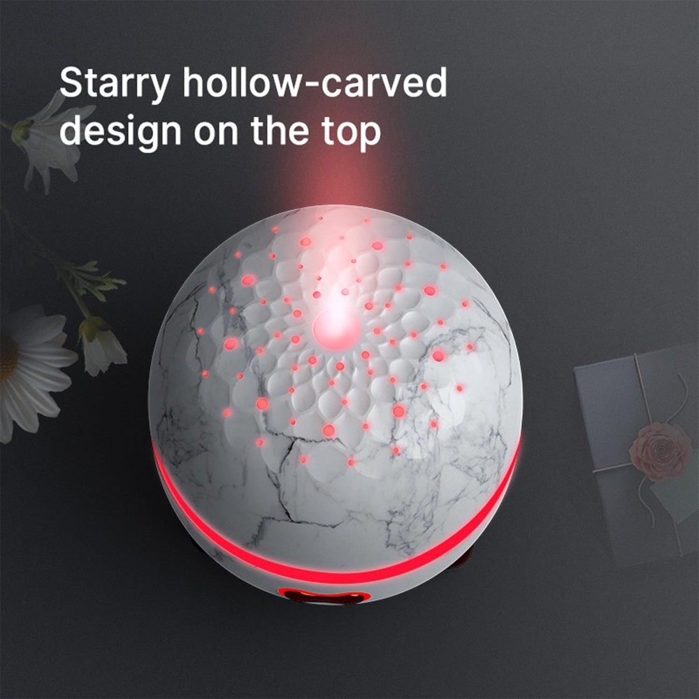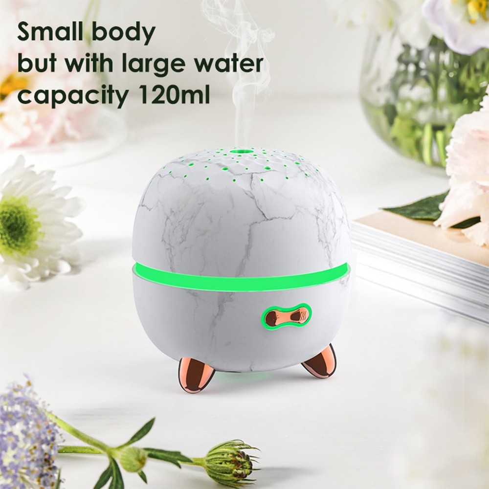 Essential Oil Diffuser, 120ml Small Aromatherapy Diffuser, Ultrasonic Diffusers for Essential Oil, Cool Mist Humidifier with 7 Color LED and Auto Off Safety, for Bedroom,Office, study room 120ML SMALL OIL DIFFUSER: The small oil diffuser has a capacity of 120 ml and comes with 7 different colors of LED breathing lights. The compact body saves space, making it perfect for keeping one on your desk. The mini oil diffuser can be used continuously for 10 hours and is equipped with a safety automatic switch that will automatically turn off when there is a lack of water. NOISELESS AND QUIET MODE: The mist and light functions of this aromatherapy diffuser work separately, you can turn off the light at night while sleeping. The ultrasonic diffuser uses noise reduction technology, operates quietly and has no dripping sound, creating a quiet and soothing environment for relaxing, studying, working and sleeping. PERFECT FOR DIFFERENT OCCASIONS: This essential oil diffuser is perfect for every home, office ,bedroom or yoga studio so you can create a calming atmosphere. This device will moisturize the air so you can enjoy humidity during the dry winter months. It can be used as a humidifier or as a room air freshener. UNIQUE ART DECORATIVE DESIGN: Essential Oil diffuser features an ultra-modern marble grain design has an elegant starry pattern cover that perfectly matches any decorative style. BPA free material, the diffuser is made of finest PP material, which is safe for your baby and pets. STYLISH GIFT: This mini aromatherapy diffuser makes a great and valuable gift for your friends and family. We provide one year warranty, no need to worry about the quality, your satisfaction is paramount.