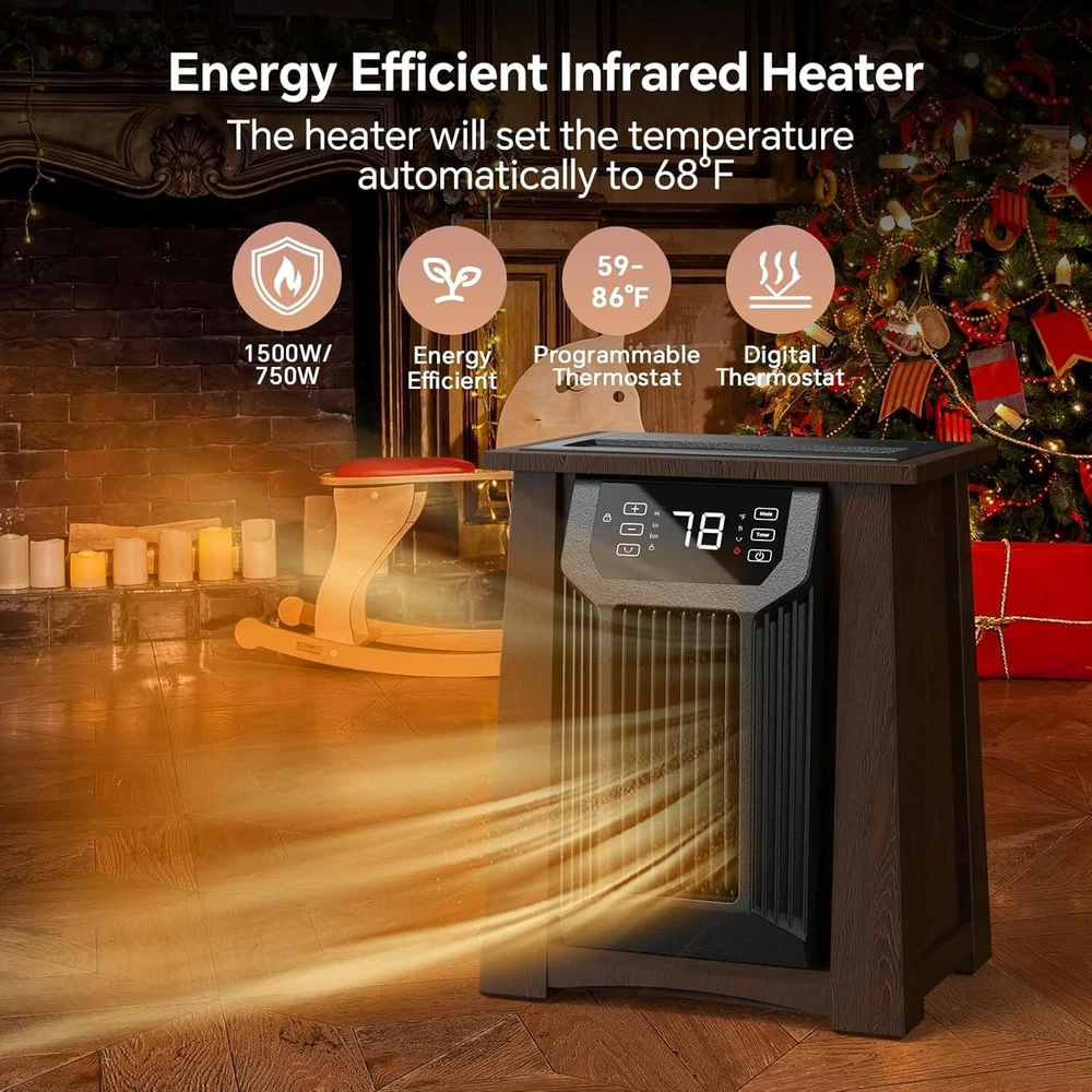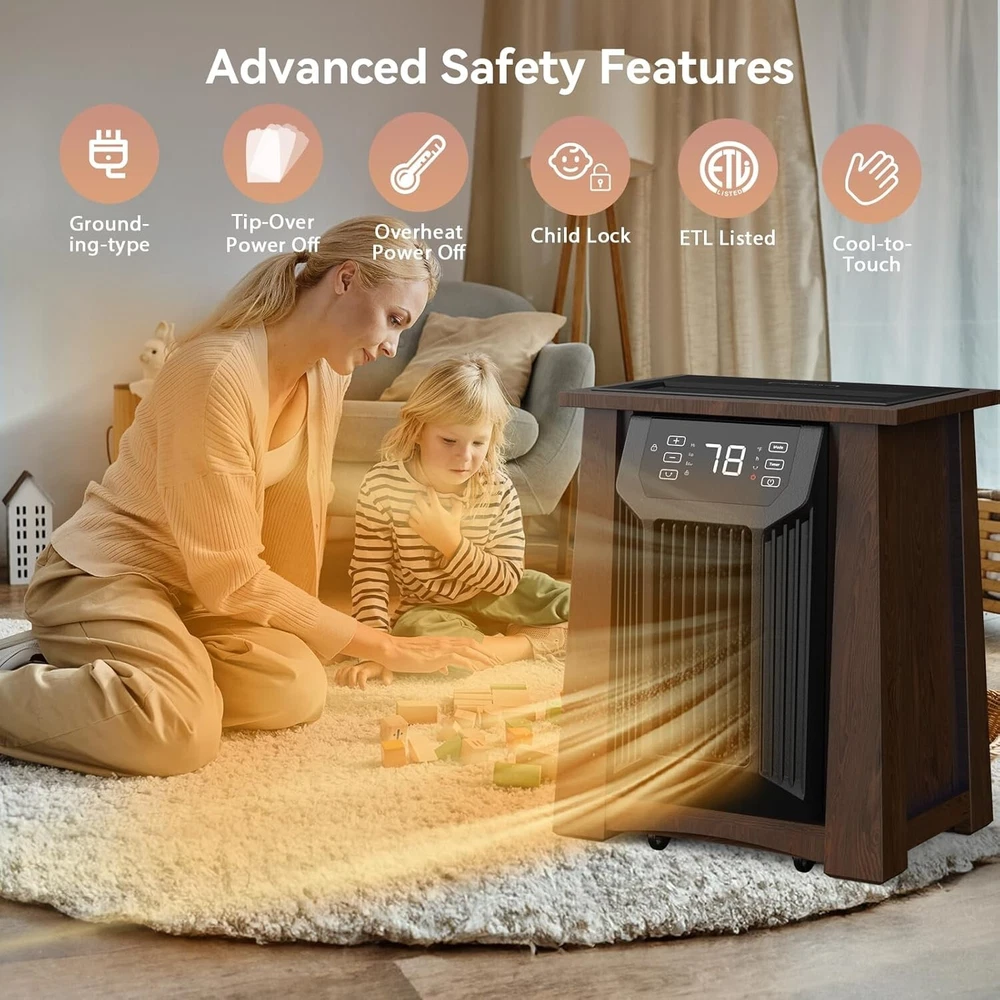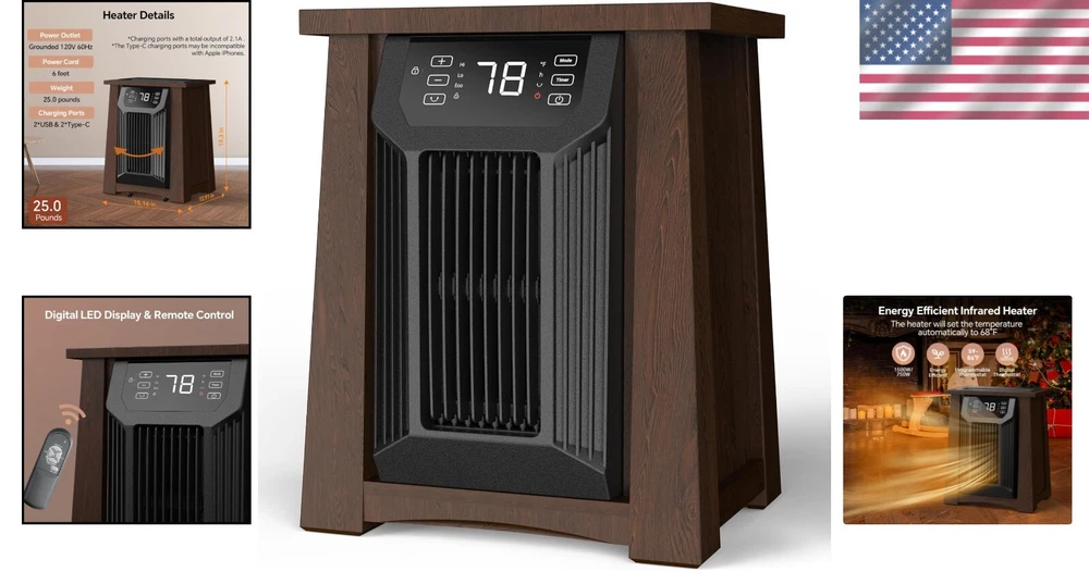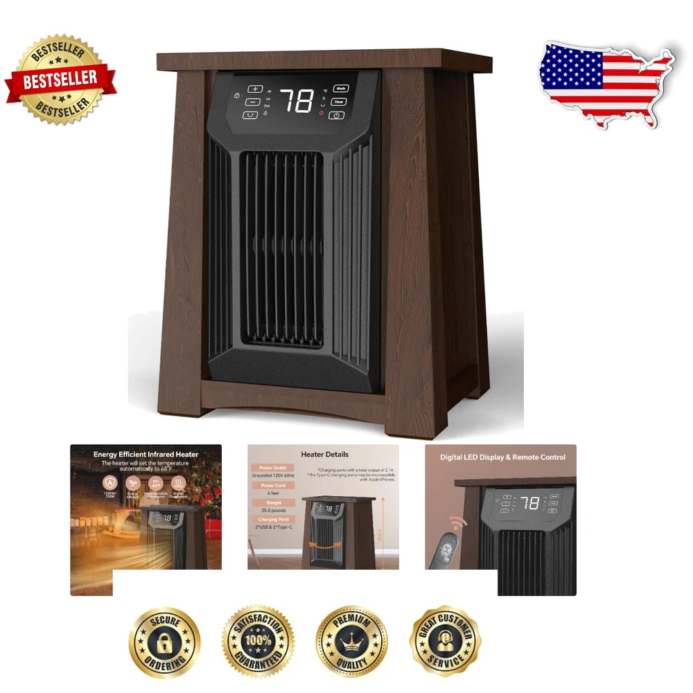 Compact 1500W Infrared Heater with Child Safety Lock & USB Ports - Walnut Finish