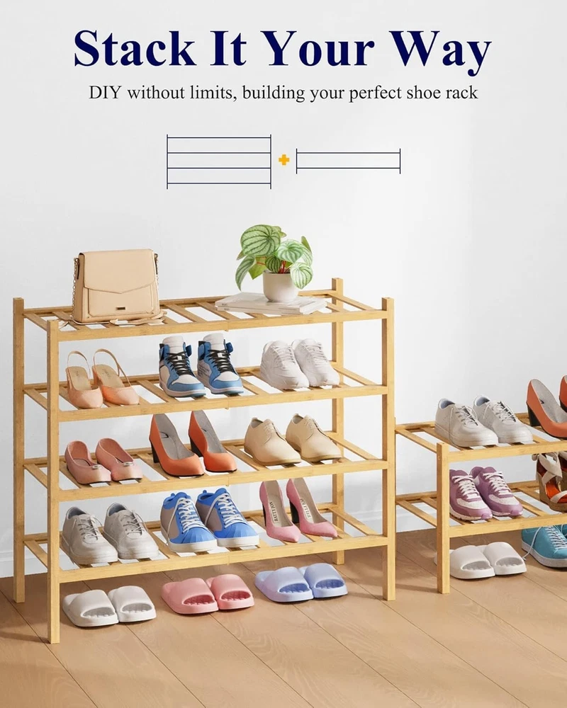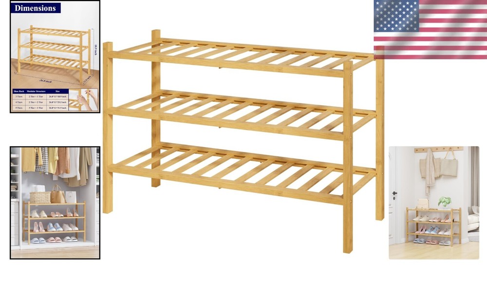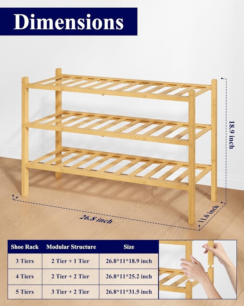 Special Feature: Stackable Features: Bamboo Shoe Rack Item Height: Bamboo Shoe Rack Capacity: 6-10 pairs gtin13: Does not apply Product Dimensions: 11"d X 26.8"w X 18.9"h Age Range (description): No Age Limit Installation Type: Freestanding Room Type: Garage, Dorm Room, Closet, Bedroom, Living Room Number in Pack: 1 Furniture Finish: Natural Bamboo Brand: Unbranded Included Components: Hardware Number of Items in Set: One-Piece Finish Type: Unfinished UPC: Does not apply Care Instructions: Hand Wash Only Item Weight: Less Than 5 lb Color: Natural Number of Compartments: 3 Mounting: Free Standing Number of Drawers: 0 Number of Shelves: 3 Type: Shoe Rack Material: Bamboo, Metal Item Depth: 11 in Item Width: Bamboo Shoe Rack Style: Modern Finish: Unfinished Size: 26.8" X 11" X 18.9" Unit Count: 3.0 Count Item Length: Bamboo Shoe Rack