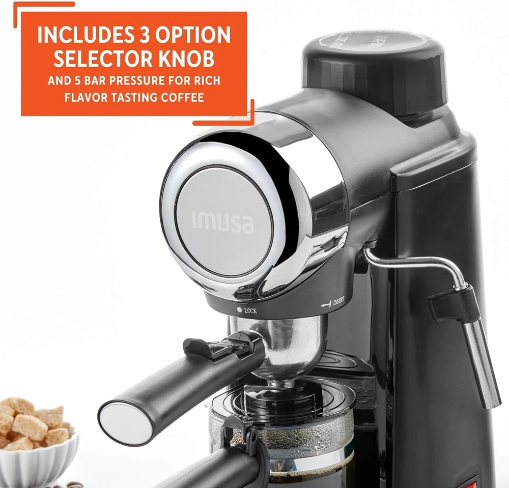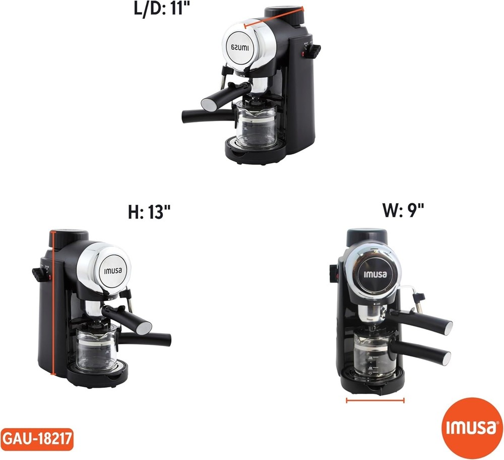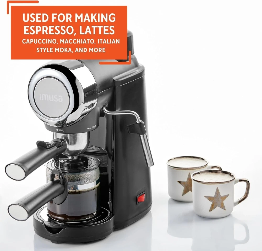 Power: 800 W Included Components: Carafe, Espresso Machine, Spoon Item Type Name: Electric Espresso Maker UPC: Does Not Apply gtin13: Does Not Apply Type of Coffee Made: Espresso, Cappuccino, Latte, Macchiato, Italian style Moka Item Dimensions D X W X H: 8"d X 10"w X 12"h Compatible Capsule/Pad System: Electric Espresso Maker Other Special Features Of The Product: Manual Wattage: 800 Watts Human Interface Input: Buttons Unit Count: 1.0 Count Color: Black Style: Modern Number of Cups: 4 Type: Espresso Machine Capacity: 4 Cups Item Depth: 8 in Control Panel: Buttons Specific Uses For Product: Espresso, Cappuccino, Macchiato, Latte Model: Electric Espresso Maker Material: Metal Voltage: 120 V Coffee Type: Ground Coffee Item Height: 12 in Coffee Maker Type: Espresso Machine Filter Type: Reusable Operation Mode: Manual Bar Pressure: 5 bar Finish: Matte Power Source: Electrical Number Of Items: 1 Brand: Unbranded Features: Frother, Removable Drip Tray, Cool Touch Handle, Three-option Selector Knob Item Weight: 5.4 lbs Components Included: Carafe, Espresso Machine, Spoon, User Manual