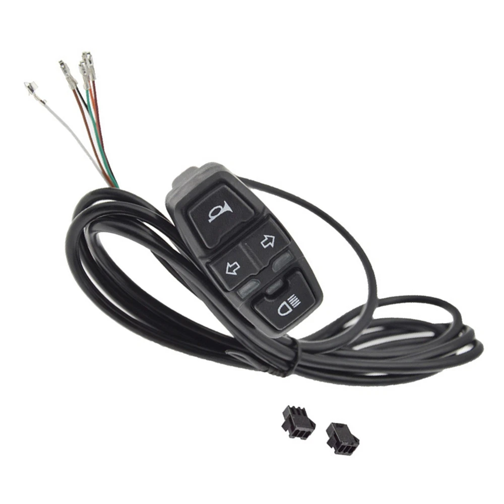 Features: *This handlebar switch is made of high-quality nylon material, strong, waterproof, sturdy and for long-term use. *The switch is small in size, easy to assemble, suitable for handlebars with a diameter of 2 cm. *Three-in- function, headlight, , turn signal switch, switch. *Compact and lightweight, perfect match with other accessories, suitable for any road bike, motorcycle, electric bike, scooter, . *The switch is easy to install-wire connection for easy access and control, bringing you a better driving experience. Specific ation: *Material:Nylon *Color:black *Size:5.4*5.4*2.7CM *Specification:36V、48V Package Contents: 1*Front light turn signal switch Note: 1. The real color of the item may be slightly different from the pictures shown on website caused by many factors such as brightness of your monitor and light brightness. 2. Please allow slight manual measurement deviation for the data.