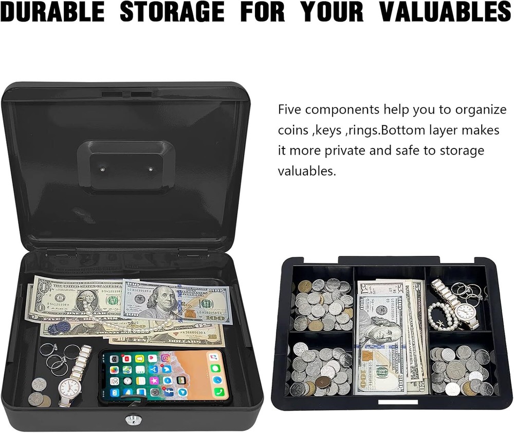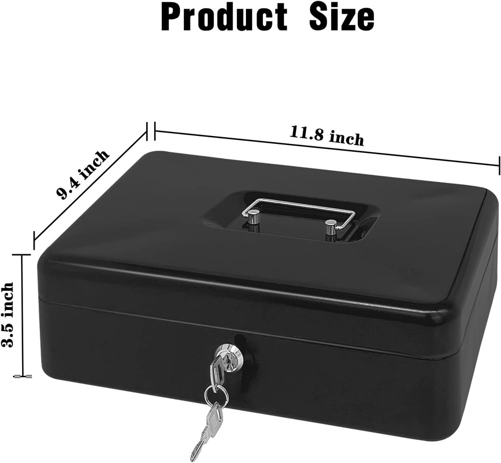 Steel Cash Box with Key Lock, Metal Small Money Black - 11.8" x 9.4" x 3.5" Product Details Brand: PACOLO Product Dimensions: 5.9"D x 3.1"W x 4.7"H Lock Type: Key Color: Black - 11.8" x 9.4" x 3.5" Material: Alloy Steel, Metal Special Feature: Key Lock Mounting Type: Floor Mount Control Type: Key Control Included Components: Stainless Steel, Alloy Steel, Plastic, Metal Water Resistance Level: Not Water Resistant Chamber Depth: 5.9 Inches Chamber Width: 12 Inches Manufacturer: PACOLO Part Number: Steel Cash Box with Key Lock Item Weight: 3.21 pounds Country of Origin: China Item model number: Steel Cash Box Style: Classic Special Features: Key Lock Batteries Included?: No Batteries Required?: No Brand: PACOLO Product Dimensions: 5.9"D x 3.1"W x 4.7"H Lock Type: Key Color: Black - 11.8" x 9.4" x 3.5" Material: Alloy Steel, Metal Special Feature: Key Lock Mounting Type: Floor Mount Control Type: Key Control Included Components: Stainless Steel, Alloy Steel, Plastic, Metal Water Resistance Level: Not Water Resistant Size and Color: Exterior dimensions: 11.8 inch x 9.4 inch x 3.5 inch; Four colors(Black, White, Red, and Blue) are available for you to choose from. Key Lock: This cash box has a key lock to keep valuables safe. The key is easy to operate and can be opened with one hand. Removable Tray: This cash box has a removable tray with six compartments for excellent coin organization and a layer underneath the tray for storing cash and checks. Highly Quality: This solid steel cash box does not fear knocks and shocks.Suitable for storing bills, coins, checks, and receipts. The lock box is lightweight with a convenient handle, so you can take it anywhere and hide it easily. Wide Application: This money box with a key is suitable for indoor or outdoor small businesses, commercial supermarkets, stores, lockers, cabinets, and family use. It is also a perfect gift for your friends and family for birthdays, Mother’s Day, or Christmas. Suitable for storing bills, coins, checks, and receipts.