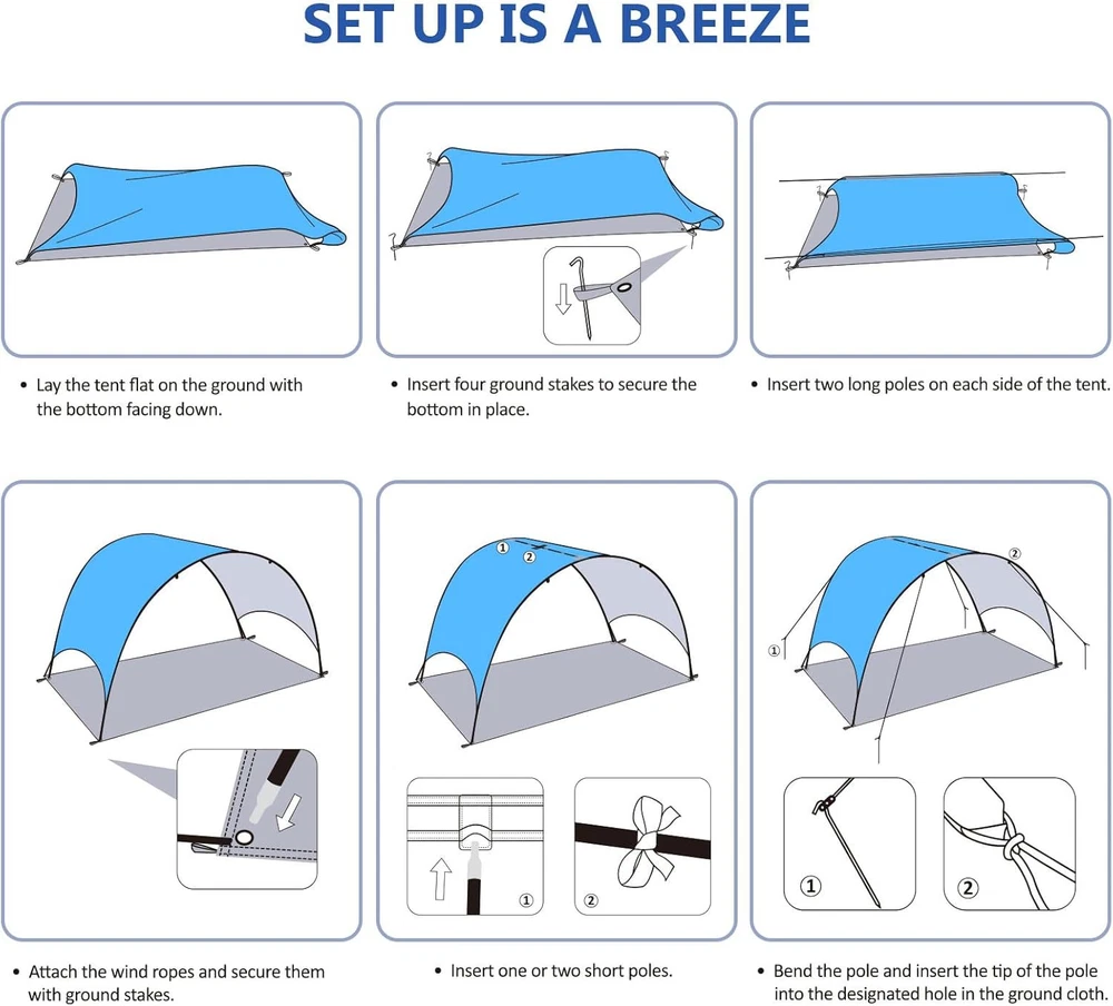 Beach Tent - Shade Canopy Compact Fold 90.5*59*53″, Blue Product Details Brand: Flycoop Color: Blue Recommended Uses For Product: Beach tent Product Dimensions: 86"L x 59"W x 51"H Ultraviolet Light Protection: YES Frame Material: Fiberglass Water Resistance Level: Water Repellent Assembly Required: No Item Weight: 5.15 pounds Manufacturer: Flycoop Country of Origin: China Item model number: FLY-tent-03 Ultra-Compact & Portable Beach Tent: This beach tent folds down to just 16.9x3.9″, making it one of the most portable beach shade canopies on the market. Designed for travelers, beach lovers, and outdoor enthusiasts, it easily fits into your backpack or luggage, allowing you to enjoy comfortable shade wherever you go! Flycoop beach tent unique patent design evaluate your experience like never before. ️ 360° Ventilation Design und Large Storage Pocket: The innovative 360° ventilation design ensures the tent stays cool and airy even in hot weather, allowing air to circulate freely for a refreshing experience. Flycoop Beach Tents includes a large side pocket (on one side only) for easy storage of essentials like your phone, sunscreen, books, and more. Keep everything within reach and enjoy a hassle-free beach day. ⏱️ Quick & Easy Set up Beach Tent: Say goodbye to complicated setups! This beach tent features a simple design that sets up in just a few minutes without any tools or complicated instructions. Please follow the steps in the video or instructions to install it to avoid strong winds on the beach affecting the installation efficiency. Additionally, the beach tent uses silver-coated fabric with UPF 50+ UV protection, offering superior sun protection. Multiple sizes available: With multiple size choices, find the perfect fit for your needs: the 90.5*59*53″ option comfortably fits 3 people, while the 106*65*61″ is perfect for 4. You can also opt for the sail (90.5*59*53″+ 74.8*74.8″ sail or 106*65*61″+ 74.8*98.4″ sail ) to add extra shade, and with the gentle breeze, the sail will flutter naturally, adding a cool and pleasant touch to your outdoor experience. ⛓️ Ground Stakes & Innovative Structure (Sail Version): The beach tent comes with sand anchors and wind ropes to securely fasten it in place, whether at the beach or park. Please note that the beach tents (with sail version) to provide additional shade. The unique structure allows the sail to be secured to the ground, offering extra shade while effectively reducing wind noise. This design enhances your comfort and creates a visually appealing addition to your outdoor adventure. Please note that this beach tent features a 360-degree ventilation design and is made of high-quality materials for enhanced stability, making it slightly heavier than standard tents. The smallest model weighs 4.7 pounds, which is roughly equivalent to the weight of six 12-ounce cans of soda.