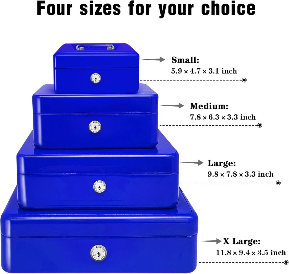 Steel Cash Box with Key Lock, Metal Small Money Blue - 7.8" x 6.3" x 3.3" Product Details Brand: PACOLO Product Dimensions: 5.9"D x 3.1"W x 4.7"H Lock Type: Key Color: Blue - 7.8" x 6.3" x 3.3" Material: Alloy Steel, Metal Special Feature: Key Lock Mounting Type: Floor Mount Control Type: Key Control Included Components: Stainless Steel, Alloy Steel, Plastic, Metal Water Resistance Level: Not Water Resistant Chamber Depth: 5.9 Inches Manufacturer: PACOLO Part Number: Steel Cash Box with Key Lock Item Weight: 1.72 pounds Country of Origin: China Item model number: Steel Cash Box Style: Classic Special Features: Key Lock Batteries Included?: No Batteries Required?: No Brand: PACOLO Product Dimensions: 5.9"D x 3.1"W x 4.7"H Lock Type: Key Color: Blue - 7.8" x 6.3" x 3.3" Material: Alloy Steel, Metal Special Feature: Key Lock Mounting Type: Floor Mount Control Type: Key Control Included Components: Stainless Steel, Alloy Steel, Plastic, Metal Water Resistance Level: Not Water Resistant Size and Color: Exterior dimensions: 7.8 inch x 6.3 inch x 3.3 inch; Four colors(Black, White, Red, and Blue) are available for you to choose from. Key Lock: This cash box has a key lock to keep valuables safe. The key is easy to operate and can be opened with one hand. Removable Tray: This cash box has a removable tray with six compartments for excellent coin organization and a layer underneath the tray for storing cash and checks. Highly Quality: This solid steel cash box does not fear knocks and shocks.Suitable for storing bills, coins, checks, and receipts. The lock box is lightweight with a convenient handle, so you can take it anywhere and hide it easily. Wide Application: This money box with a key is suitable for indoor or outdoor small businesses, commercial supermarkets, stores, lockers, cabinets, and family use. It is also a perfect gift for your friends and family for birthdays, Mother’s Day, or Christmas. Suitable for storing bills, coins, checks, and receipts.