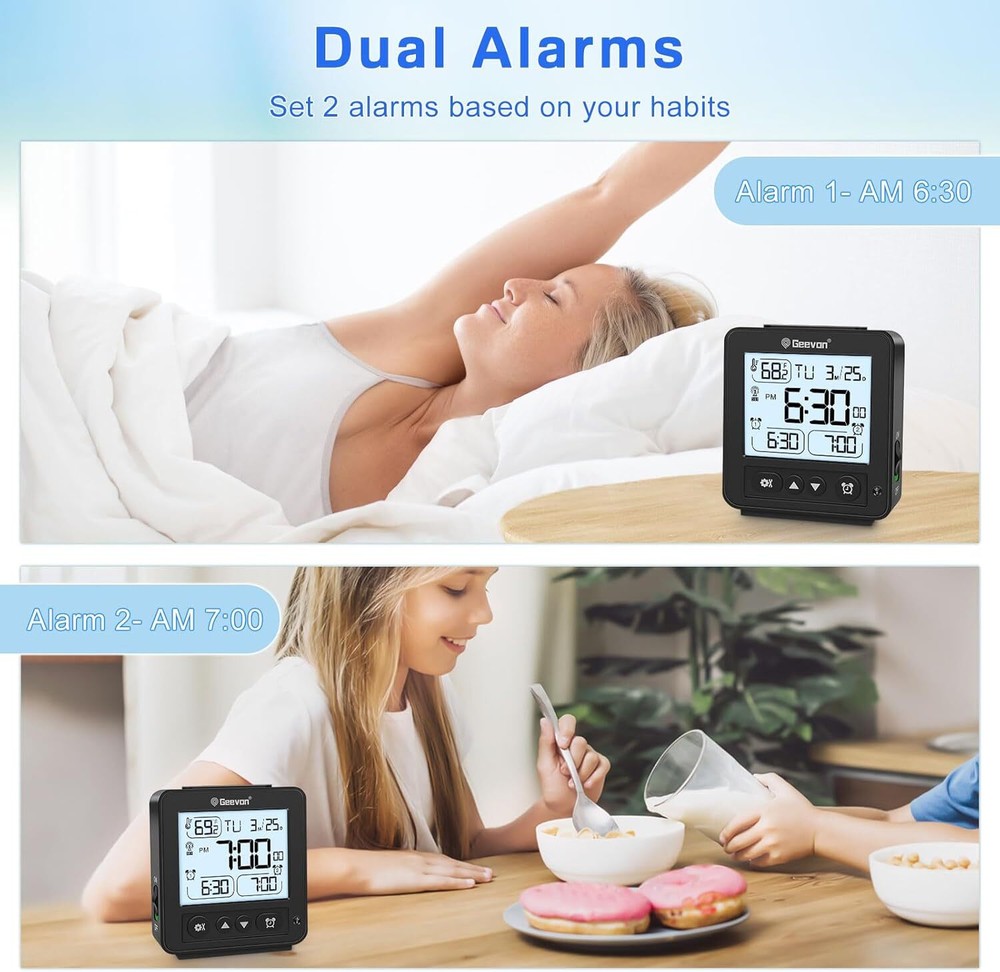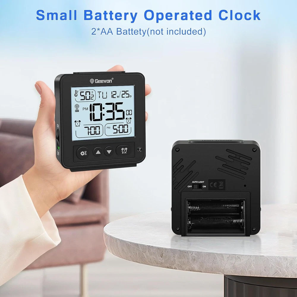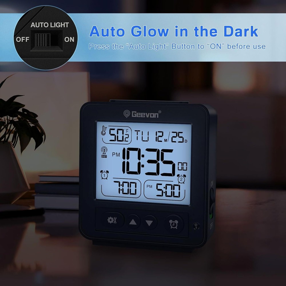 [Reliable RCC Time Sync for Accurate Timekeeping] Automatically syncs with RCC signals at 1:00 a.m., 2:00 a.m., 3:00 a.m., 4:00 a.m., and 5:00 a.m. Ensure your time zone is set correctly for precise updates. Manual syncing is also available by holding the “down” button for 2 seconds [Dual Alarms for Flexible Scheduling] Set two different alarms to match your daily routines or multiple schedules. This feature is suitable for couples, families, or anyone who needs separate wake-up times, making mornings easier and more convenient [Auto Light Function for Nighttime Convenience] The "Auto Light" button activates a soft blue glow in the dark, providing clear visibility of the time without being too bright or disruptive during sleep [Compact & Travel-Friendly Design] With a size of just 3.5"x3.8"x0.98", this portable alarm clock is easy to pack and carry, making it a perfect travel companion or a space-saving solution for bedside tables [8-Second Backlight for Quick Visibility] A simple press of the top button activates the backlight, which stays on for 8 seconds, allowing you to check the time easily in dim or dark conditions