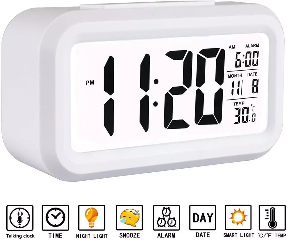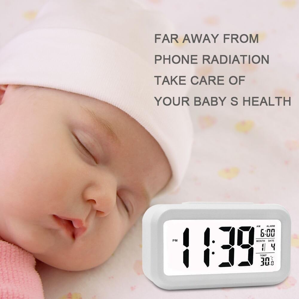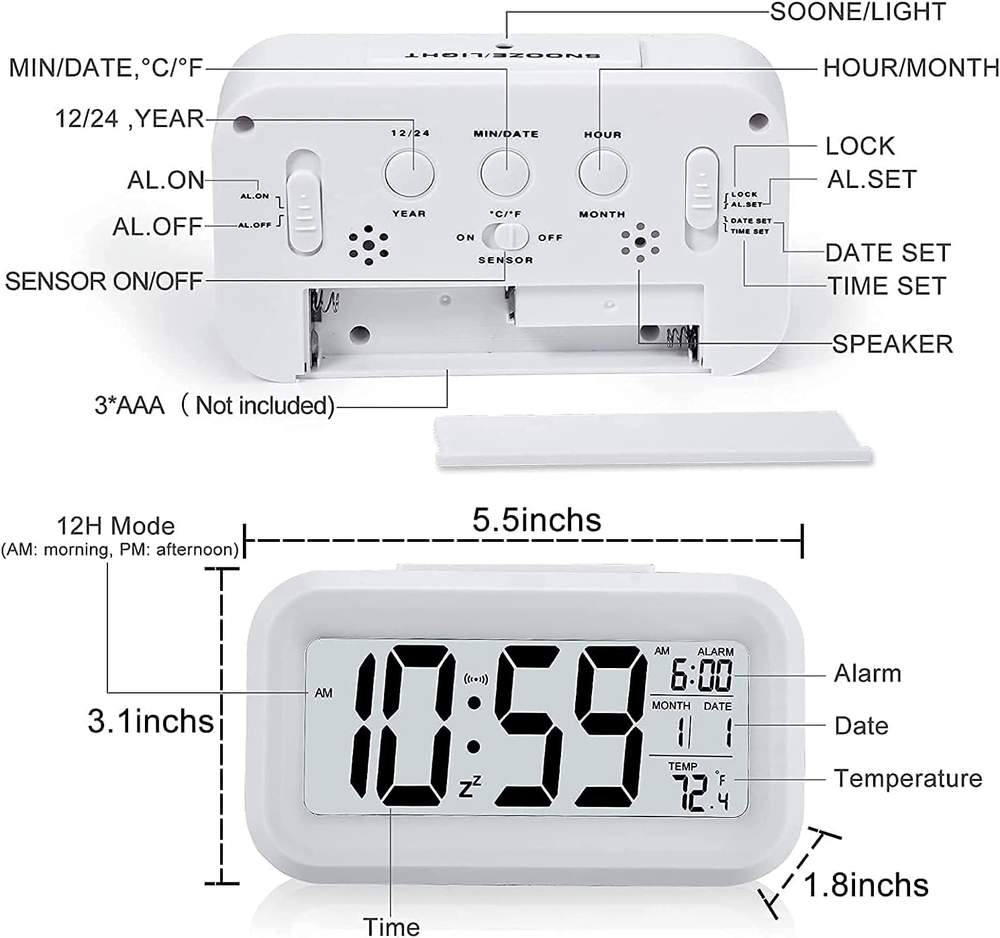 The product is a small, battery-operated digital alarm clock with a rectangular shape and a tabletop mounting type. It features a white color, a digital display, and special features like an alarm, temperature display, and night mode. The clock is designed for indoor use and displays the time in a small, digital format. Made of plastic, it weighs 5.6 ounces and is suitable for adult use. Additionally, it does not come with batteries included. About this item 【Larger Numbers】The digital alarm clock measures 5 1/4 (L) * 2 (W) * 3 (H) inches, small and light. The small clock face is utilized HD LCD screen, can be read easily 【Alarm Clock Battery Operated】This alarm clock is powered by 3 xAAA batteries only (not included), which can keep Constantly Big 4.5'' LED digit time display for more than 6 months. Battery operated (no cords) allows it to be used anywhere you need a clock 【Smart Nightlight 】The digital alarm clock features a night light ,this alarm clock can not only be used as a night light to help parents take care of their children better and makes the room cozy, but also make it easier to check the time in the dark 【Extra Loud Alarm Clock】 This alarm clock has a gradually faster beep noise which continues for 90 seconds. Before the alarm stops itself, top snooze button can be continually pressed to get an extra 8-minute nap.It doesn’t matter how much of a heavy sleeper you are 【Regular Features】Includes snooze time (5 minutes), 12/24 hour time format, calendar, and Indoor Temperature(°C or °F), easy for kids, teens to use, basic bedroom bedside table desk gift alarm clock Product Description Digital Alarm Clock Battery Operated
