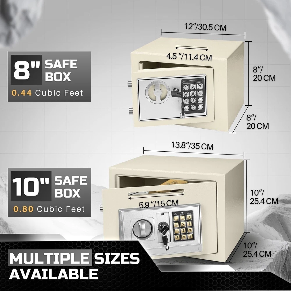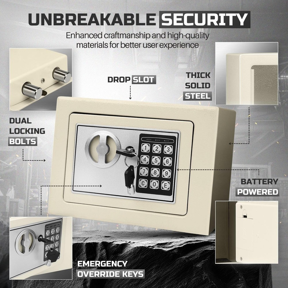 The small money drop slot is the perfect solution for secure storage at home, in the office, or for business use. Designed as a money drop box with lock and slot, it allows hassle-free deposits without needing to open the safe, making it an excellent cash drop box for business operations or cash handling tasks. This cash drop safe features a digital keypad with reprogrammable access codes, offering keyless convenience and enhanced security. Built to resist tampering, this security safe box is equipped with live-door bolts and concealed hinges for superior protection. With over 550 cubic inches of storage capacity, this is ideal for safeguarding your valuables, including cash, important documents, and jewelry. Its compact design and adjustable shelf make it versatile, functioning as a drop box safe, a safe deposit box for home, or even a hotel safe. For added convenience, this electronic safe includes emergency override keys and mounting hardware, allowing secure installation on floors, walls, or shelves. Protect your valuables with this reliable and durable, crafted to deliver peace of mind and security in any setting. Specification: Operation: Digital PIN or Override Key Dimension: 12" x 8" x 8"(W x D x H ) Material: Solid Steel Color: White Package Content: 1x Small Safe Box with Drop Slot - Electronic Drop Safe Box for Money with Digital Combination Keypad Lock - Cash Safe Box for Cabinets, Home & Office Security (12"x8"x8"), White Secure and Durable Design: This cash safe box with drop slot offers over 550 cubic inches of secure interior storage space, perfect for safeguarding legal documents, jewelry, passports, cash, and other valuables. Ideal as a money safe for cash Reprogrammable Digital Access: Safe with code features a customizable 8-digit digital code for easy, keyless entry and enhanced security with a lockout mechanism after multiple incorrect PIN entries. Designed as a safe with drop slot, its perfect for securely storing cash, documents, and valuables Emergency Access with Override Keys: Includes 2 override keys to access your hotel safe or drop safe for business even if the code is forgotten or batteries run out Tamper-Proof Design: Built with solid steel, this safety deposit box for home features live-door bolts and concealed hinges to resist tampering, ensuring the safety of your valuables and serving as a reliable safe for money Adjustable and Mountable Design: This small safe box includes an adjustable shelf and mounting hardware, allowing you to secure it to a wall, floor, or shelf for added protection and convenience. Perfect as a small money safe to keep your valuables organized and secure