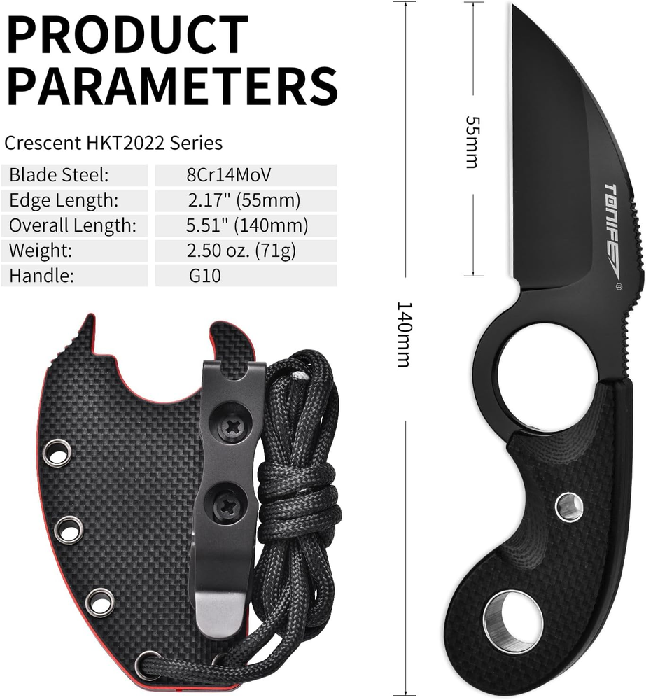 Small Knife with Sheath: TONIFE Crescent is a perfect small fixed blade knife suitable for your EDC equipment; The total length is 5.51 inches. Lightweight EDC Knife: EDC knife is a great everyday carry knife; It can be used as a belt knife or pocket knife, and you can quickly remove this small knife from the sheath to prepare from time to time. Full Tang Fixed Blade Knife: Durable 8Cr14MoV stainless steel construction handles a variety of work tasks as a backup knife; Full tang blade makes the knife more durable. Fixed Blade Knife with Textured G10 Handle: The G10 handle of the fixed blade is in line with the design of ergonomics. It has the characteristics of durability, weather resistance, and excellent grip. It is easy to maintain Fixed Blade Knife Sheath -Sheath is made of G10. The solid and lightweight G10 sheath can ensure excellent protection for the blade. The adjustable sheath clip design allows the small knife to be clipped to a belt, boots, pocket, or thin collar for easy carrying. Product Description TONIFE Crescent Full Tang Knife This full-tang knife is very suitable for outdoor work. It can be used as an EDC fixed blade knife, camping knife, belt knife and self-defense knife. The sheath design can protect the blade at any time, so you have a sharp knife. HKT2022 Series Blade steel: 8Cr14MoV Blade length: 2.17" Total length: 5.51" Weight: 2.5oz.(71 g) Handle: G10 Color: Black/Green/Warm Sand Sharp Blade The blade of this fixed blade knife is designed with 8Cr14MoV stainless steel, which is not easy to rust, stain-resistant, sharp, and not easy to break. It is no problem to cut ropes, cut branches, and cut fruits during outdoor activities. It is a good helper for outdoor activities that can be used with confidence. G10 Handle This knives for men features a G10 handle that is durable, weatherproof, has a strong grip, is lightweight, and is easy to maintain, allowing it to be used for long periods of time without causing discomfort to your hands. Knife Sheath Clip The belt knife is equipped with a knife sheath clip. The removable knife sheath clip design can easily clip the pocket knife to a thin collar, pocket, wallet, or pants, allowing you to carry it with you and not easily lose it. Knife Sheath The knife comes with a knife sheath and a rope. The knife sheath can protect the blade at any time, making it less likely to be damaged. The rope can be used to hang the straight knife on your body at any time, which is convenient for carrying and can also prevent loss. Fixed Blade Knife With Sheath The full tang knife, the knife sheath and knife sheath clip work together to highlight its portability for outdoor activities. You can hang it on your body at ordinary times and take it out directly for use when necessary. Fast cutting It can quickly cut branches, paper, food, ropes, wood, etc. It is the best companion for outdoor survival.