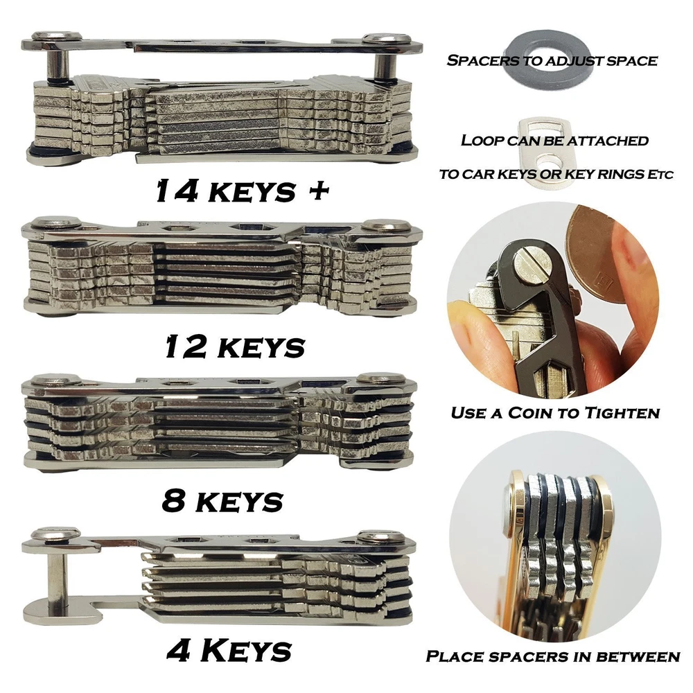 MULTI FUNCTION TOOLS – Intelligent Engineered Design equipped with three practical features all in compact machine. BOTTLE OPENER & STANDS. These tools will absolutely come in handy at your workplace, when you are travelling or at the restaurant. You do not need to buy extra accessories and still able to keep all of your keys up to 12~16. LOOP can be attached to your car keys & key rings etc. Additional expansion kit (6 spacers and 2 extension metal) included. DURABILITY – The body frame is made of significantly high impact resistant material ALLOY(Aircraft ). The Screws have Anti Loosening washers to prevent your keys from falling and safely keep all your keys together. Extremely durable body frame is 1.55mm thick, each has smooth surface and rounded edges will definitely organize all your bulky mess of keys in simple machine. FRIENDLY VIDEO USER’S GUIDE – To help you assemble your keys we provide a video assemble demonstration by sending you an with video attachment after you order purchased. For your CONVENIENT ASSEMBLY, the video instruction will be sent to you and easy step by step guide to . You don’t need to have a screw driver to assemble. You may use a bus card for immediate situation to assemble. GREAT GIFT FOR YOUR FRIENDS AND FAMILY – is neatly packaged in a luxury white sturdy box. If you are looking for a birthday gift or anniversary, is great gift idea that would give delight experience to anyone for a little gadget. We 100% Satisfaction, if for any reason you are not fully satisfied with your order, we provide a full money back.