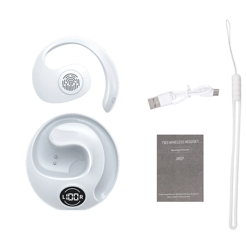 Features: Built-in Microphone, Built-In On/Off Switch, Call functions, Echo Cancellation, Extra Bass, HD Voice, Noise Cancellation, Rechargeable Battery, Replaceable Ear Tips, Replaceable Earpads, Stereo, Sweat-Proof, Waterproof, Water-Resistant, Wireless, Sweat Proof Wireless Technology: Bluetooth Standby Time: About 140 Hours Charging time: about 2 hours UPC: 883148563497 Receiving sensitivity: 120dB Number of Earpieces: Double Material: ABS+PC / Silicone Brand: Unbranded Type: Earbud (In Ear) Connectivity: Bluetooth, USB, USB-C, Type_C Bluetooth Version: V5.3 Transmission distance: 10M Time: 5 hours gtin13: 883148563497 Microphone Type: Built-In Model: JR07 Built-in Battery Voltage: 3.7 V Form Factor: Ear-hook Frequency response: 20KHz Charging box: 950mAh Year Manufactured: 2024 Earbud Battery Capacity: 60mAh
