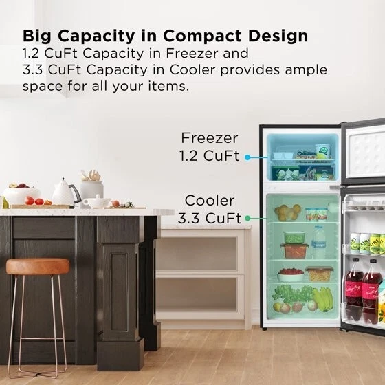 Product details TCL’s spacious 4.5 cubic foot capacity 2 door refrigerator model has separate compartments for fresh and frozen food items. With room for 2-liter bottles on the door, adjustable glass shelves, crisper drawer and freezer with wire shelf, there is space for plenty of food. Its compact size and reversible doors help this fridge fit into your space nicely. Whether at school, home or office, TCL compact refrigerators provide storage convenience and keep your foods cold and fresh Ample Food Storage – 4.5 Cu. Ft. Storage Capacity Versatile & Compact – Place TCL Mini-Fridges anywhere, whether that’s in your dorm room for quick access to food and drinks or in your living room for the ultimate entertainment experience. Reversible Door – Quickly and easily reverse the door swing Energy Star – Experience ultimate convenience in an energy-saving design. Temperature Control – Adjust the temperature to keep your drinks refreshingly cold and your food ready to heat. Frost-Free Refrigeration – Cooling design removes stall air and humidity to keep your drinks cold and frost-free