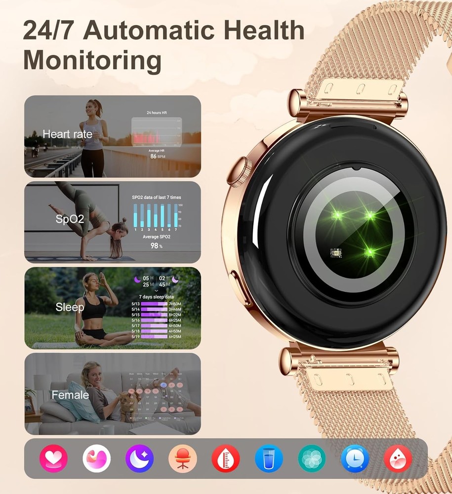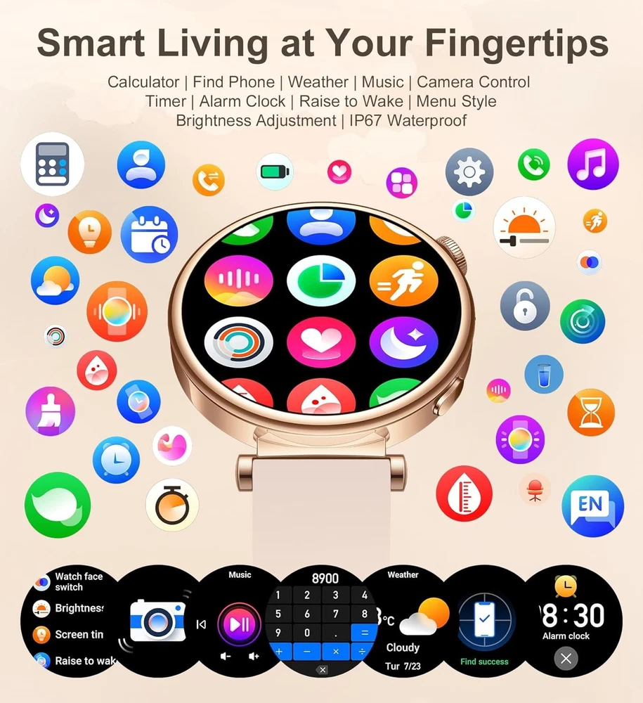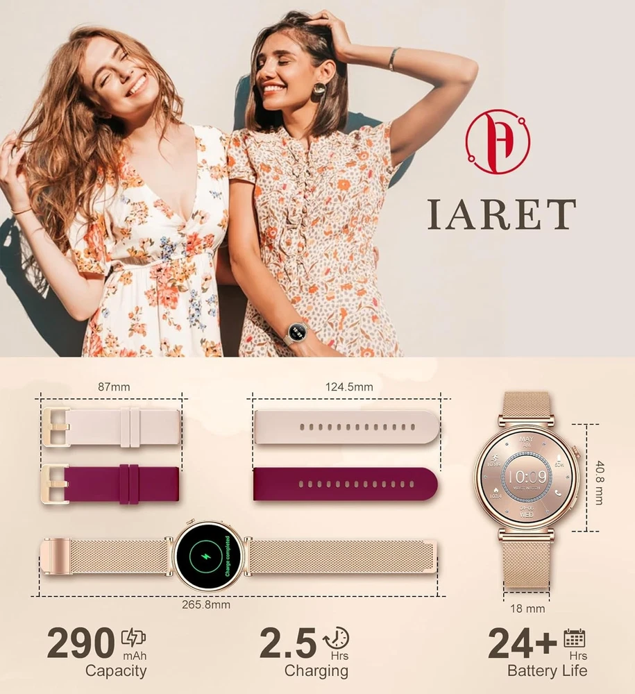 Small Smart Watch for Women with Bluetooth Call, 1.27" Rosegold_Burgundy LuxeFusion Product Description Features Durability and Convenience: Wrist watches for women featuring a 290mAh battery (1-2 days heavy use, 3-5 days normal use); IP67 rating makes it ideal for daily activities like rain, handwashing, and sweating Product Details Product Dimensions: 1.61 x 1.73 x 0.43 inches Item Weight: 7.8 ounces Batteries: 1 Lithium Ion batteries required. (included) Manufacturer: Iaret Standing screen display size: 1.27 Inches Special Feature: Time Display, Touchscreen, 4 Menu Style Switch, DIY Watch Faces, Vibration intensity, Brightness Adjustment, Screen time, Raise to Wake Time Display, Touchscreen, 4 Menu Style Switch, DIY Watch Faces, Vibration intensity, Brightness Adjustment, Screen time, Raise to WakeTime Display, Touchscreen, 4 Menu Style Switch, DIY Watch Faces, Vibration intensity, Brightness Adjustment, Screen time, Raise to Wake See more Connectivity Technology: Bluetooth Wireless Communication Standard: Bluetooth Battery Cell Composition: Lithium Polymer GPS: GPS Via Smartphone Shape: Round Screen Size: 1.27 Inches Brand: Iaret Model Name: I109-2 Style: Modern Free Shipping All orders ship free and fast to your doorstep. Easy Returns Satisfaction guaranteed. 30-day returns, no questions asked. 24/7 Support Contact us anytime; we’re here to help, day or night. Brought to you by LuxeFusion – Quality you can trust.