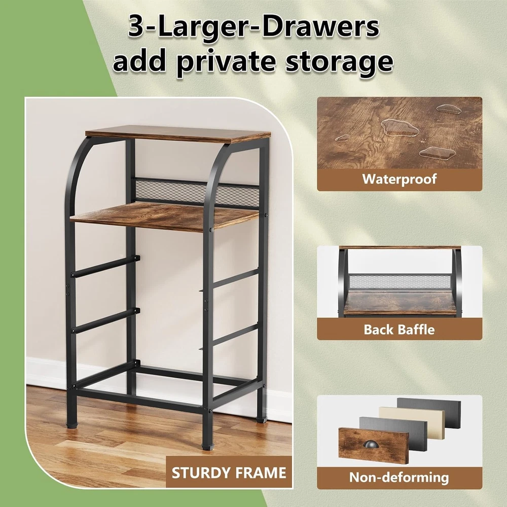 Night Stand Dresser for 11.6"D x 15.2"W x 27.6"H (3 Drawers), Rustic Brown Product Details Brand: Jixlantuc Product Dimensions: 11.61"D x 15.16"W x 27.56"H Color: Rustic Brown Mounting Type: Floor Mount Room Type: Kids Room, Bedroom, Living Room, Home Office, Study Room Special Feature: Storage, Space Saving, Adjustable Feet, Easy Assembly, Foot Rest Furniture Finish: Grain Wood Drawer Type: Under Mounted Slide Assembly Required: Yes Model Name: Night Stand Bedside Table Bedroom Item Weight: 5.3 Kilograms Size: 11.6"D x 15.2"W x 27.6"H (3 Drawers) Number of Pieces: 1 Target Audience: Kid, Adult, Baby Manufacturer: JIX Item Weight: 11.66 pounds Country of Origin: China Item model number: 168 MaterialFinish Type: Engineered Wood, Alloy Steel, IronUnfinished Number of DrawersStyle: 3Mid-Century Modern, Modern, Farmhouse, Rustic Nightstands with Drawers: The fabric drawers are of high-quality fabric, being lightweight and sturdy, not pinching hands and safe for children. The drawer of the side tables bedroom, having a wooden board as an interlayer, are durable and non-deformed Various Use Occasions: The end table are suitable for any home room easily. It can act as a bedroom storage dresser, a sofa table with drawer organizer, and is also great for closet organizer, storage cabinet, entryways, hallways, playrooms Double Display Shelf: The side table with storage shelf in living room, display photo frames, lamps, decorations,etc. The night stands has a rounded design to prevent bumps and bruises. Plus: Back baffle design stops small items from dropping Sturdy and Durable: The bedside table with drawers is made of a sturdy metal frame. The details of bedside tables are handled with one-piece molding and have fixed beams added to the bottom.The chest of drawers is made of high grade fabric, textured and water-resistant. The frame of Jixlantuc nightstand is more stable and durable Easy Assembly: Assembling these bed side end tables is a breeze. Coming with detailed instructions, provided tools, and numbered components, along with helpful videos available on the Jixlantuc nightstand details page