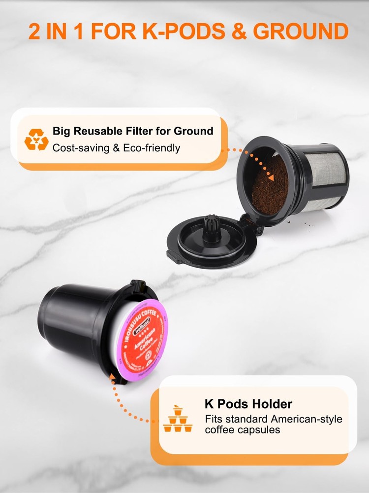 Single Serve Coffee Maker for K-Cup and Ground Coffee Pods & Grounds Specialty Single: The one cup coffee maker works with K-pods, and also comes with a big reusable filter for ground which you can fill with your favorite ground coffee. One-Button Fast Brew: Featuring one-button operation and fast brewing technology, this k cup coffee maker brews a 6-12oz cup of hot coffee in fast as fast 120s. Safety & Portable: The small coffee maker is made from BPA-free and heat-resistant materials to ensure durability and safety. At less than 4.33" wide, the incredibly slim and easy to use single serve coffee maker makes anywhere perfect for great coffee. Descaling Maintenance & Self-Cleaning: When your kcup coffee machine needs descaling, an indicator turns red. Just add descaling solution, hold the brew button for 2 seconds, and let it automatically clean itself. This prevents clogs and ensures optimal performance, extending the lifespan of your one cup coffee maker. Usage Tips: When your single cup coffee maker needs descaling, an indicator turns red. Just add descaling solution, hold the brew button for 2 seconds, and let it automatically clean itself. This prevents clogs and ensures optimal performance, extending the lifespan of your one cup coffee maker. 【Brew in 2 Ways】single serve coffee maker is compatible with both K pod and ground coffee, which satisfies the diverse taste needs of coffee lovers. With a brewing capacity of 6–12 oz, it features a one-button operation that fast brews a fresh cup of hot coffee. Great for chaotic mornings when you need caffeine ASAP 【Safety & Portable】The small coffee maker is made from BPA-free and heat-resistant materials to ensure durability and safety. It’s slim 4.33-inch width is idea for small kitchens, dorm rooms, offices, or RVs 【One-Button Fast Brew】Featuring one-button operation and fast brewing technology, this coffee machine brews a 12oz cup of hot coffee in fast as fast 120s 【Water Tank with View Window】The single cup coffee maker is built in a water tank with a view window for precise control of brewing strength. You can flexibly choose the amount of water to add according to your preference, thereby controlling the amount of coffee brewed 【Descaling Maintenance & Self-Cleaning】When your single cup coffee maker needs descaling, an indicator turns red. Just add descaling solution, hold the brew button for 2 seconds, and let it automatically clean itself. This prevents clogs and ensures optimal performance, extending the lifespan of your one cup coffee maker 【Usage Tips】When using for the first time, brewing with clean water once can help clean the pod coffee maker and maintain a better coffee taste. Please do not exceed the maximum water level when adding water. When descaling, make sure the capsule holder or ground coffee filter is empty