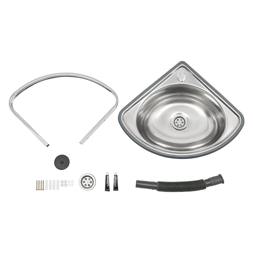Stainless Steel Small Wall Mount Corner Bathroom Sink With Overflow Triangle Description This basin is made of stainless steel and plastic through the polishing process, which is strong and durable. Its special triangular design makes it fit the corner of the wall beautifully, which greatly improves the utilization of space. The unique shape is both beautiful and practical. It is ideal for bathrooms and toilets in small homes. Come and bring it home. Details Rounded Corners and Edges The corners are rounded and smooth to reduce collisions and improve safety. Plastic Ring It has a good seal performance and can prevent the drain pipe from leaking. 2 Nailless Adhesives They can help you bond the brackets for easy installation and without damaging the walls. Small Pads They can cover the screws on the bracket, making it more aesthetically pleasing by preventing rust. Filter It filters food debris, prevents odors and avoids clogging the drain. Key Features Build to Last: It is made of high-quality plastic and stainless steel materials after the polishing process, which can effectively protect the product from rust and abrasion, and make the product have high hardness and long service life. High Load-bearing Capacity: The sturdy triangular construction and strong bracket allow it to hold approximately 55.12lbs, so you can use it with confidence. User-friendly Design: The bottom of the product comes with a pad that can reduce the sound of water hitting the bottom of the basin, providing a quiet living space for you and your family. The wrapped smooth edge can take care of your skin and protect your hands from getting scratched during daily use. Excellent Drainage: The practical drainer and 31.5in long drain pipe make it easy and convenient to drain sewage after use, avoiding stagnant water and keeping the basin clean. Suitable Size: The product with a inner size of 12.2*9.84*5.2in can accommodate enough dishes and fruits(not included) for convenient washing without water splashing. Space-saving: The compact size of 17.32*14.57in and special triangular design can make full use of corner space and greatly improve space utilization, which is ideal for narrow bathrooms, kitchens and RVs, etc. Good-looking Appearance: The sleek silver surface and triangular design give it a modern and stylish look that blends with different decorative styles and adds a touch of decor to your space. Simple Installation: With a simple structure, right-angle design and complete accessories, you can easily install the product in the corner of your kitchen or bathroom, saving you more time and space. Effortless Clean: Thanks to its smooth surface and the basin bottom without clean dead angle , you are allowed to easily remove dust from the surface of the product with a towel(not included). Ideal Gift: Its practical function and glossy appearance make it an ideal housewarming gift for your friends, families, and colleagues. Application It is suitable for washing hands, food, fruits, vegetables, and dishes in restaurants, bars, cafes, kitchens, bathrooms, sweet stores, cleaning rooms, laundry rooms, garages, basements, utility rooms, backyards, gardens, homes, commercial uses or other outdoor or indoor places. Specifications Material: Stainless Steel, Plastic Process: Polishing Style: Modern Color: Silver Mount Type: Countertop Mounted, Wall-mounted Fixing Method: Screw Fixed Shape: Triangle Assembly Required: Yes Load-bearing Capacity: About 25kg/55.12lbs Drain Pipe Length: 80cm/31.5in Wall Thickness: 0.3-0.4mm/0.01-0.02in Gross Weight: 1kg/2.2lbs Product Internal Size: 31*25*13.2cm/12.2*9.84*5.2in Overall Product Size: 44*37cm/17.32*14.57in Length of Both Sides: 33cm/12.99in. Package Size: 38*38*21cm/14.96*14.96*8.27in Package Included 1*Basin 1*Mounting Bracket 1*Drain Pipe 2*Nailless Adhesives 1*Drainer All Accessories for Assembly Notes Please note that this product does not include the inlet pipe and faucet. Please check the size carefully before ordering. It is normal that the expansion screw will blow up after the force is applied. Please note that to prolong the life of the sink, do not scratch the surface with sharp objects. Please do not use strong acids or alkalis to clean items in the sink, and do not put hard objects or rusty metal in contact with the sink for a long time, keep the sink clean by cleaning the sink and drying it with a rag after each use. Please inspect the sink before installation to make sure it has not been cracked or broken during transportation. Please allow the slight color difference caused by the shooting light and 1-3cm error due to manual measurement, and make sure you do not mind before you order. Payment Delivery details Terms of sales About us Contact us Payment We accept ebay payment 。 Fees such as import duties, taxes are not included in the item price or shipping costs. These charges are the buyer's responsibility. Delivery details Shipping: 2-9 working days to: USA Terms of sales We maintain high standards of excellence and strive for hundred percent customer satisfaction. Feedback is very important to us. We hope that you contact us immediately before you give neutral or negative feedback, so that we can address your concerns. It is impossible to address issues if we do not know about them! About us Your satis faction is our ultimate goal. We work hard to earn your trust and future business. Our certified technicians have tested each item before shipping. The unit comes with 1 year limited warranty on all manufacturing defects. a) If you receive a defective item, you may return it or ask for a discount. Please contact us within 14 days after you receive the package. b) What you returned must be intact and in its original packaging as re? u. Customer is responsible for shipping costs of the returned item. c) We will cover the cost of shipping back t with the shipping rate indicated in the registration page. We will send you a new unit or refund the full payment you paid. Than