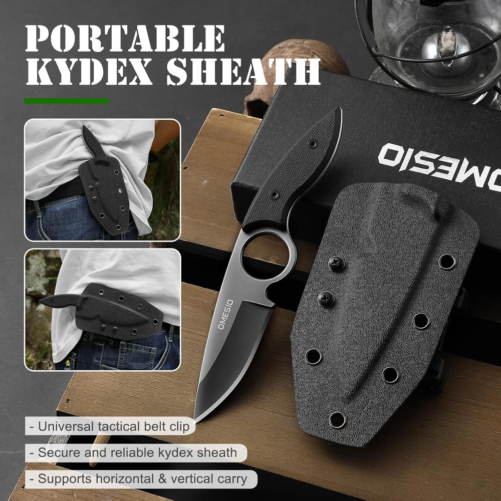 HIGH-QUALITY BLADE MATERIAL: Blade is made of reliable 420 steel provides razor sharp cutting and black EDC coating offers both anti-corrosion protection and glare prevention. TEXTURED G10 HANDLE: Sturdy full tang blade design with a textured G10 handle for a secure and comfortable grip. EXCEPTIONAL GRIP: Thumb rest and finger hole for balance and dexterity. The ergonomic handle design provides an exceptional grip sensation, enhancing control and safety during use. MULTIFUNCTIONAL TACTICAL KNIFE: Tactical knife with holster can work as cord cutter, box cutter, wood cutter and branch cutter. Suitable for camping hiking fishing and other outdoor emergency acti. SUPERIOR VERSATILE KYDEX SHEATH: The high-strength lightweight Kydex sheath with a universal clip can be adjusted horizontally and vertically. The detachable & adjustable spacers on the clip can be used with almost any size of waist belt for easy portability. Product Description Omesio EDC Fixed Blade Knife - Your Essential Outdoor Companion. - Sturdy and durable - Crafted with a full tang blade - Suitable for a Variety of Usage Scenarios. NON SLIP TEXTURED G10 HANDLE Whether it's wet or slippery, the textured G10 handle provides a secure grip. Equipped with thumb ramps and finger holes, our camping knife ensures both balance and flexibility for survival situations. HIGH HARDNESS 420 STAINLESS STEEL The blade of this tactical knives for men is expertly crafted from high-quality 420 steel, ensuring razor-sharpness, remarkable toughness, and excellent edge retention for ultimate precision cutting performance. Kydex sheath supports both horizontal and vertical carry, catering to diverse needs. EXCEPTIONAL VERSATILE KYDEX SHEATH The fixed blade knife with sheath is a versatile and reliable tool, spanning from household use to outdoor camping, hunting, hiking, survival, exploration, and wilderness craft. The fixed knife stands as an indispensable tool for you. Furthermore, the Omesio fixed knife comes with a gift box, offering the opportunity to gift it to anyone who holds significance in your life. Product Information Blade Material 420 Stainless Steel Whole Length 6.92" Blade Length 2.68" Weight 0.23 lb