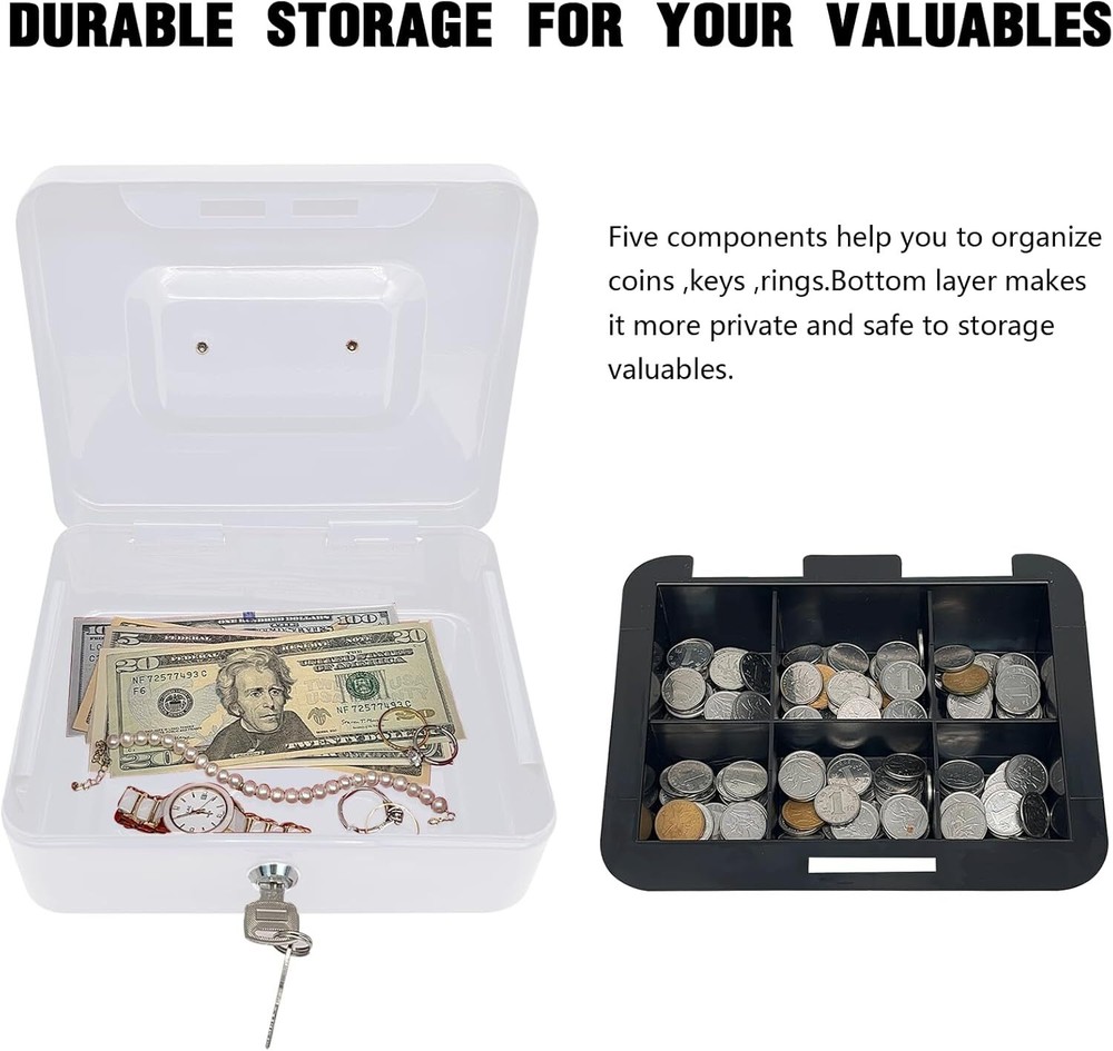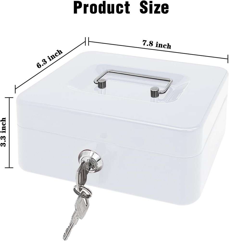 Steel Cash Box with Key Lock, Metal Small Money White- 7.8" x 6.3" x 3.3" Product Details Brand: PACOLO Product Dimensions: 5.9"D x 3.1"W x 4.7"H Lock Type: Key Color: White- 7.8" x 6.3" x 3.3" Material: Alloy Steel, Metal Special Feature: Key Lock Mounting Type: Floor Mount Control Type: Key Control Included Components: Stainless Steel, Alloy Steel, Plastic, Metal Water Resistance Level: Not Water Resistant Chamber Depth: 5.9 Inches Manufacturer: PACOLO Item Weight: 1.76 pounds Country of Origin: China Item model number: Steel Cash Box Style: Classic Special Features: Key Lock Batteries Included?: No Batteries Required?: No Brand: PACOLO Product Dimensions: 5.9"D x 3.1"W x 4.7"H Lock Type: Key Color: White- 7.8" x 6.3" x 3.3" Material: Alloy Steel, Metal Special Feature: Key Lock Mounting Type: Floor Mount Control Type: Key Control Included Components: Stainless Steel, Alloy Steel, Plastic, Metal Water Resistance Level: Not Water Resistant Size And Color:Exterior dimensions: 7.8 inch x 6.3inch x 3.3 inch,4 colors(Black, White,Pink and Blue) available for you to choose. Key Lock:This cash box has a key lock to keep valuables safe. The key is easy to operate,can open it no problem with one hand. Removable Tray:This cash box has a removable tray with 6 compartments which makes for great coin organization,as well as a layer underneath the tray for storing cash and checks. Highly Quality:This cash boxes is made of high quality steel which is solid and not afraid of knocks and shocks.Suitable to store bills, coins, checks and receipts.The lock box is lightweight with a convenient handle, so you can take it to anywhere and hide it easily. Wide Application:This money box with key is suitable for indoor or outdoor small business,commercial supermarket,store,lockers, cabinets, family use.It also is a perfect gift for Birthday, Mother’s day,Christmas for your friends and family. Suitable to store bills, coins, checks and receipts.