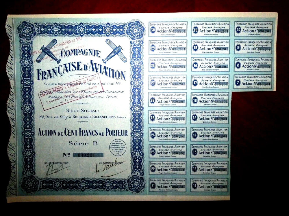 Notascript Banknotes, Bonds & Shares One bearer share certificate of the " Compagnie Française d´Aviation" ,Boulogne-Billancourt (Seine) 1930 . Office at the time: 128 Rue de Silly ,Boulogne-Billancourt (Seine).Condition (opinion) :Very Fine/Extremely Fine (VF/EF ). Uncancelled . Size: 26,2cm/20cm (small or average/small.Size of the main document ,without counting the coupons size) .One handwritten signature. Compagnie Française d'Aviation (CFA) was a French aircraft manufacturer of the 1930s and 1940s. It was established in 1936 as a division of the Salmson engine company to handle the mass production of the Cricri light aircraft. D.7 Cricri Major built by CFA in 1947 at Pontoise airfield near Paris in 1967 Manufacturing was interrupted by World War II, but was revived on a small scale thereafter. By 1951, their CFA D.7 Cricri Major design and its derivatives were thoroughly outdated, and the company was dissolved at this time. See below for related information from the web. Historical document for collectable or historical research only. Use this picture for reference only, serial number may be different. Please read carefully the sale terms ,shipping conditions and information below. The buyer accepts those terms, conditions and cost described. ---------------------------------------------------------------------------------------- Terms of sale and shippig information Postage, including packing material, handling fees : Europe: USD 9.70 / USA $ 10.70. Rest of the World: USD 12.00. FREE of postage for other items. (excluding purchases under US$70.00 with a weight greater than 100 gr. including the protection and packaging card ) . Only one shipping charge per shipment (the highest one) no matter how many items you buy (combined shipping). ----------------------------------------------------------------------------- Guaranteed genuine - One month return policy (retail sales) . Returns accepted with no questions. Customers are invited to combine purchases to save postage. As we have (or could have) more than one identical item ,the serial number may differ from those shown in the picture which is for reference only. For purchases above $70.00 we send the orders registered with tracking number without extra charge, for purchases below $70.00 we ship as regular letters at the buyer's risk. For purchases below $ 70,00 who want to register your letter with tracking number, please add an extra for : Europe $4.20 , U.S. $5.00 ,Rest of the word $5.90 .For this case ,please request or wait for our invoice before paying. Postage include packaging material and handling fees. For some destinations and purchases below $70.00 customers may be requested for this extra shipping payment in order to register the shipment with tracking number. We reserve the right to cancel transactions that require the sending of unregistered letters (without tracking number) to some destinations when this extra payment has been requested. For purchases over $70.00, the excess weight will be free. For purchases under US$70.00 with a weight greater than 100 gr. including the protection and packaging card, the buyer is asked not to make the payment until receiving the invoice or shipment note, since the cost will be calculated and the type of shipment will be assessed (registered or insured or not) and the buyer will be charged the approximate total of the costs of the Post Office rate (rates that are public and can be consulted), in this case the costs of packaging materials, handling and delivery management are free. In the event that the buyer has already made the payment, he will be asked to pay the difference that is missing for the payment of the postal rate. Likewise, we reserve the right to cancel transactions that have not been paid this extra amount when requested. If for any reason, your item did not arrive yet, or you are not 100% satisfied with the item you have received, please do not hesitate to contact , I will do all it takes to provide the best service. The buyer must notify to us of the delay in the arrival of his purchase when he meets 3 weeks ( to Europe) to 4 weeks (rest of the World) this guarantee expires two months after the shipment of his purchase if we have not previously received notice of the delay . ----------------------------------------------------------------------------------- Banknote Grading UNC AU EF VF F VG G Fair Poor Uncirculated About Uncirculated Extremely Fine Very Fine Fine Very Good Good Fair Poor Edges no counting marks light counting folds OR... light counting folds corners are not fully rounded much handling on edges rounded edges Folds no folds ...OR one light fold through center max. three light folds or one strong crease several horizontal and vertical folds many folds and creases Paper color paper is clean with bright colors paper may have minimal dirt or some color smudging, but still crisp paper is not excessively dirty, but may have some softness paper may be dirty, discolored or stained very dirty, discolored and with some writing very dirty, discolorated, with writing and some obscured portions very dirty, discolored, with writing and obscured portions Tears no tears no tears into the border minor tears in the border, but out of design tears into the design Holes no holes no center hole, but staple hole usual center hole and staple hole Integrity no pieces missing no large pieces missing piece missing piece missing or tape holding pieces together <div style="text-align:center"><a style="text-decoration:none" href="http://mostpopular.sellathon.com/?id=AC1061546"><img src="http://www.sellathon.com/Resources/Images/countercredit.gif" border="0"></a></div> Your browser does not support JavaScript. To view this page, enable JavaScript if it is disabled or upgrade your browser. See below for related information from the web: Compagnie Française d'Aviation (CFA) was a French aircraft manufacturer of the 1930s and 1940s. It was established in 1936 as a division of the