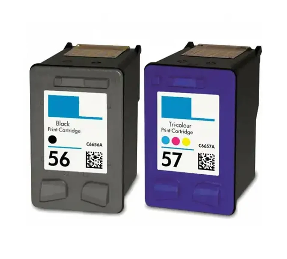 Remanufactured 2 PKS 56 BLACK ( C6656AN ) - 520 pages 57 COLOR ( C6657AN ) - 500 pages HP COLOR COPIER SERIES Color Copier 410 HP DESKJET SERIES Deskjet 450 / 450cbi / 450ci / 450wbt Deskjet 5150 / 5150w / 5150v Deskjet 5550 / 5550v Deskjet 5551 Deskjet 5560 Deskjet 5650 / 5650w / 5650v Deskjet 5655 Deskjet 5850 / 5850w Deskjet 9650 Deskjet 9670 Deskjet 9680 / 9680gp HP OFFICEJET SERIES Officejet 4110 / 4110v / 4110xi Officejet 4215 / 4215v / 4215xi Officejet 5505 Officejet 5508 Officejet 5510 / 5510v / 5510xi Officejet 5515 Officejet 6105 Officejet 6110 / 6110v / 6110xi Officejet J5508 Officejet J5520 HP PHOTOSMART SERIES Photosmart 7150 Photosmart 7260 / 7260v / 7260w Photosmart 7350 / 7350v / 7350w Photosmart 7450 / 7450v / 7450xi Photosmart 7459 Photosmart 7550 / 7550v / 7550w Photosmart 7660 / 7660v / 7660w Photosmart 7755 Photosmart 7760 / 7760v / 7760w Photosmart 7762 Photosmart 7960 / 7960v / 7960w HP PSC SERIES PSC 1100 / 1110v PSC 1205 PSC 1209 PSC 1210 / 1210L / 1210xi / 1210v PSC 1310 PSC 1311 PSC 1312 PSC 1315 / 1315v / 1315xi PSC 1317 PSC 1318 PSC 1340 PSC 1350 / 1350v / 1350xi PSC 1355 PSC 2100 PSC 2108 PSC 2110 / 2110v / 2110xi PSC 2115 PSC 2150 PSC 2170 PSC 2171 PSC 2175 / 2175v / 2175xi PSC 2200 PSC 2210 / 2210v / 2210xi PSC 2410 / 2410v / 2410xi PSC 2510 / 2510xi 100% Satisfaction Guaranteed: We stand behind every product we sell and offer a 100% satisfaction guarantee for a full refund (excluding shipping costs) of the purchase price within 30 days. We import these cartridges from a certified factory and since we import these cartridges ourselves, we can pass the savings on to you, The use of compatible replacement printing supplies does not void your printer warranty.
