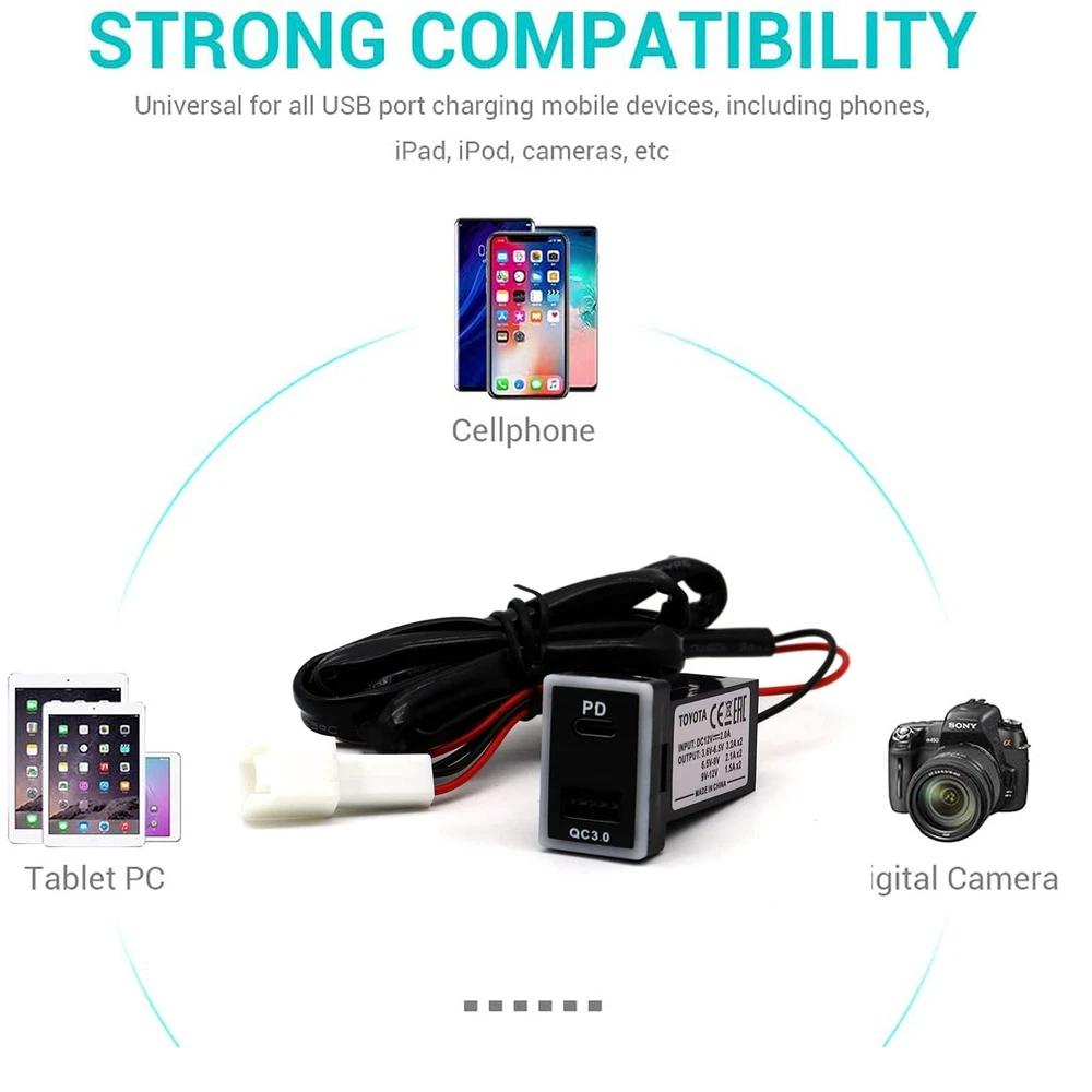 Compatible with Toyota PD Type C USB Power Socket, USB C & Quick Charge 3.0 Car Charger USB Adapter Port Socket Compatible with Toyota(32*20mm) quick charge 3.0: Charges devices up to 80% in just 35 minutes, 4 times faster than conventional car chargers. Backward compatible with QC 1.0 and 2.0 Technology. USB 3.0 and USB C outputs ensure the fastest charging speed for 2 smartphones, tablets, or QC compatible devices simultaneously, also charges non-Quick Charge devices at their normal speed. Universal compatibility: Compatible with all USB powered devices including Quick Charge 1.0, 2.0 and 3.0, ensuring that even non-Quick Charge devices get the fastest charge possible, such as smartphones and tablets. Operating voltage: 12V QC3.0 Output: 5V*3.2A Suitable models: (we recommend measuring the size of the mounting hole before purchase) Toyota corolla 2007-2017 corolla ex 2011-2014 Toyota levin 2014-2017 Toyota rav4 2009-2016 Toyota prado 2010-2016 Toyota corolla hyrbid 2016-2017 Toyotacorolla ex 2011-2014,toyota vios 2008-2016 Toyotaland cruiser 100 series 2003-2007 Toyota land cruiser 200 series 2008-2016 Toyota yaris L 2014-2016 Toyota alphard 2009-2015 Toyota prius 2012-2016 Toyota highlander 2008-2017 Toyota tundra 2009-2013 : offers consumer accessory solutions across many different categories such as Tablet and phone cases, Keyboards, Batteries, Headphones, Wallets, Cufflinks, Money clips, Collar stays, and more. When purchasing a product you can expect quality in both the material and performance of the items backed by amazing customer service and support. Brand of "" was regiestered by U.S TradeMark Office. This QC3.0 port with Type C car socket is only suitable for holes 32 * 20mm. Connectors: Type C + QC 3.0 USB C car charger socket is manufactured to fit in the OEM space Available in your toyota car or truck, like corolla 2007-2017,levin 2014-2017,rav4 2009-2016,prado 2010-2016,corolla hyrbid 2016-2017,corolla ex 2011-2014,toyota vios 2008-2016,land cruiser 100 series 2003-2007 and more. Intelligent Charging - Quick charge 3.0 USB port, built-in smart charging IC, will auto detects your devices and charges them at optimal speed, better charging performance; QC 3.0 Backward-compatible with QC 2.0, 1.0, provides standard charging for non-Quick Charge devices. Safety Protecion - Over-heated, over-current, over-charging protection, charging will be automatically stop when battery is full; 3.92ft wiring and fuse included; easy to use and install. Don't worry about the problems once you order the product. If have any problem, pls don't hesitate to contact us.