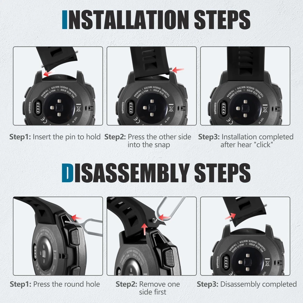 ✅【Wildly Compatible】22mm watch band replacement personalized for your Garmin Instinct/Instinct Solar/Instinct Tactical/Instinct Esports/Instinct Tide/Instinct 2/Instinct 2 Solar/Instinct 2 SolarTactical/Instinct Crossover ▶Please check the model on the watch back before buying!!(NOTE: The watch is not included) ✅【Comfortable Size& Soft Material】Our Garmin instinct watch bands is made of high-quality, eco-friendly silicone, this band is soft, flexible, light and harmless with no peculiar smell. It fits comfortably on wrist sizes from 6.30"-8.66", so the garmin instinct band replacement Great for running, fitness, yoga and other sports, you can wear it all day without discomfort ✅【More Safe Clasp Design】Our replacement watch bands is equipped with two strap holders to better secure the garmin instinct watch to your wrist. No worry for falling off.. Choose a Garmin watch band to make your workout more enjoyable. ✅【Easy to Install】The garmin watch band Replacement can be installed to your watch effortlessly. With the tools in the packages, you can finish the installation smoothly. ✅【New for This Season for Sport】Our 22mm Garmin watch band come in a variety of colors and can be matched as you like, which can fully display the watch's new color change and casual appearance, and it is more in line with your own wear, so that you can have a happy mood all day. It's also the best choice as gifts. Multi row ventilation holes design makes it more breathable,it's also suitable for some high intensity exercise occasions in summer