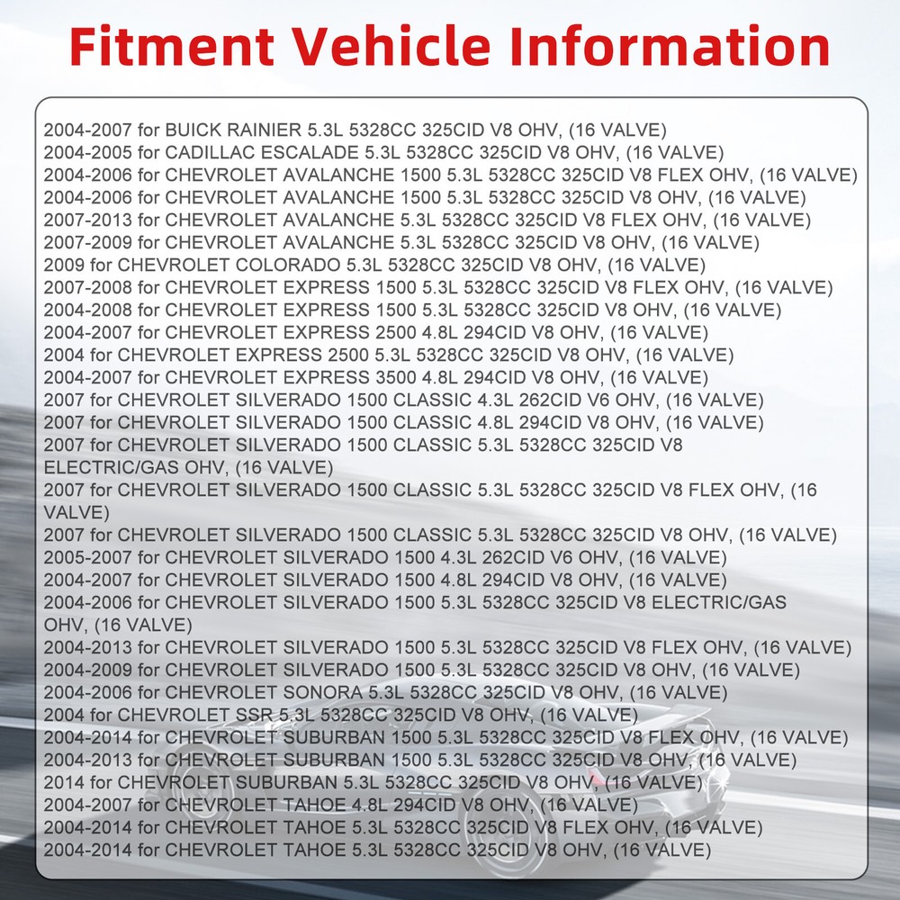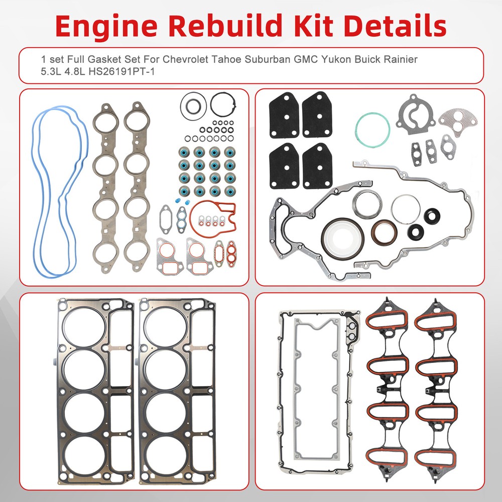 Store Home New Listing Ending Soon Sale items View Feedback Contact us Shock Absorbers & Spring Power Steering Pump Rack & Pinion Engine Rebuild Kit Store Categories Returned Products Auto and motorcycle parts Ignition Coils Alternator Power Steering Pump AC Compressor Starter Power Steering Gear Box Tail Light Assembly Turbocharger Catalytic Converter Clearance Sale Control Arms Oxygen Sensor Wheel Spacers Clearance Sale 2 Coilovers Struts Carburetor Air Suspension Springs Mudguard Oil Pan Air Suspension Shock Strut Driveshaft AC Condenser Visor Rain Window Regulator Compressor Clutch Roof Rack Air Cooler Auto Decoration Auto Electronics Car Modification Construction Machinery part Engine Rebuild Kit Power Steering Pump & Rack Power Steering Rack and Pinion Radiator Shock Absorbers & Spring Other Full Gasket Set For Chevrolet Tahoe Suburban GMC Yukon Buick Rainier 5.3L 4.8L Full Gasket Set For Chevrolet Tahoe Suburban GMC Yukon Buick Rainier 5.3L 4.8L Product Description Part number: HS26191PT, HS26191PT-1, HS26190PT-2,10198982,CS9284 Fits Following Models: 2004-2007 for BUICK RAINIER 5.3L 5328CC 325CID V8 OHV, (16 VALVE) 2004-2005 for CADILLAC ESCALADE 5.3L 5328CC 325CID V8 OHV, (16 VALVE) 2004-2006 for CHEVROLET AVALANCHE 1500 5.3L 5328CC 325CID V8 FLEX OHV, (16 VALVE) 2004-2006 for CHEVROLET AVALANCHE 1500 5.3L 5328CC 325CID V8 OHV, (16 VALVE) 2007-2013 for CHEVROLET AVALANCHE 5.3L 5328CC 325CID V8 FLEX OHV, (16 VALVE) 2007-2009 for CHEVROLET AVALANCHE 5.3L 5328CC 325CID V8 OHV, (16 VALVE) 2009 for CHEVROLET COLORADO 5.3L 5328CC 325CID V8 OHV, (16 VALVE) 2007-2008 for CHEVROLET EXPRESS 1500 5.3L 5328CC 325CID V8 FLEX OHV, (16 VALVE) 2004-2008 for CHEVROLET EXPRESS 1500 5.3L 5328CC 325CID V8 OHV, (16 VALVE) 2004-2007 for CHEVROLET EXPRESS 2500 4.8L 294CID V8 OHV, (16 VALVE) 2004 for CHEVROLET EXPRESS 2500 5.3L 5328CC 325CID V8 OHV, (16 VALVE) 2004-2007 for CHEVROLET EXPRESS 3500 4.8L 294CID V8 OHV, (16 VALVE) 2007 for CHEVROLET SILVERADO 1500 CLASSIC 4.3L 262CID V6 OHV, (16 VALVE) 2007 for CHEVROLET SILVERADO 1500 CLASSIC 4.8L 294CID V8 OHV, (16 VALVE) 2007 for CHEVROLET SILVERADO 1500 CLASSIC 5.3L 5328CC 325CID V8 ELECTRIC/GAS OHV, (16 VALVE) 2007 for CHEVROLET SILVERADO 1500 CLASSIC 5.3L 5328CC 325CID V8 FLEX OHV, (16 VALVE) 2007 for CHEVROLET SILVERADO 1500 CLASSIC 5.3L 5328CC 325CID V8 OHV, (16 VALVE) 2005-2007 for CHEVROLET SILVERADO 1500 4.3L 262CID V6 OHV, (16 VALVE) 2004-2007 for CHEVROLET SILVERADO 1500 4.8L 294CID V8 OHV, (16 VALVE) 2004-2006 for CHEVROLET SILVERADO 1500 5.3L 5328CC 325CID V8 ELECTRIC/GAS OHV, (16 VALVE) 2004-2013 for CHEVROLET SILVERADO 1500 5.3L 5328CC 325CID V8 FLEX OHV, (16 VALVE) 2004-2009 for CHEVROLET SILVERADO 1500 5.3L 5328CC 325CID V8 OHV, (16 VALVE) 2004-2006 for CHEVROLET SONORA 5.3L 5328CC 325CID V8 OHV, (16 VALVE) 2004 for CHEVROLET SSR 5.3L 5328CC 325CID V8 OHV, (16 VALVE) 2004-2014 for CHEVROLET SUBURBAN 1500 5.3L 5328CC 325CID V8 FLEX OHV, (16 VALVE) 2004-2013 for CHEVROLET SUBURBAN 1500 5.3L 5328CC 325CID V8 OHV, (16 VALVE) 2014 for CHEVROLET SUBURBAN 5.3L 5328CC 325CID V8 OHV, (16 VALVE) 2004-2007 for CHEVROLET TAHOE 4.8L 294CID V8 OHV, (16 VALVE) 2004-2014 for CHEVROLET TAHOE 5.3L 5328CC 325CID V8 FLEX OHV, (16 VALVE) 2004-2014 for CHEVROLET TAHOE 5.3L 5328CC 325CID V8 OHV, (16 VALVE) 2004-2006 for CHEVROLET TRAILBLAZER EXT 5.3L 5328CC 325CID V8 OHV, (16 VALVE) 2006-2008 for CHEVROLET TRAILBLAZER 5.3L 5328CC 325CID V8 OHV, (16 VALVE) 2009 for GMC CANYON 5.3L 5328CC 325CID V8 OHV, (16 VALVE) 2004-2006 for GMC ENVOY XL 5.3L 5328CC 325CID V8 OHV, (16 VALVE) 2004-2005 for GMC ENVOY XUV 5.3L 5328CC 325CID V8 OHV, (16 VALVE) 2005-2009 for GMC ENVOY 5.3L 5328CC 325CID V8 OHV, (16 VALVE) 2008 for GMC SAVANA 1500 5.3L 5328CC 325CID V8 FLEX OHV, (16 VALVE) 2008 for GMC SAVANA 1500 5.3L 5328CC 325CID V8 OHV, (16 VALVE) 2004-2007 for GMC SAVANA 2500 4.8L 294CID V8 OHV, (16 VALVE) 2004-2005 for GMC SAVANA 2500 5.3L 5328CC 325CID V8 OHV, (16 VALVE) 2004-2007 for GMC SAVANA 3500 4.8L 294CID V8 OHV, (16 VALVE) 2007 for GMC SIERRA 1500 CLASSIC 4.3L 262CID V6 OHV, (16 VALVE) 2007 for GMC SIERRA 1500 CLASSIC 4.8L 294CID V8 OHV, (16 VALVE) 2007 for GMC SIERRA 1500 CLASSIC 5.3L 5328CC 325CID V8 ELECTRIC/GAS OHV, (16 VALVE) 2007 for GMC SIERRA 1500 CLASSIC 5.3L 5328CC 325CID V8 FLEX OHV, (16 VALVE) 2007 for GMC SIERRA 1500 CLASSIC 5.3L 5328CC 325CID V8 OHV, (16 VALVE) 2005-2007 for GMC SIERRA 1500 4.3L 262CID V6 OHV, (16 VALVE) 2004-2007 for GMC SIERRA 1500 4.8L 294CID V8 OHV, (16 VALVE) 2005-2006 for GMC SIERRA 1500 5.3L 5328CC 325CID V8 ELECTRIC/GAS OHV, (16 VALVE) 2004-2013 for GMC SIERRA 1500 5.3L 5328CC 325CID V8 FLEX OHV, (16 VALVE) 2004-2009 for GMC SIERRA 1500 5.3L 5328CC 325CID V8 OHV, (16 VALVE) 2007 for GMC SIERRA 1500 6.2L 6162CC 376CID V8 OHV, (16 VALVE) 2008-2013 for GMC SIERRA 5.3L 5328CC 325CID V8 OHV, (16 VALVE) 2004-2014 for GMC YUKON XL 1500 5.3L 5328CC 325CID V8 FLEX OHV, (16 VALVE) 2004-2009 for GMC YUKON XL 1500 5.3L 5328CC 325CID V8 OHV, (16 VALVE) 2008-2014 for GMC YUKON 5.3L 5328CC 325CID V8 FLEX OHV, (16 VALVE) 2008-2010 for GMC YUKON 5.3L 5328CC 325CID V8 OHV, (16 VALVE) 2008-2009 for HUMMER H3 5.3L 5328CC 325CID V8 OHV, (16 VALVE) 2009 for HUMMER H3T 5.3L 5328CC 325CID V8 OHV, (16 VALVE) Package Included (As pictures showed) About Us Payment Shipping Returns Contact Us About Us VEHICULOS Story: Mission: The mission of VEHICULOS automotive parts is to provide customers with excellent quality and reliability, ensuring their vehicles are always in optimal condition. We aim to be the preferred brand in the field of car maintenance and repair, offering unmatched value and trust to our customers. Philosophy: At VEHICULOS, we believe that every single automotive part plays a crucial role, influencing the overall performance and safety of the vehicle. Therefore, we strive for the perfect combination of exceptional quality, innovative technology, and superior service to meet the demand for high-standard automotive parts. Founder's Experience