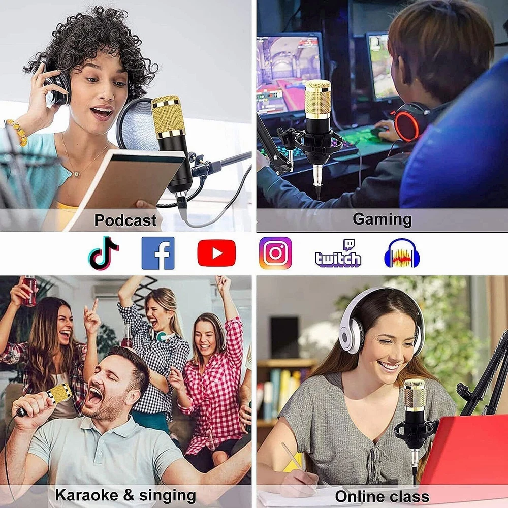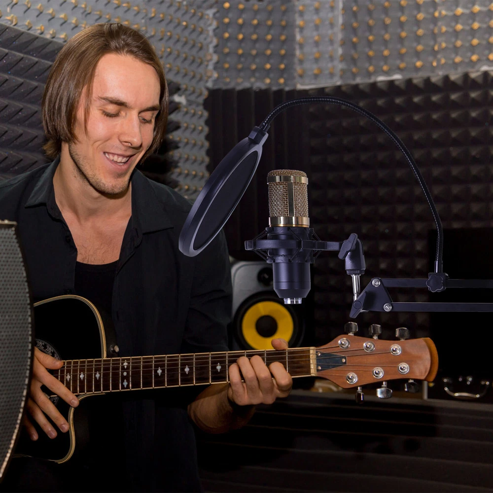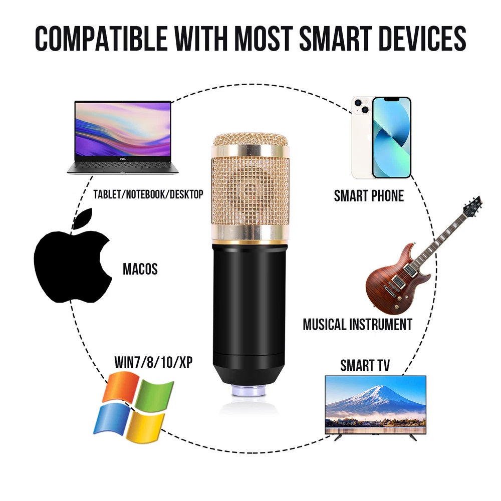 Battery: 2000mAh Brand: CATGOOD S/N Ratio: >95dB Features1: Noise Cancellation, Mountable, On/Off Switch Model: BM-800 Distortion: 0.3% (1KHz, A weighting) Form Factor1: Scissor Arm Stand Channel: 5.1 Charge Voltage: 5V±5% Frequency Response: 20Hz-20KHz ±3dB gtin13: Does Not Apply Microphone Form Factor: Hanging Microphone Bundle Description: STUDIO RECORDING KIT Connectivity: 3.5 mm (1/8 in) TRS, Bluetooth, Proprietary Custom Bundle: No MPN: Does Not Apply Suitable For: Studio Recording, Live Performance, Home Recording UPC: Does Not Apply Features: Adjustable Stand, Built-in Headphone Jack, High Sensitivity, Integrated Digital Converter, Mix Control, Noise Cancellation, Plug and Play Type: Desktop Microphone Form Factor: Microphone Kit Transducer Type: Condenser Working Voltage: 3.3V-4.2V Instrument: Guitar/Piano/Drum/Harmonica Charge Current: 500mAh max Material: Metal Polar Pattern: Cardioid Diaphragm Size: Medium Color: Black + Gold, Black BT Protocol: 2.1