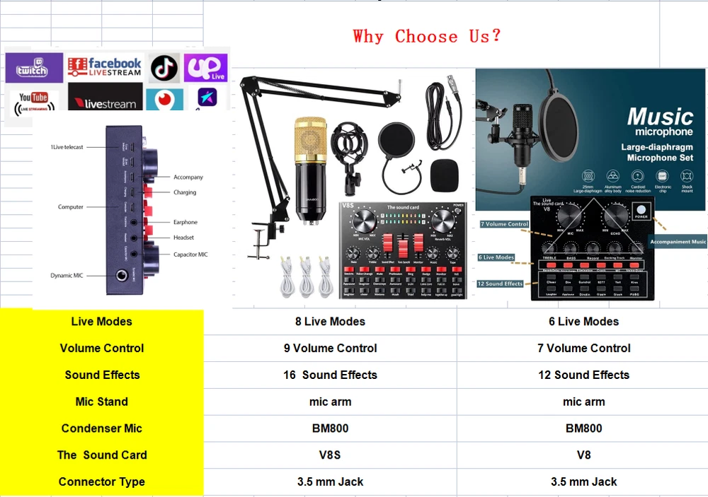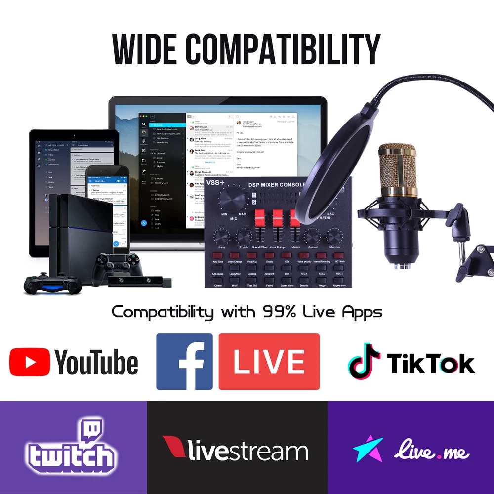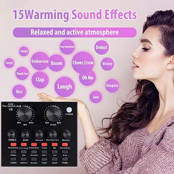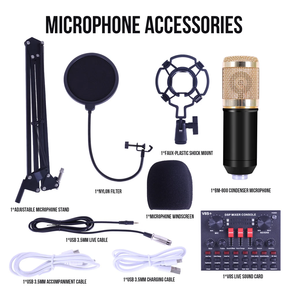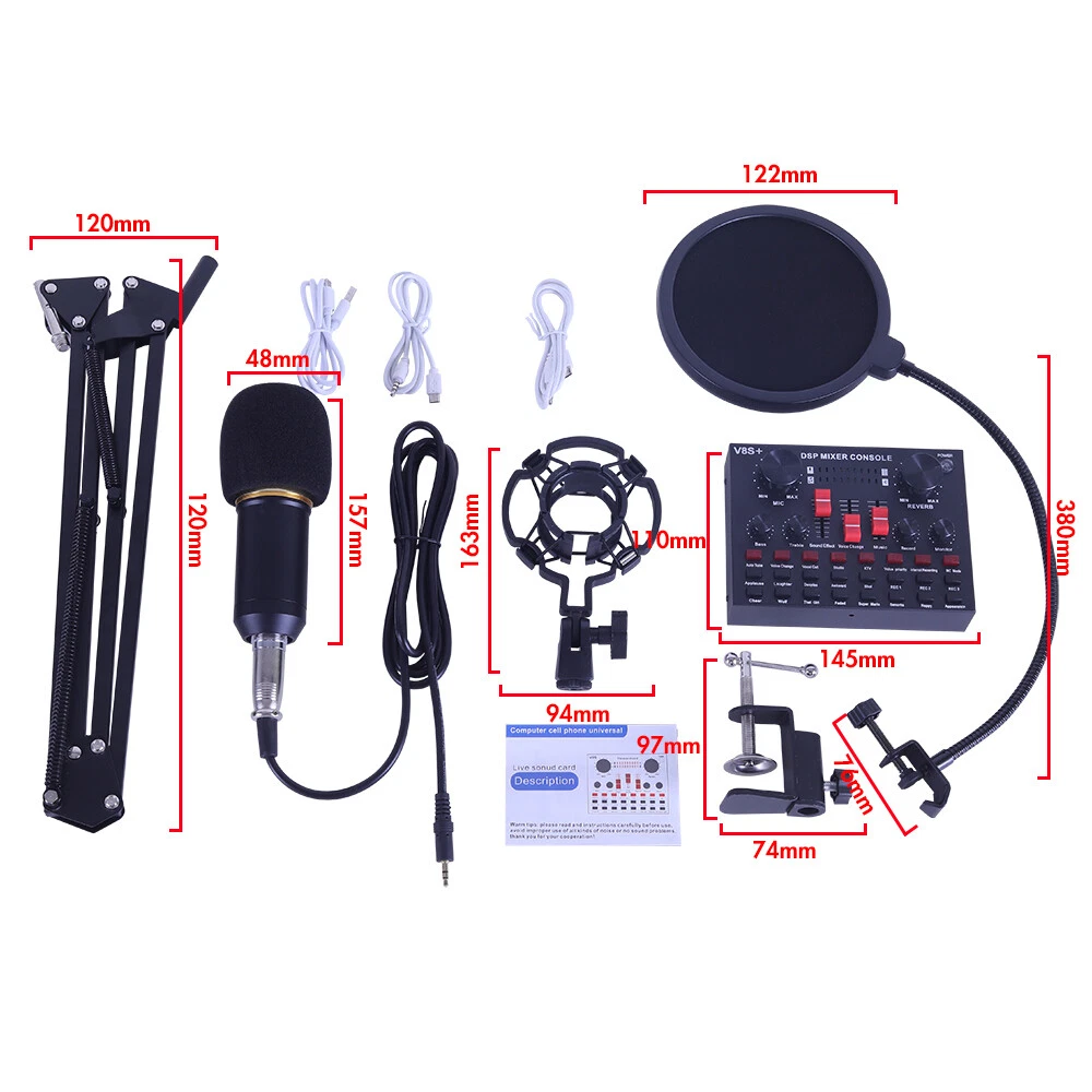 Complete Home Studio Recording Kit - Mixer, Condenser Mic for PC Music/Podcast Description: BM-800 high-performance microphones are designed to deliver clear, high-quality sound for memorable recordings. It can deliver warm, clear bass, detailed midrange, and a silky high end. It is ideal for vocals, musical instruments, podcasting, voiceovers, interviews, field recordings. Suitable for studios, recording studios, broadcasting stations, personal broadcast, adage performance and computers. Feature: - The sound card includes 65 sound effects, 8 fun modes and 6 adjusting rotary knobs. -With BT function, two live and one accompaniment after connecting three phones. -It is the indicator light when sound enters. When it is not singing, it is the breathing light. -One button to eliminate the original sound, intelligent dodge. -Equipped with DSP intelligent noise reduction chip, low power consumption, stereo sound. -Built-in rechargeable polymer lithium battery, it is long-lasting. -The microphone cover prevents wind noise while you are recording. -The double-layer filter with double-layer nylon mesh construction can effectively remove plosive sound in the recording. -The shockproof mount can securely hold the microphone and effectively reduce handling noise. -Universal function, support singing, live streaming, recording, music and other multi-function. Support mainstream live streaming software. Specification: Material: Metal Color: Black + Gold, Black BT Protocol: 2.1 Channel: 5.1 Working Voltage: 3.3V-4.2V Charge Voltage: 5V±5% Charge Current: 500mAh max S/N Ratio: >95dB Frequency Response: 20Hz-20KHz ±3dB Distortion: 0.3% (1KHz, A weighting) Battery: 2000mAh Package Contents: -1*V8S Live Sound Card -1*BM-800 Condenser Microphone -1*Adjustable Microphone Stand -1*Nylon Filter -1*Faux-plastic Shock Mount -1*Microphone Windscreen -1*USB 3.5mm Charging Cable -1*USB 3.5mm Accompaniment Cable -1*USB 3.5mm Live Cable -2*English Manual Instruction Note: 1. Please allow 0.5-1cm differences due to manual measurement. 2. Due to the light and screen difference, the item's color may be slightly different from the pictures. We can only accept Paypal payment only. You can send payment to our paypal account by many payment methods(Credit or debit card through PayPal. 1. Items are US stock. 2. Item will be shipped out within 1- 2 Working days upon your payment completed. 3.Please do not hesitate to contact us if you have any questions about our products. We will be responsible for any damages or losses incurred in the shipping process. 1.If there are any problems with our products,Please feel free to contact us.We will always here to solve them for you.You don't need to contact ebay or paypal.And please DO NOT leave us Neutral/Negative feedback,It won't help the problem to be solved.And it is the worst hurst to a seller.We should try our best to make a happy easy transaction. 2.If you are satisfied with our products and our service,please tell your friend and leave us positive feedback;if you are not satisfied with our products or service,please DO tell us. 3.After receiving the item,you could contact us within 30 days.Refund will be given as money back or item exchange. 1. Usually, we reply for the messages within 24 hours, if you do not get response within 1-2 Working days , please check your Messages box one more time or Please email us AGAIN. 2. Email is the priority of our customer service, if you can't get us, please choose live response. 3. Positive feedback is automatically done once the payment is cleared. We appreciate your feedback. 4.The star-scores are very important to us. If anything about your transaction did not meet your expectations. Please let us know and give us the opportunity to work out for you before you leave feedback. Working Day: Monday to Friday Working Time: 9:00 am to 18:00 pm On Aug 19, 2024 at 06:50:53 PDT, seller added the following information: