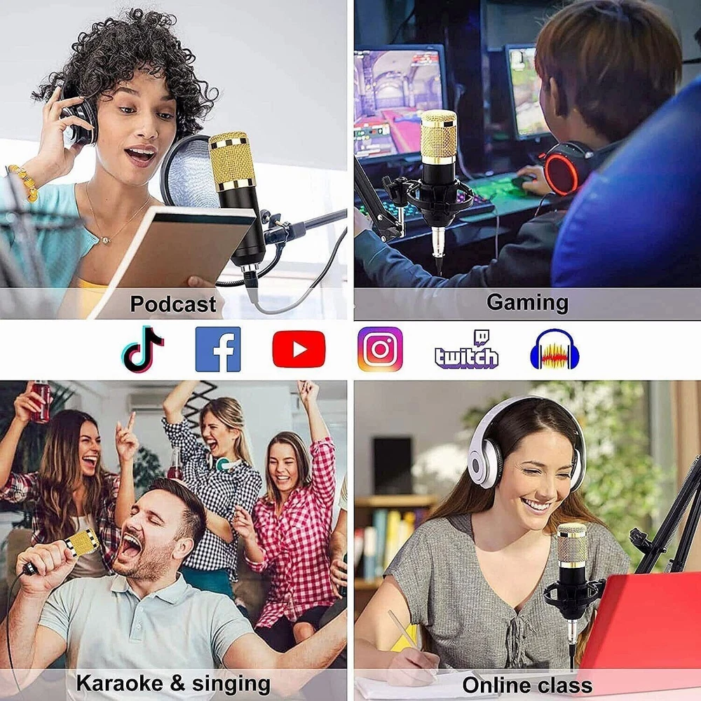 UPC: Does Not Apply Type: Desktop Microphone Working Voltage: 3.3V-4.2V Suitable For: Studio Recording, Live Performance, Home Recording Distortion: 0.3% (1KHz, A weighting) Form Factor1: Scissor Arm Stand Battery: 2000mAh Color: Black + Gold, Black Connectivity: 3.5 mm (1/8 in) TRS, Bluetooth S/N Ratio: >95dB Charge Voltage: 5V±5% gtin13: Does Not Apply MPN: Does Not Apply Frequency Response: 20Hz-20KHz ±3dB Features1: Noise Cancellation, Mountable, On/Off Switch Transducer Type: Condenser Microphone Form Factor: Hanging Microphone Features: Adjustable Stand, Built-in Headphone Jack, High Sensitivity, Integrated Digital Converter, Mix Control, Noise Cancellation, Plug and Play Charge Current: 500mAh max Channel: 5.1 Instrument: Guitar/Piano/Drum/Harmonica Form Factor: Microphone Kit Diaphragm Size: Medium Material: Metal Brand: Unbranded BT Protocol: 2.1