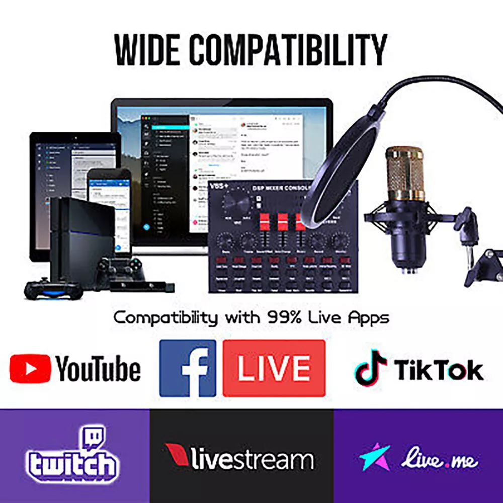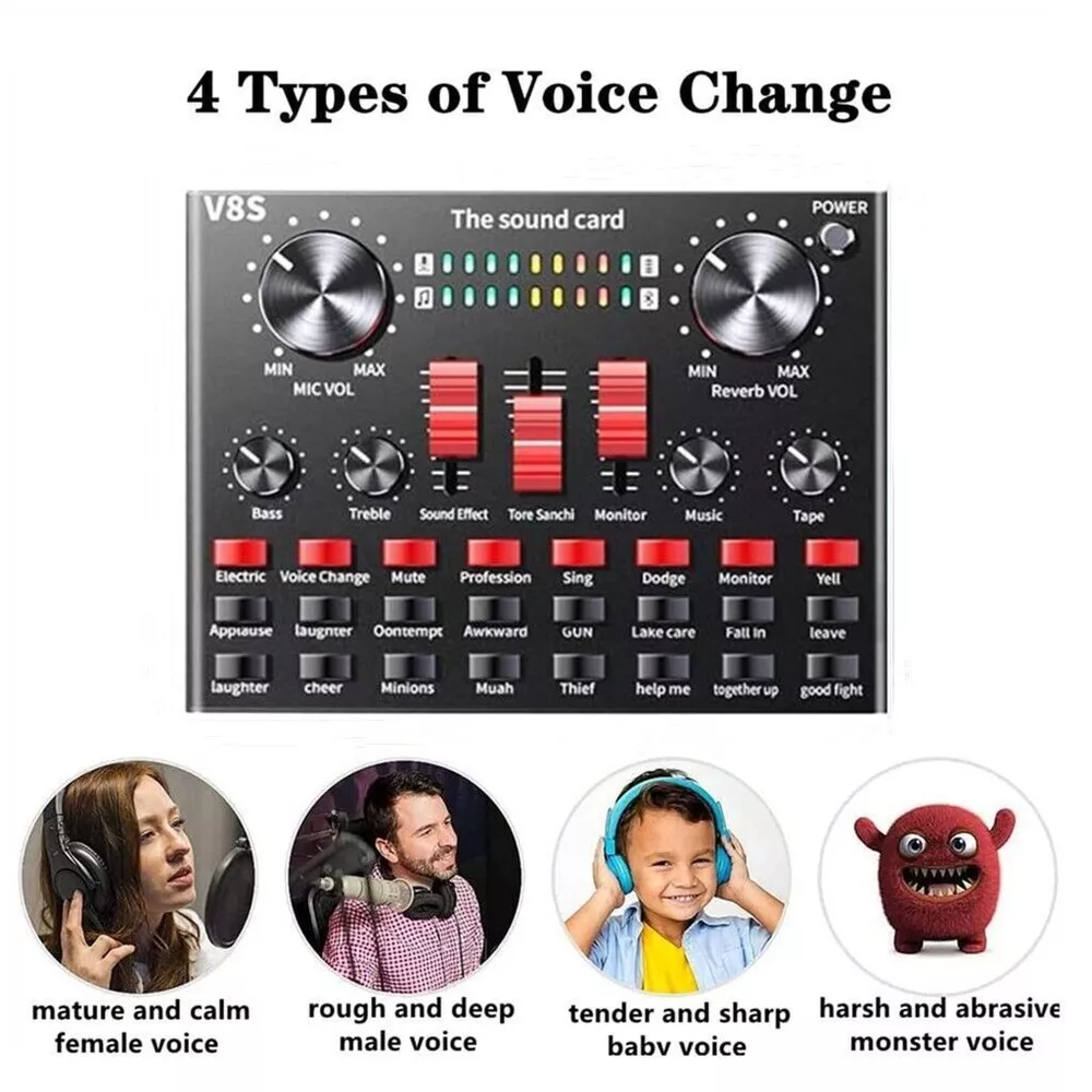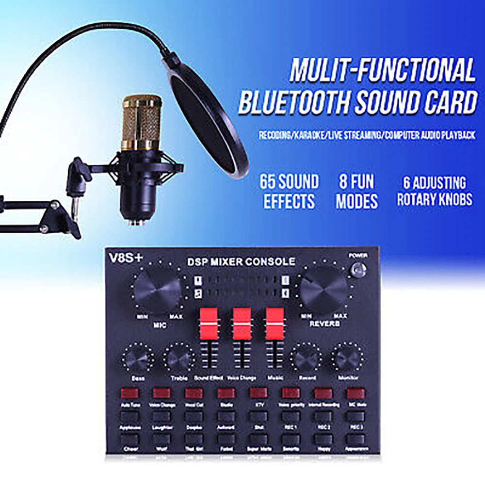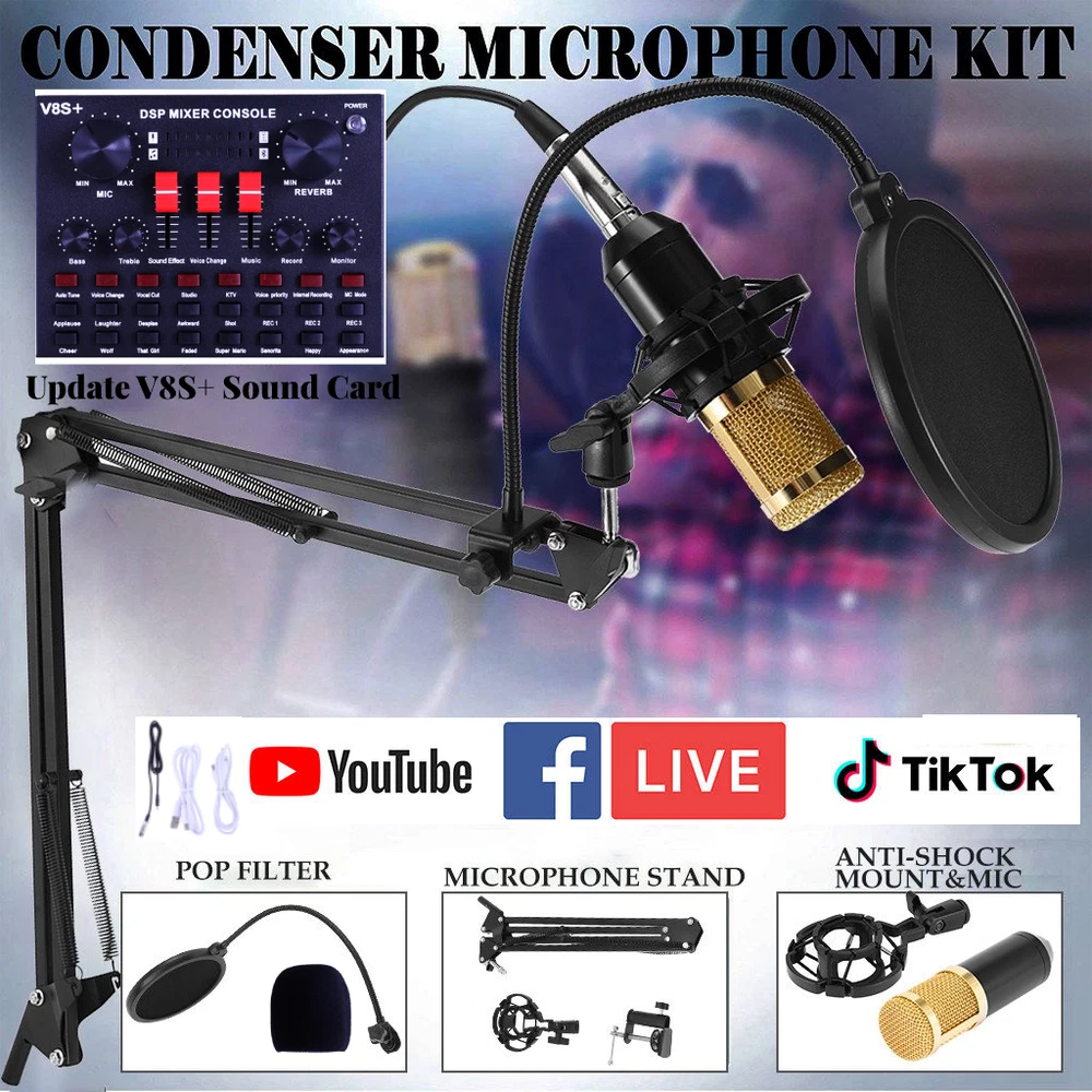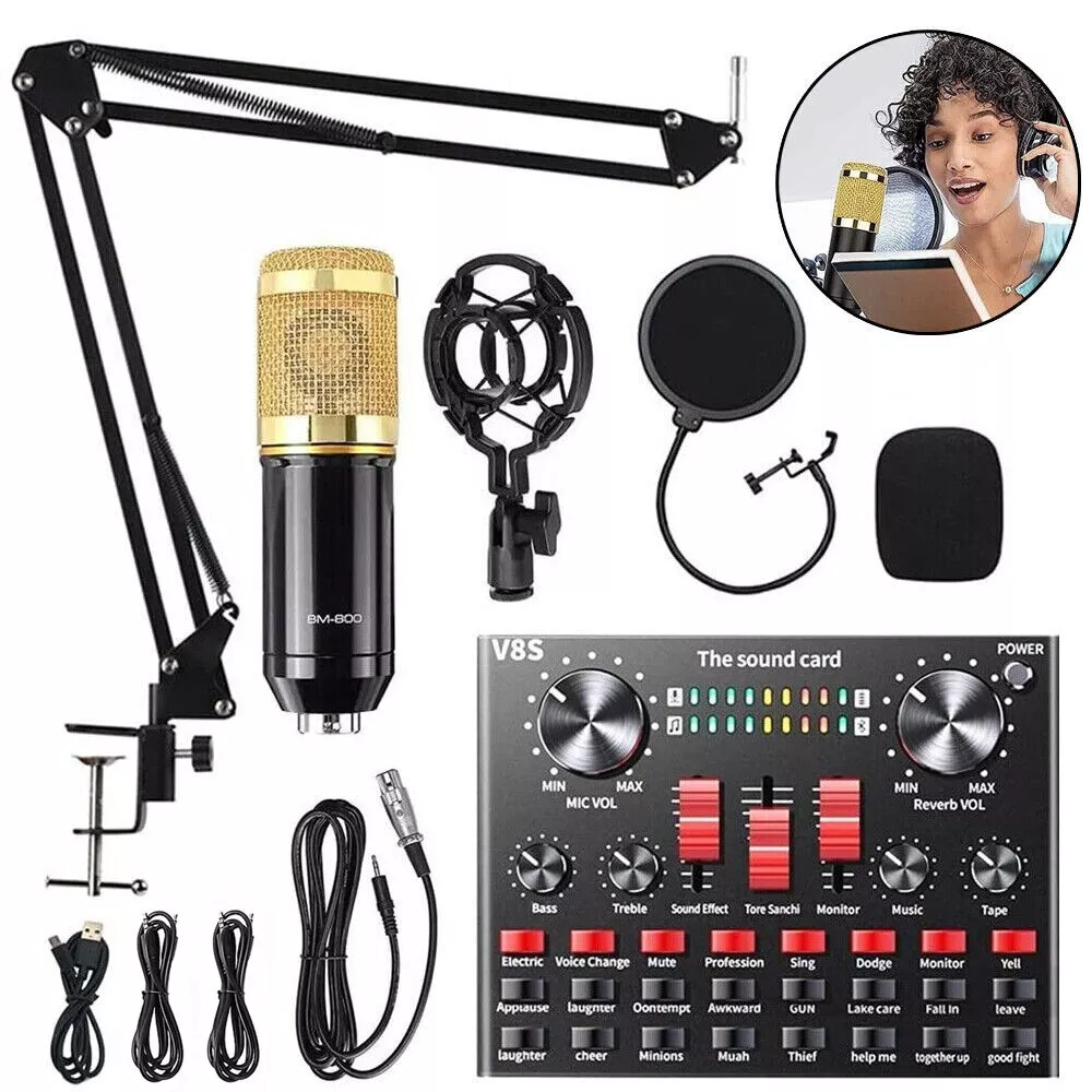 Complete Home Studio Recording Kit Mixer Condenser Microphone for Music Podcast Description: High-performance microphones are designed to deliver clear, high-quality sound for memorable recordings. It can deliver warm, clear bass, detailed midrange, and a silky high end. It is ideal for vocals, musical instruments, podcasting, voiceovers, interviews, field recordings. Suitable for studios, recording studios, broadcasting stations, personal broadcast, adage performance and computers. Feature: -The sound card includes 65 sound effects, 8 fun modes and 6 adjusting rotary knobs. -With BT function, two live and one accompaniment after connecting three phones. -It is the indicator light when sound enters. When it is not singing, it is the breathing light. -One button to eliminate the original sound, intelligent dodge. -Equipped with DSP intelligent noise reduction chip, low power consumption, stereo sound. -Built-in rechargeable polymer lithium battery, it is long-lasting. -The microphone cover prevents wind noise while you are recording. -The double-layer filter with double-layer nylon mesh construction can effectively remove plosive sound in the recording. -The shockproof mount can securely hold the microphone and effectively reduce handling noise. -Universal function, support singing, live streaming, recording, music and other multi-function. Support mainstream live streaming software. Specification: Material: Metal Color: Black + Gold, Black BT Protocol: 2.1 Channel: 5.1 S/N Ratio: > 95dB Frequency Response: 20Hz-20KHz ±3dB Distortion: 0.3% (1KHz, A weighting) Package Contents: -1*V8S Live Sound Card -1*BM-800 Condenser Microphone -1*Adjustable Microphone Stand -1*Nylon Filter -1*Faux-plastic Shock Mount -1*Microphone Windscreen -1*USB 3.5mm Charging Cable -1*USB 3.5mm Accompaniment Cable -1*USB 3.5mm Live Cable -2*English Manual Instruction Note: 1. Please allow 0.5-1cm differences due to manual measurement. 2. Due to the light and screen difference, the item's color may be slightly different from the pictures. Brand Unbranded Form Factor Microphone Kit Transducer Type Condenser Diaphragm Size Medium Suitable For Studio Recording, Live Performance, Home Recording MPN Does Not Apply Color Black + Gold, Black Connectivity 3.5 mm (1/8 in) TRS, Bluetooth Features Adjustable Stand, Built-in Headphone Jack, High Sensitivity, Integrated Digital Converter, Mix Control, Noise Cancellation, Plug and Play Material Metal BT Protocol 2.1 Channel 5.1 Working Voltage 3.3V-4.2V Charge Voltage 5V±5% Charge Current 500mAh max S/N Ratio >95dB Frequency Response 20Hz-20KHz ±3dB Distortion 0.3% (1KHz, A weighting) Battery 2000mAh Form Factor1 Scissor Arm Stand Type Desktop Microphone Microphone Form Factor Hanging Microphone Instrument Guitar/Piano/Drum/Harmonica Features1 Noise Cancellation, Mountable, On/Off Switch