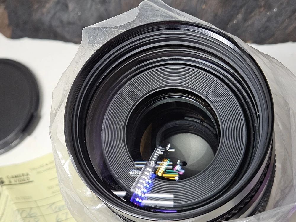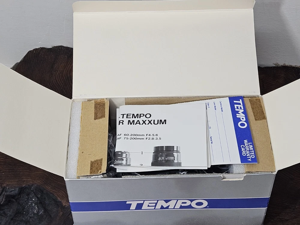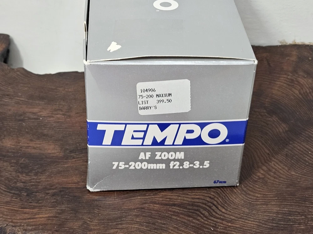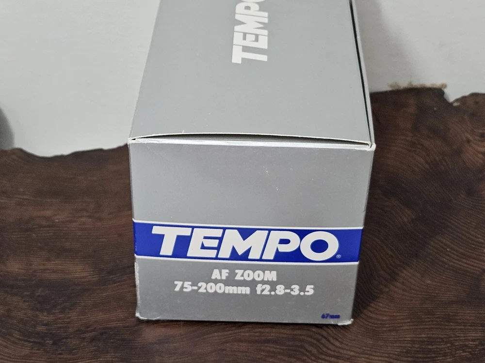 This is a Tempo zoom lens with a focal length of 75-200mm and a maximum aperture of f/3.5. It has auto focus and is mountable on a Maxxum AF camera. The lens comes complete in its original box with a 67mm UV filter included.