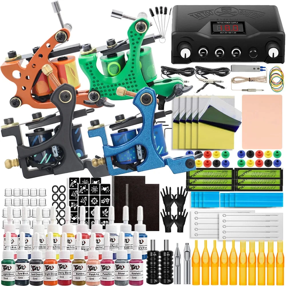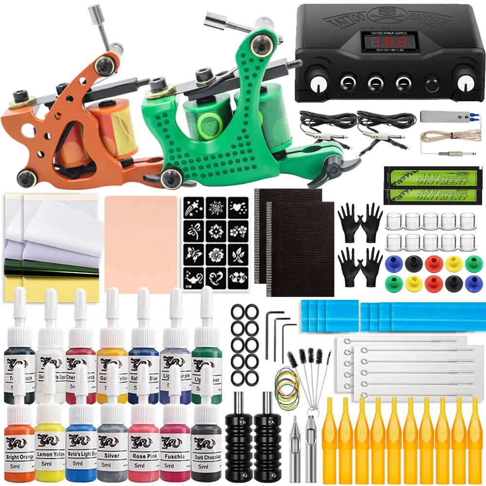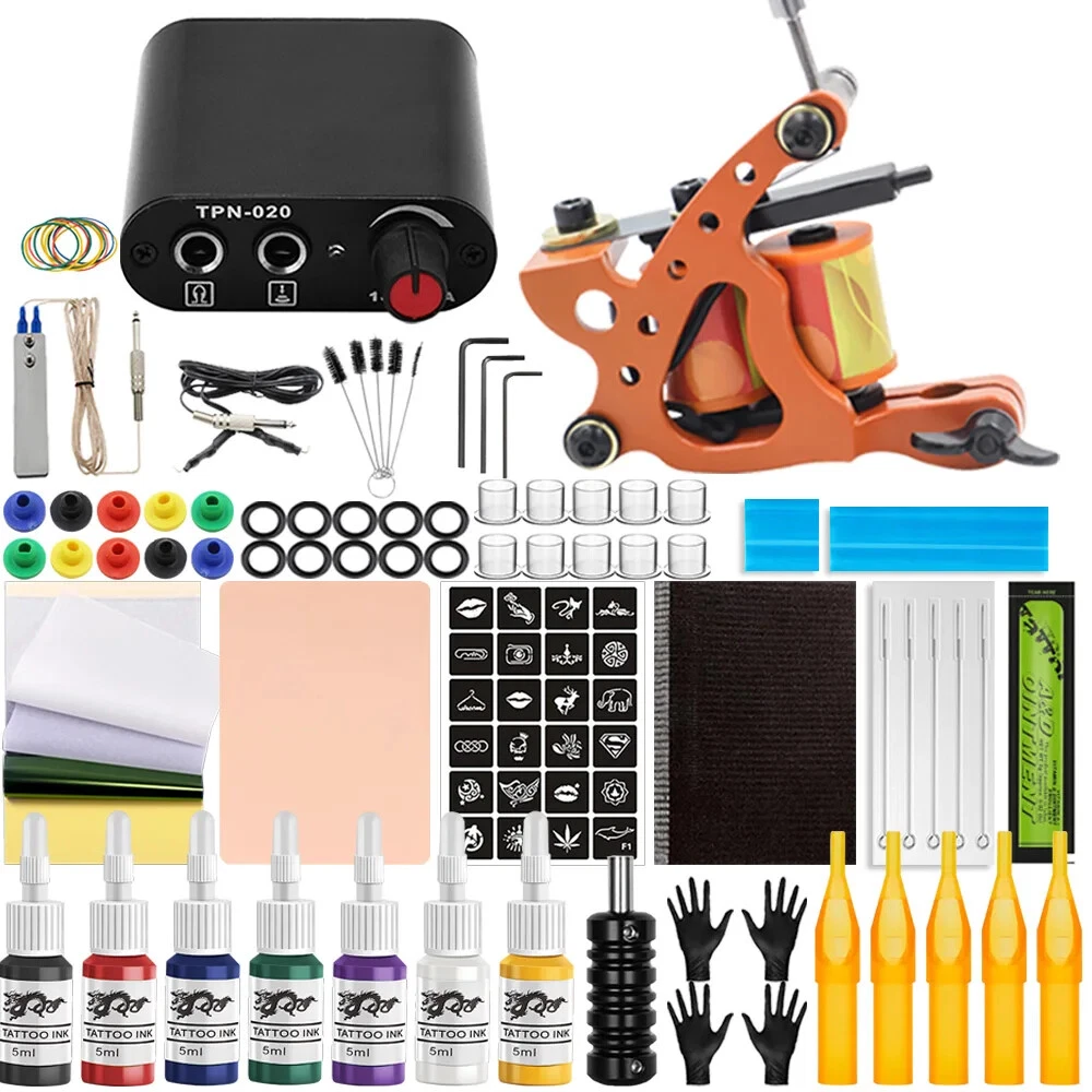 Complete Coils Tattoo Machine Kit Rotary Tattoo Gun Machine Kit Liner Shader Machine Set With Tattoo Needles Tattoo Beginner Set Tattoo Coil Machine Gun and Needles -- Type: Coil Tattoo Machine -- Material: Alloy -- Coil: 10 Warps Coils -- Color: Black/Orange/Red/Green -- Condition: 100% New -- Needle: Tattoo needles -- Diameter: 0.35mm --Needles Size: 1205RL 1205M1 Tattoo Power Supply Tattoo power Supply A: Item Type: Tattoo Power Supply Material: ABS Plastic Color: Black Output voltage: 1.5V - 18V Size: Approx. 7.1*3.6*11cm Package Weight: Approx. 319g Tattoo power Supply B: Type: Mini Tattoo Power Supply Shell Material: Metal Aluminum Color: Black, Red, Blue for Choice Rated input voltage: 100-240Vac 50/60Hz Input voltage range: 90-264Vac 50/60Hz Input current: 0.5Amax Output voltage: 0-18Vdc adjustable at will Output current: 1.5A (max) Operating Temperature -10ºC-- +40ºC Storage Temperature -20ºC~85ºC Relative Humidity 5%-95% Waves/Noises <100mV TIPES: Due to different monitors and light effects, the actual color may be slightly different from the picture color. Due to the different measuring tools,please allow a little error for the measurement data. If there is a problem with the product, please leave a message before leaving a negative review. We will definitely give you a satisfactory solution, thank you very much for your understanding. Type 1: Tattoo Kit A (4 Machines and 20Inks Kit ) 1) 4 x Coil Tattoo Machine (for lining and shading) 2) 1 x Tattoo Power Supply A (with plug) 3) 1 x Mini Tattoo Foot Pedal 4) 2 x Tattoo Clip Cord 5) 20 x Tattoo Inks 6) 2 x Aluminum Tattoo Grip (black) 7) 20 x Tattoo Ink Cups with Base (small and medium size) 8) 10 x Tattoo Needles (5RL/5M1) 9) 10 x Disposable Tattoo Tips (5RT/5FT) 10) 2 x Stainless Steel Tips (5RT/5FT) 11) 6 x (3pair) Tattoo Gloves 12) 10 x O-rings 13) 10 x Tattoo Rubber Nipples 14) 10 x Tattoo Rubber Bands 15) 3 x Allen keys Tool (3 different sizes) 16) 4 x Clip Cord Covers 17) 4 x Machine Covers 18) 6 x Tattoo Aftercare Creams 19) 5 x Brush 20) 2 x Tattoo Practice Skin 21) 5 x Transfer Paper 22) 2 x Tattoo Stencil (send by randomly) 23) 2 x Disposable Dental Bibs Type 2: Tattoo Kit B (2 Machines and 14Inks Kit ) 1) 2 x Coil Tattoo Machine (for lining and shading) 2) 1 x Tattoo Power Supply A (with plug) 3) 1 x Mini Tattoo Foot Pedal 4) 2 x Tattoo Clip Cord 5) 14 x Tattoo Inks 6) 2 x Aluminum Tattoo Grip (black) 7) 10 x Tattoo Ink Cups with Base (small size) 8) 10 x Tattoo Needles (5RL/5M1) 9) 10 x Disposable Tattoo Tips (5RT/5FT) 10) 2 x Stainless Steel Tips (5RT/5FT) 11) 4 x (2pair) Tattoo Gloves 12) 10 x O-rings 13) 10 x Tattoo Rubber Nipples 14) 10 x Tattoo Rubber Bands 15) 3 x Allen keys Tool (3 different sizes) 16) 4 x Clip Cord Covers 17) 4 x Machine Covers 18) 2 x Tattoo Aftercare Creams 19) 5 x Brush 20) 1 x Tattoo Practice Skin 21) 2 x Transfer Paper 22) 1 x Tattoo Stencil (send by randomly) 23) 2 x Disposable Dental Bibs Type 3: Tattoo Kit C (1 Machine and 7inks Kit ) 1) 1 x Coil Tattoo Machine (for lining or shading) 2) 1 x Tattoo Power Supply B (with plug) 3) 1 x Mini Tattoo Foot Pedal 4) 1 x Tattoo Clip Cord 5) 7 x Tattoo Inks 6) 1 x Aluminum Tattoo Grip (black) 7) 10 x Tattoo Ink Cups with Base (small size) 8) 10 x Tattoo Needles (5RL) 9) 10 x Disposable Tattoo Tips (5RT) 10) 4 x (2pair) Tattoo Gloves 11) 10 x O-rings 12) 10 x Tattoo Rubber Nipples 13) 10 x Tattoo Rubber Bands 14) 3 x Allen keys Tool (3 different sizes) 15) 1 x Clip Cord Covers 16) 1 x Machine Covers 17) 1 x Tattoo Aftercare Creams 18) 5 x Brush 19) 1 x Tattoo Practice Skin 20) 1 x Transfer Paper 21) 1 x Tattoo Stencil (send by randomly) 22) 1 x Disposable Dental Bibs Type 4: Tattoo Kit D (1 Machine and No Ink Kit ) 1) 1 x Coil Tattoo Machine (for lining or shading) 2) 1 x Aluminum Tattoo Grip (black) 3) 10 x Tattoo Ink Cups with Base (small size) 4) 5 x Tattoo Needles (5RL) 5) 5 x Disposable Tattoo Tips (5RT) 6) 4 x (2pair) Tattoo Gloves 7) 10 x O-rings 8) 10 x Tattoo Rubber Nipples 9) 10 x Tattoo Rubber Bands 10) 3 x Allen keys Tool (3 different sizes) 11) 5 x Brush 12) 1 x Transfer Paper 13) 1 x Tattoo Stencil (send by randomly) 14) 1 x Disposable Dental Bibs