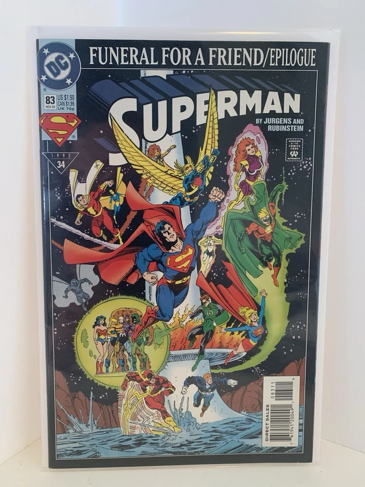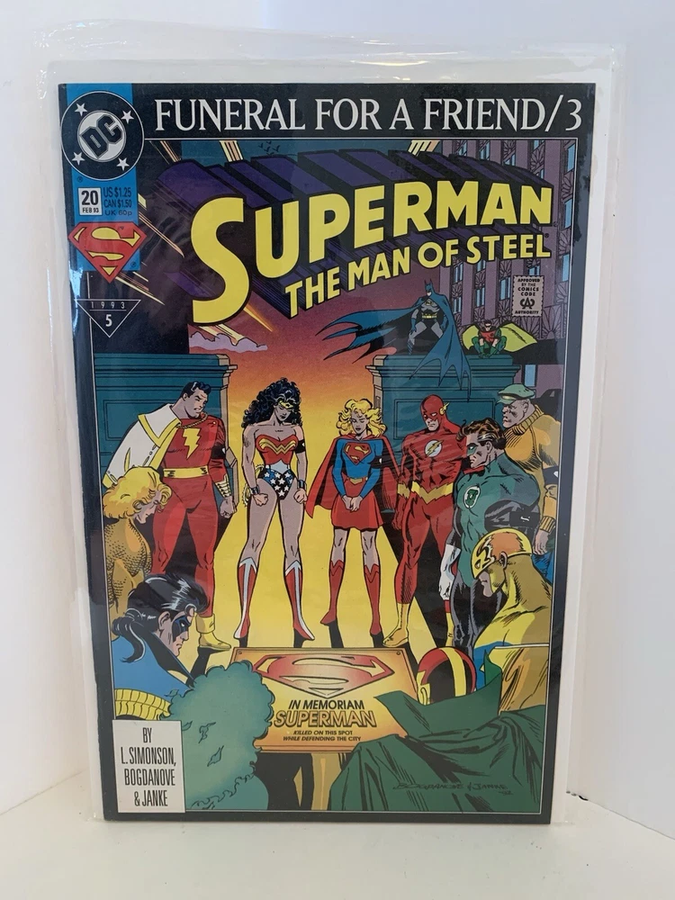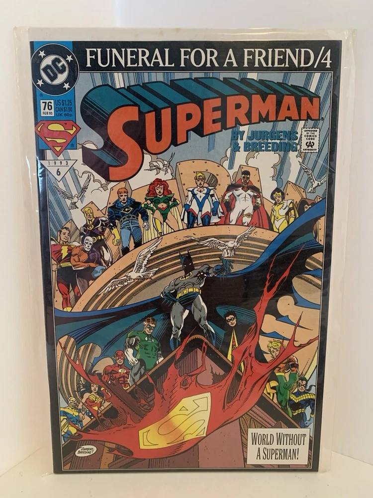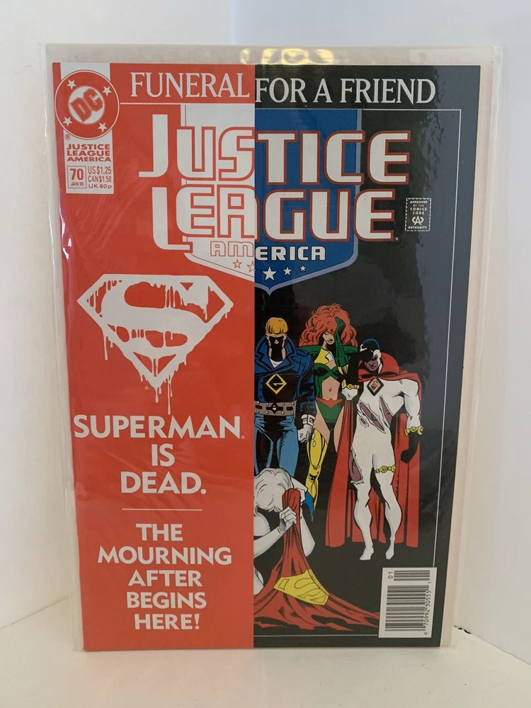 Main Character: Superman Era: Modern Age (1992-Now) Story Title: Funeral For A Friend Style: Color Type: Comic Book Genre: Superhero Artist/Writer: Dan Jurgens, Tom Grummett Superhero Team: Justice League of America Series: Superman Universe: DC Universe Publication Year: 1993 Character: Superman (Clark Kent), Supergirl (Kara Zor-El), Wonder Woman (Diana), Shazam, Flash (Barry Allen), Green Lantern (Hal Jordan), Batman (Bruce Wayne), Aquaman (Arthur Curry), Robin (Tim Drake) Publisher: DC Issue Number: 70 Unit of Sale: Comic Book Lot Features: Set Series Title: JLA Tradition: US Comics