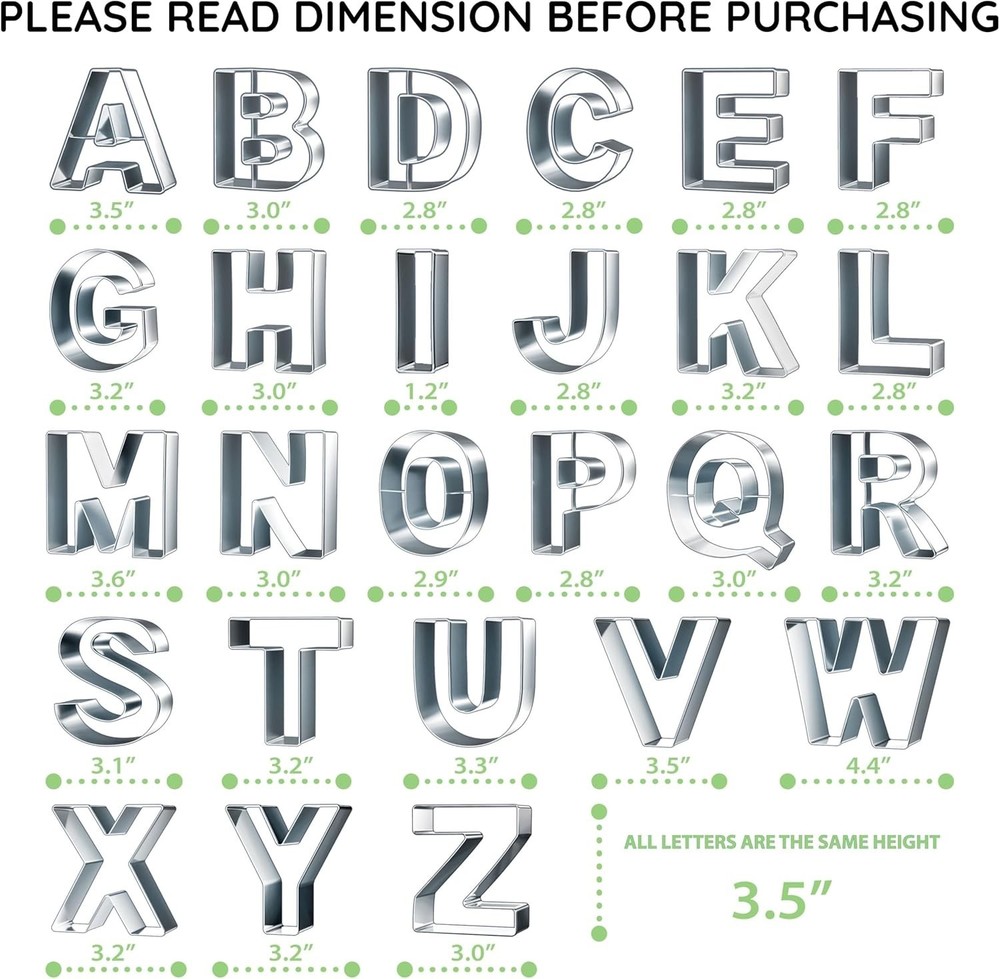 Complete Set of 26 Stainless Steel Alphabet Cookie Cutters - Easy to Clean & Use ‹ › ‹ › ‹ › ‹ › ‹ › ‹ › ‹ › ‹ › Complete Set of 26 Stainless Steel Alphabet Cookie Cutters Your new kitchen essential is here! This Complete Set of 26 Alphabet Cookie Cutters combines durability with style, ensuring you can create stunning, custom treats effortlessly. Features: Size: Each cookie cutter measures 3.5 inches in height, offering the perfect size for impressive cookie designs. Durable Material: Manufactured from high-quality stainless steel, these cookie cutters promise longevity and resistance to rust. Complete Alphabet Set: This set includes all letters of the English alphabet, providing you with limitless possibilities for any occasion. Versatile Use: Ideal for shaping cookies, pastries, fondant, cakes, and even sliced fruits or desserts. Easy to Clean: Dishwasher safe for hassle-free cleaning, ensuring you spend less time on cleanup and more on enjoying your creations. Includes Dough Scraper: Efficiently measure and cut dough with the dough scraper included, simplifying the baking process. Benefits: Create personalized cookies for birthdays, anniversaries, graduations, holidays, and other memorable occasions. Enhance your baking experience with professional-quality tools designed for both novice and experienced bakers. Effortlessly make special treats that impress friends and family during celebrations or gatherings. Why Choose Our Alphabet Cookie Cutters? Whether you’re planning a fun birthday party or simply creating delicious treats at home, our Complete Set of 26 Stainless Steel Alphabet Cookie Cutters is indispensable in your kitchen. Each cutter is designed for strength and ease of use, making your cookie decorating endeavors both enjoyable and rewarding. No matter the occasion, express yourself and delight your guests with scrumptious cookies shaped with love. Order your set today and start crafting delightful cookies that spell out your creativity! Shipping Free & Fast Shipping - We offer free shipping to most of the USA with a normal delivery time of 3-7 days. However, due to the current situation, additional delivery time (up to 3 weeks) may be required for some items. Alternative Carriers - We may use alternative carriers (e.g. USPS, FedEx, UPS, etc.) to ensure your package arrives safely and on time. Due to the use of multiple carriers, we are unable to provide a tracking number automatically. Handling Time - Orders are processed and shipped within 1-2 business days of receiving cleared payment. Shipping Restrictions - Shipping to Alaska, Hawaii, Puerto Rico, Guam, and other US territories may incur shipping charges or delivery restrictions. Please contact us before ordering, or your order can be refunded/cancelled. State Restrictions - There may be restrictions based on your state of purchase. For example, certain items may not be shipped to California due to state regulations. Contact for Tracking Updates - If you require tracking updates or have any concerns about the delivery of your order, please feel free to contact us, and we will be happy to assist you. Return 30-Day Hassle-Free Returns - We want you to be completely satisfied with your purchase. If you are not, you can return the item within 30 days of receiving it for a full refund or exchange. Easy Return Process - To start a return, simply contact us and we will provide you with a prepaid return shipping label and detailed instructions. Restocking Fee - There are no restocking fees for returns. However, the buyer is responsible for return shipping costs if the return is not due to a seller's error. Refund Processing Time - Refunds will be processed within 5 business days of receiving the returned item in its condition. Payment We accept all major credit cards, PayPal, and Apple Pay for your convenience. Your payment information is secure and encrypted to ensure a safe and seamless transaction. Please complete your payment within 3 days of purchase to avoid any delays in shipping. Feedback Your feedback is extremely important to us. We strive to provide the best products and customer service possible. If you are satisfied with your purchase, please take a moment to leave us a positive review. If you have any concerns or issues with your order, please contact us before leaving negative feedback. We are committed to resolving any problems and ensuring your satisfaction. Contact Us If you have any questions or concerns, please feel free to out to our customer support team. You can contact us through the eBay messaging system. We are available Monday to Friday, 9:00 am to 5:00 pm EST, and we will do our best to respond to your inquiry within 24 hours. Buy it now and enjoy a pleasant shopping experience! Unit Quantity: 1.0 count Material: Stainless Steel Features: Dishwasher Safe,Easy Clean Type: Cookie Cutter Theme: Alphabet Occasion: All Occasions Shape: Alphabet Color: Silver Number in Pack: 26 Size: Large Item Depth: 3.5 in Item Diameter: 3.5 in