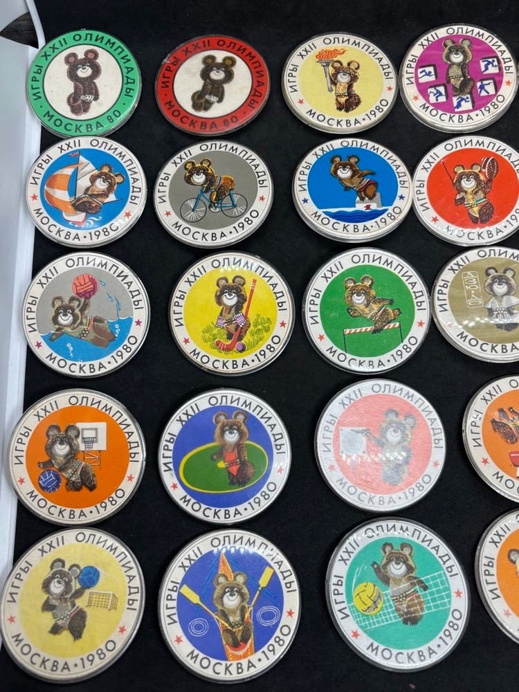 Complete set of 25 USSR badges, symbol of the 1980 Olympics "Olympic Bear" Значки в хорошем состоянии, застежки целые. Диаметр значка - 55 мм / 2 дюйма