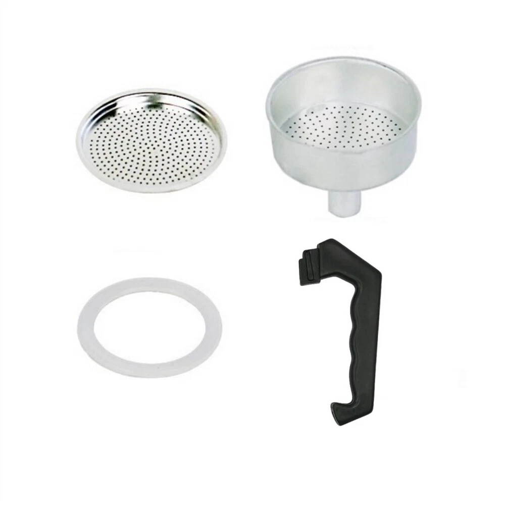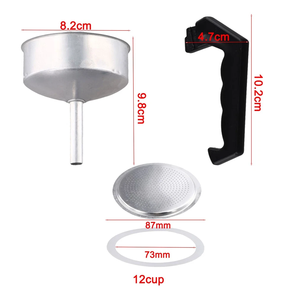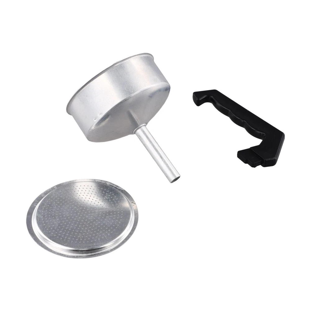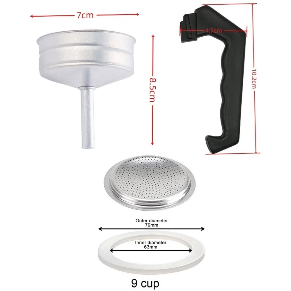 Product Description Features: *Function: Designed specifically for espresso pots, this coffee Moka pot accessories replacement is a perfect fit, optimal functionality. *Easy Installation: With its user-friendly design, this replacement handle can be easily installed without any hassle or complications. *Perfect Replacement: This set of replacement parts serves as the solution for your broken or worn-out espresso pot accessories, restoring their full functionality. *Multiple Sizes: Available in a range of sizes, including Cup, 3 Cups, 6 Cups, 9 Cups, and 12 Cups, to cater to your specific brewing needs and preferences. * and Reliable: Crafted with high-quality materials, these replacement parts are built to last, guaranteeing durability and reliable performance throughout extended use. Specifications: *Part Name: Mocha Pot Accessories Set *Material: Aluminum, Plastic *Size: Cup, 3 Cups, 6 Cups, 9 Cups, 12 Cups *Color: Silver+Black Package Content: handle*+ funnel*+ rubber ring*+ filter* Note: . The real color of the item may be slightly different from the pictures shown on website caused by many factors such as brightness of your monitor and light brightness. 2. Please allow slight manual measurement deviation for the data. Payment Payment must be completed within 5 days. If you have any problems about payment, please contact us via ebay message. Delivery details We only ship to confirmed ebay Order addresses. Please comfirm that your Order address is in line with your shipping address. Please kindly note that the c ombined shipping is not provided because the shipping fee is calculated by weight. Also, the each additional item means exactly the the same color and size. It takes about 7 -15 working days to US; about 10-30 working days to other countries. Transit time may be a little delayed because of the bad weather and customs inspection . If you do not receive your item within 30 working days since payment finished, please contact us immediately for further assistance. Contact us We strive for 100% customer satisfaction! Positive Feedback is very important to us. If you have any questions, p lease feel free to contact us via "Ask seller a question" . We will reply your email within 24 working hours.